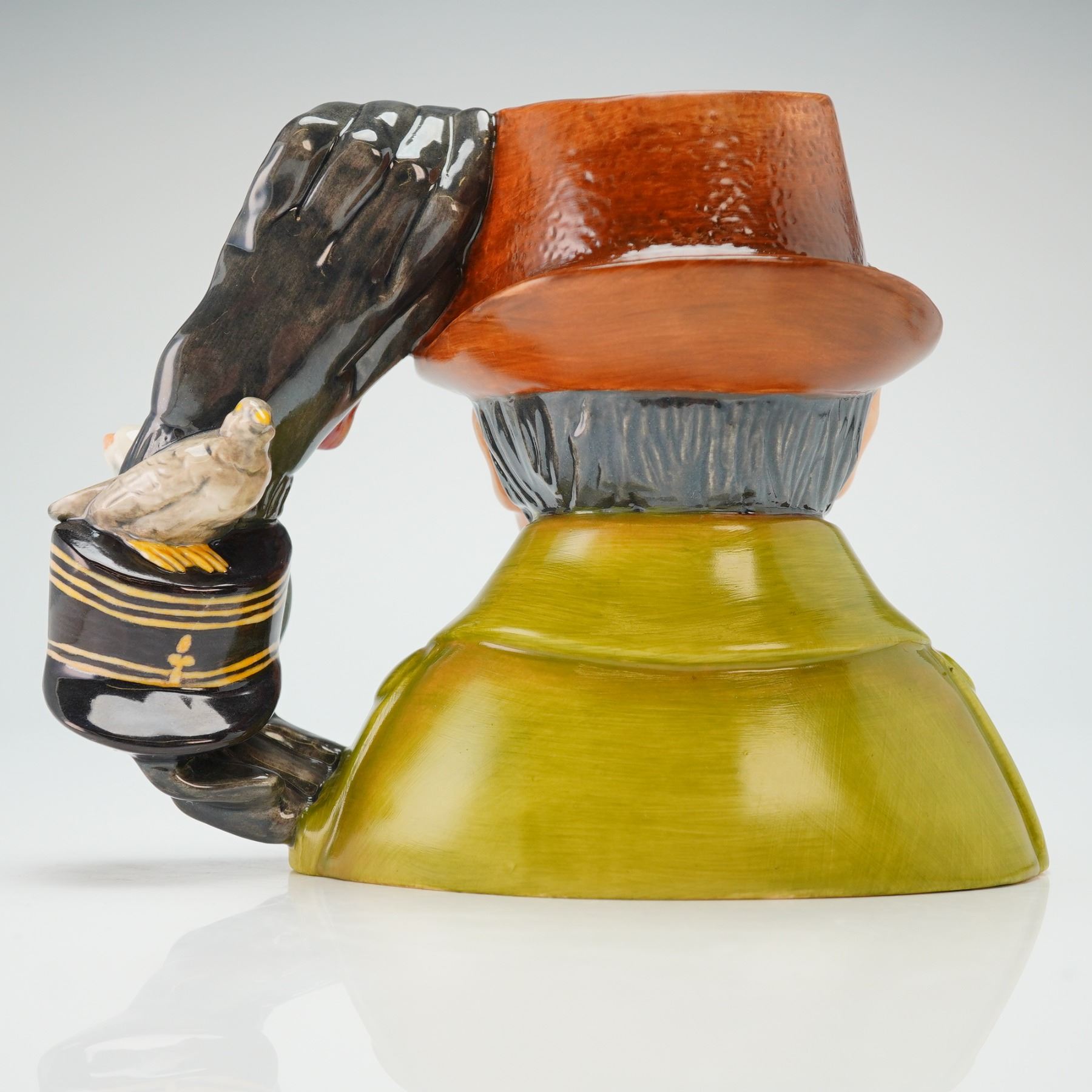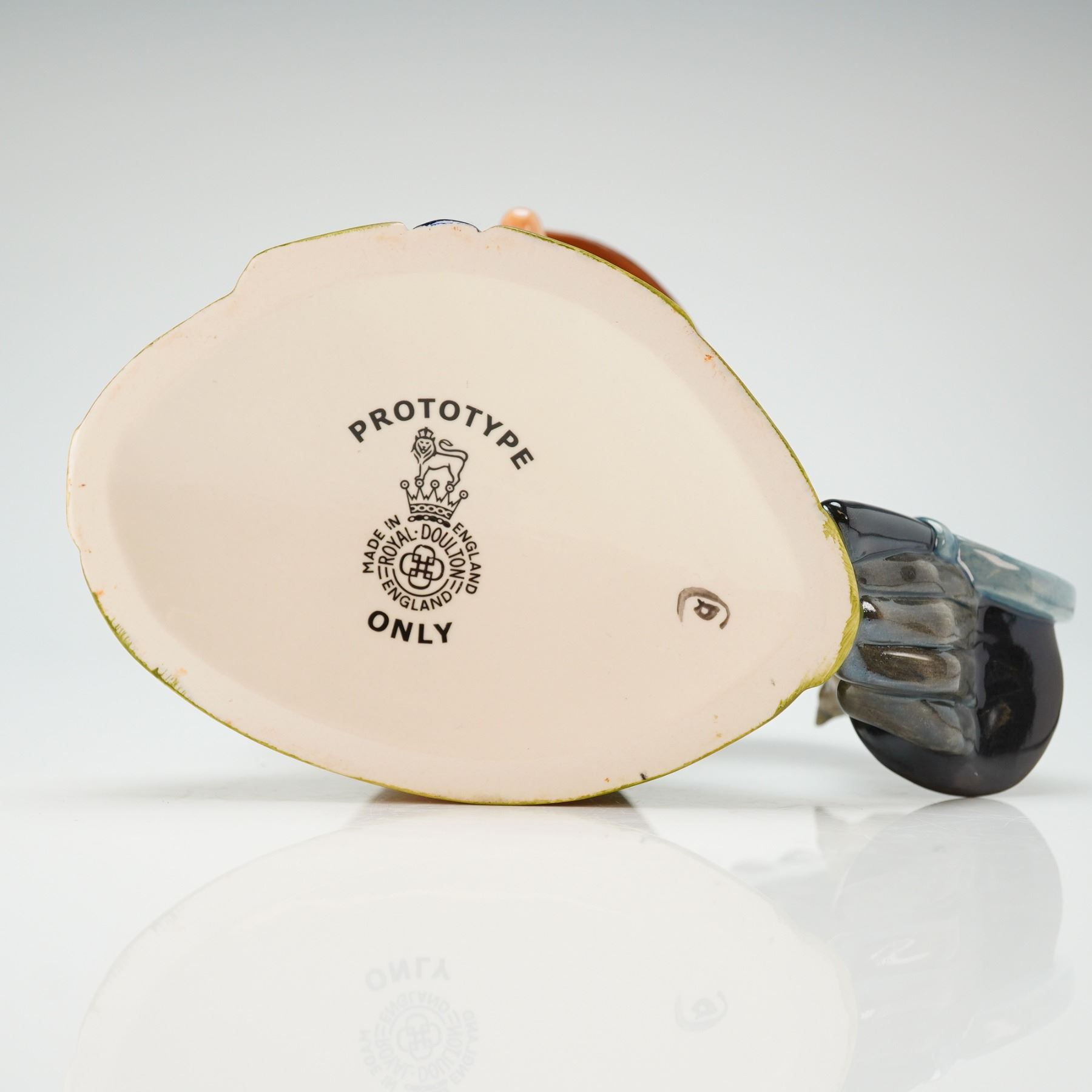 Molded as Inspector Jacques Clouseau from the "The Pink Panther" series, this character jug depicts the figure in an olive-green coat, a dark-blue tie, and a brown hat. The handle is modeled with a magnifying glass over paw prints, a secondary hat, a bird, and a figure with a bandaged head and leg. The underside features the official Royal Doulton "Prototype Only" backstamp.