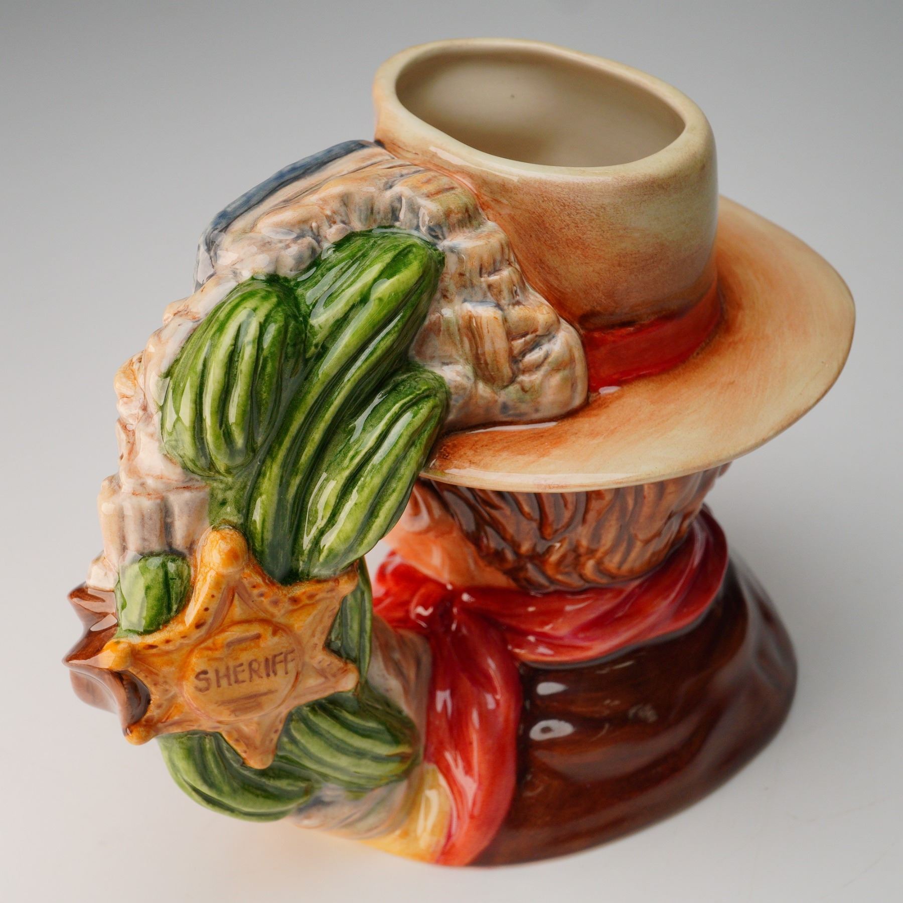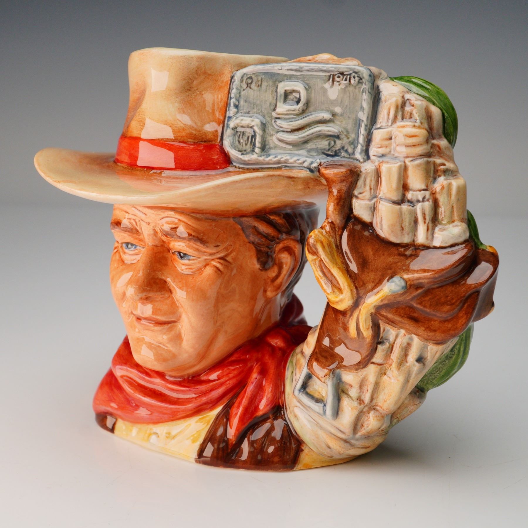 Rare Royal Doulton prototype character jug depicting John Wayne, in the small size. This prototype version was never released for general production, making it highly sought after by collectors. Featuring a finely detailed likeness of the iconic American actor in his signature cowboy hat and neckerchief, with the handle incorporating elements of Western imagery, including a saddle and branding iron. Hand-painted in rich, earthy tones with meticulous attention to detail. Royal Doulton backstamp. Measures 6.5"L x 5.5"H.