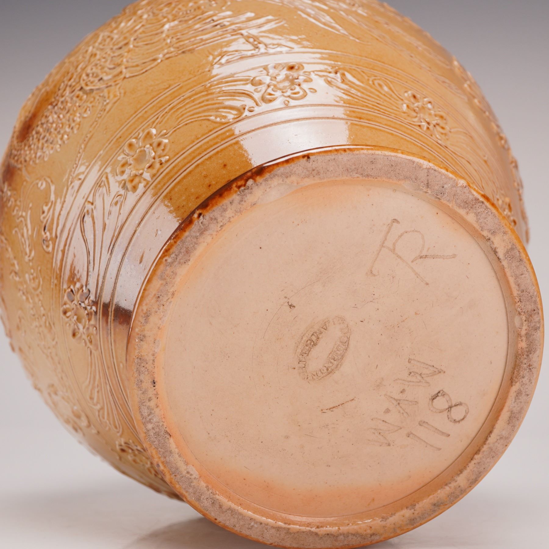 An English art pottery vase by Doulton Lambeth, designed by Mark V. Marshall. This pot formed stoneware example features a salt glazed finish in contrasting tones of light and dark brown. The body is decorated in relief with a circular cartouche depicting the allegorical figure of Justice, shown blindfolded and kneeling while holding the Scales of Justice. Surrounding the central scene are modeled floral and foliate motifs that extend outward, culminating in a bird interpreted as either a peacock or phoenix, both symbols historically associated with justice and virtue. The shoulder and neck are rendered in a deeper brown glaze and further embellished with raised floral and foliate ornamentation, completing the richly textured design. The underside is marked with the Doulton Lambeth impressed stamp and the Mark V. Marshall monogram.