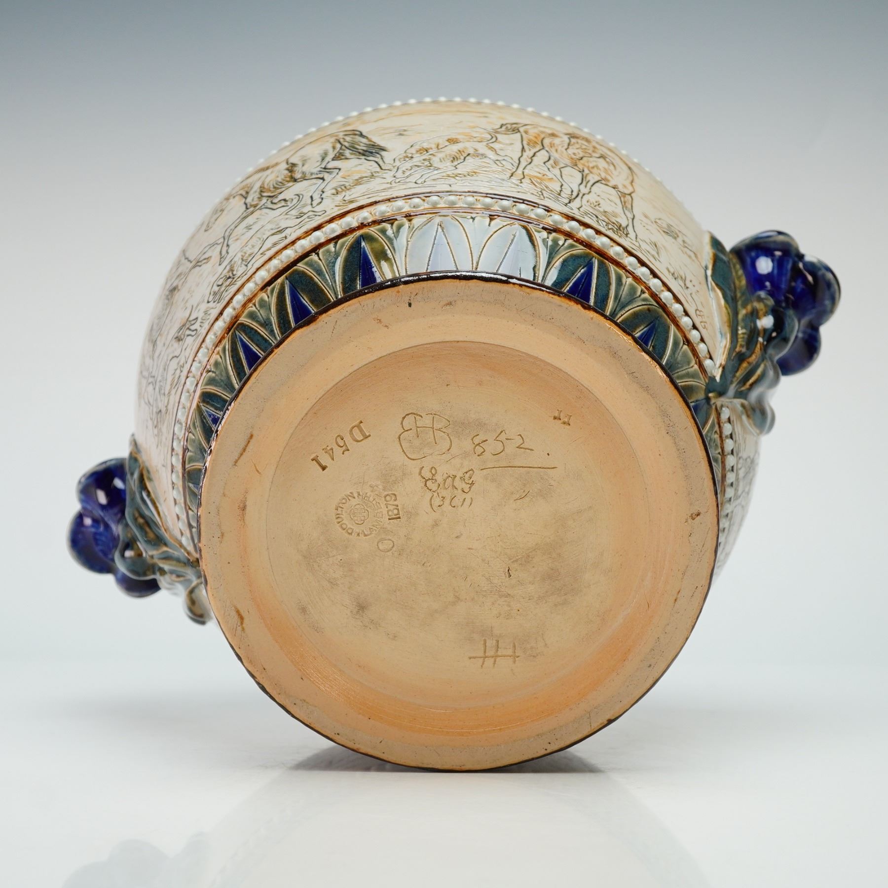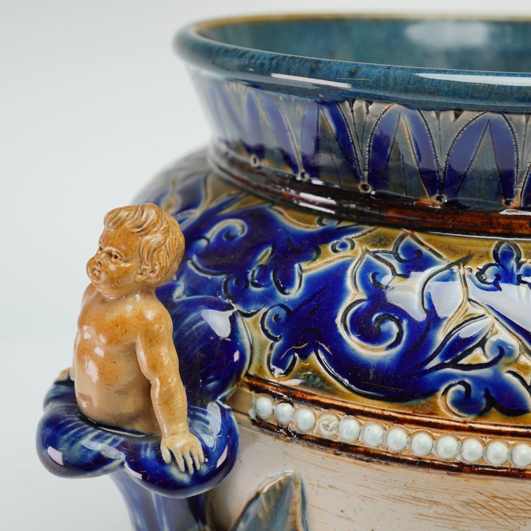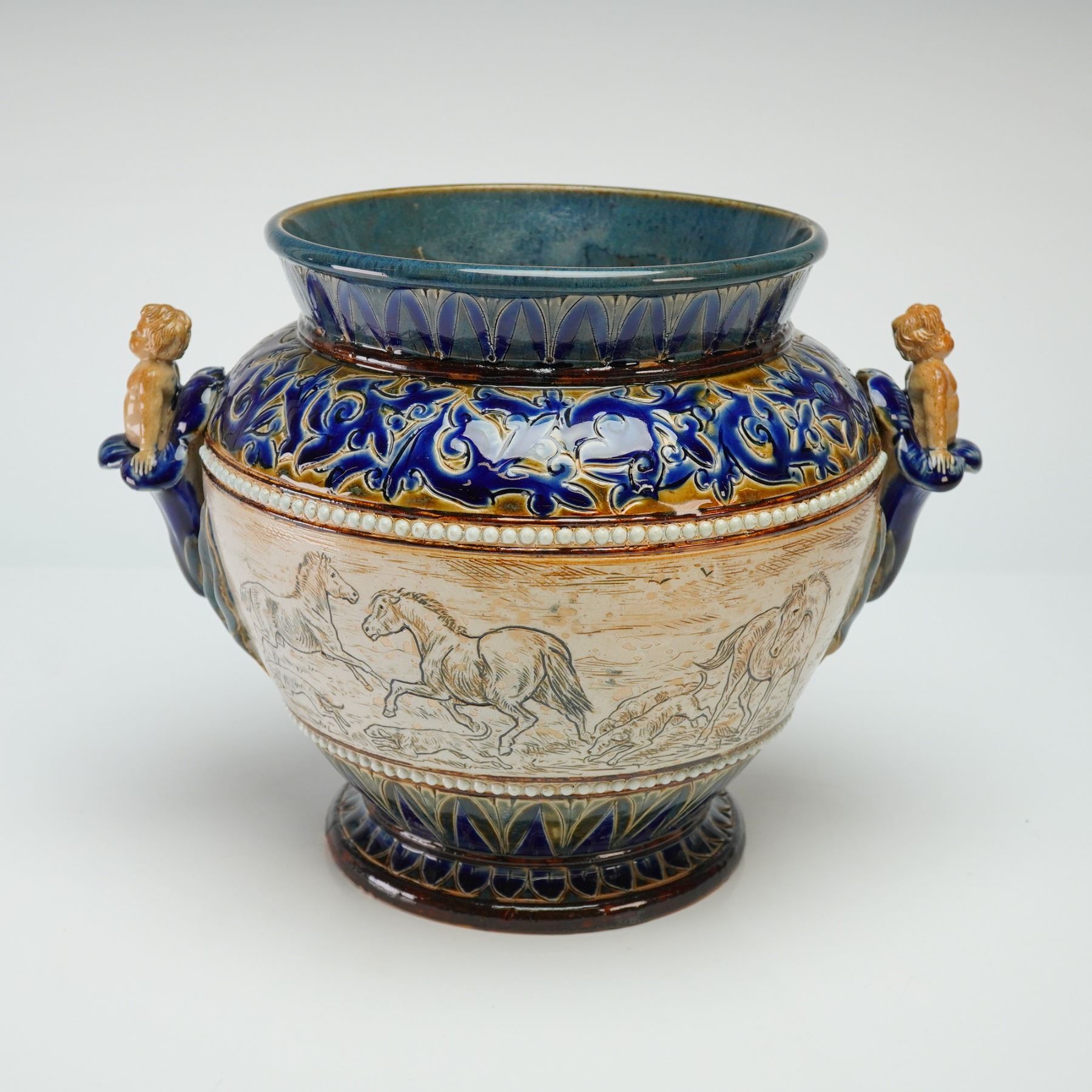 English, late 19th century, the vase fitted with two handles formed as nude putti inside blue-glazed tulip flowers. The body centered by an incised pastoral band depicting horses and dogs, bordered above and below by applied white beaded relief. The foot, shoulder, and neck decorated in Art Nouveau style foliate and floral motifs in blue and khaki glazes. The underside bearing a Doulton Lambeth impressed stamp and the artist's initials.