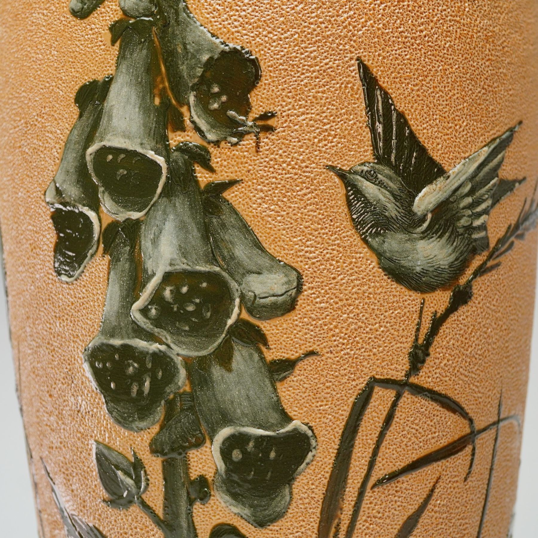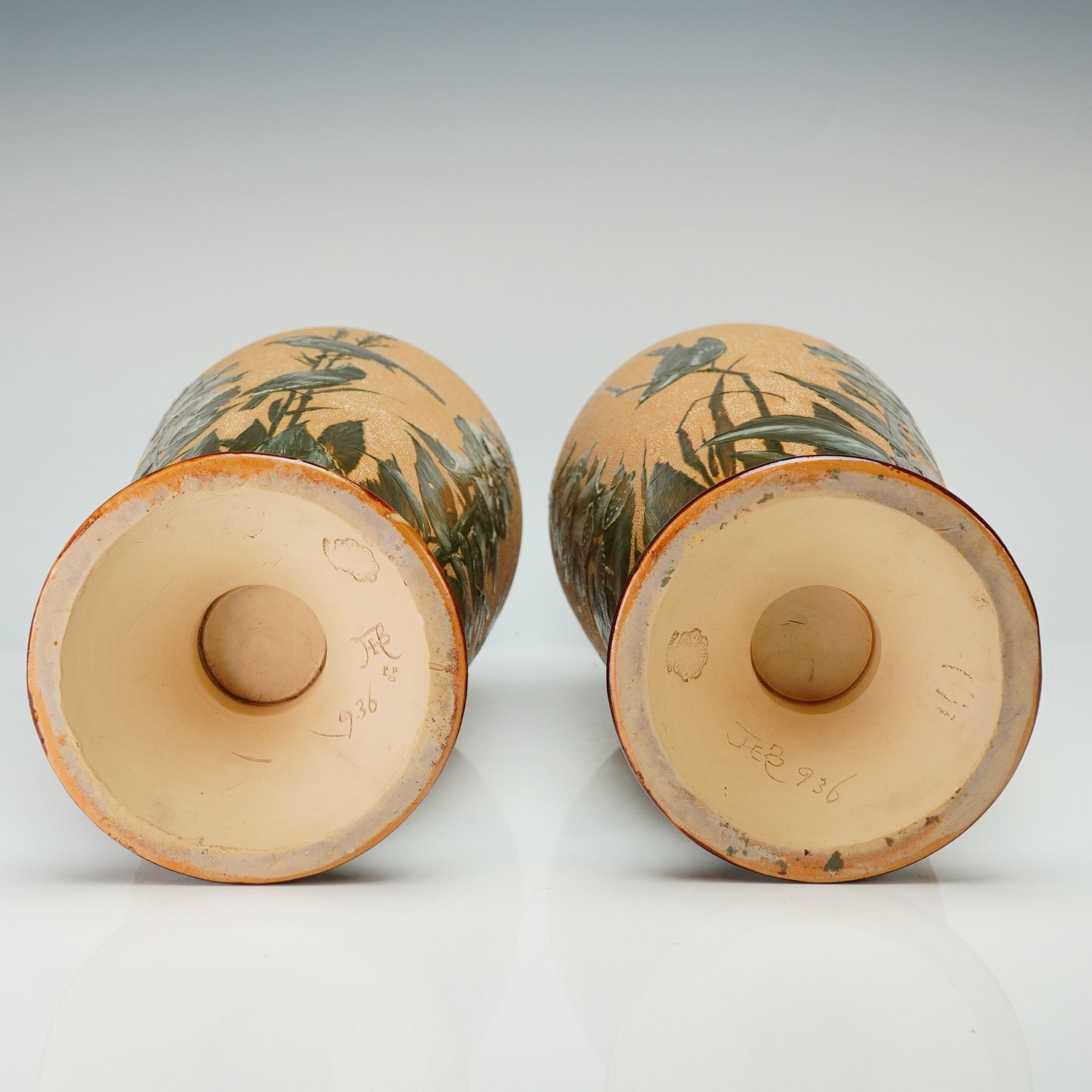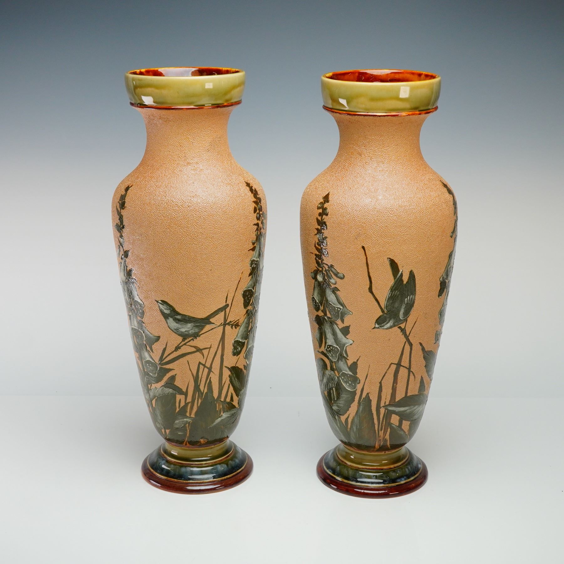 Two English stoneware vases with textured grounds, each decorated with a pate-sur-pate scene of birds perched among foxglove flowers. The feet finished in glossy green, gray, and brown glazes, and the rims in glossy green and brown glazes. The undersides impressed with Doulton Lambeth marks and bearing the initials of Florence E. Barlow.