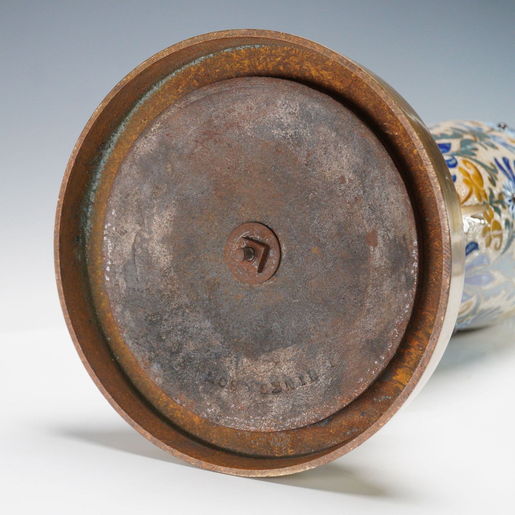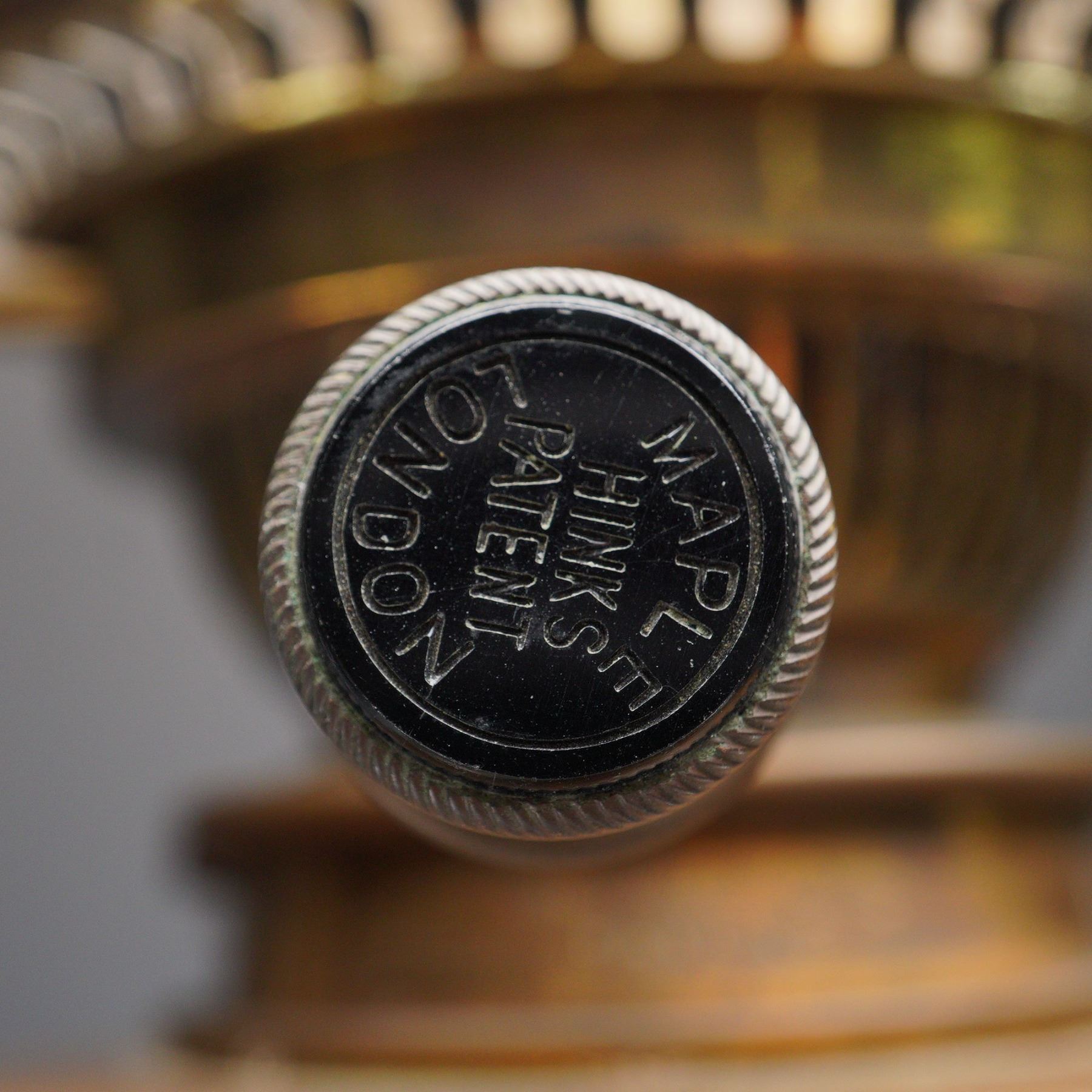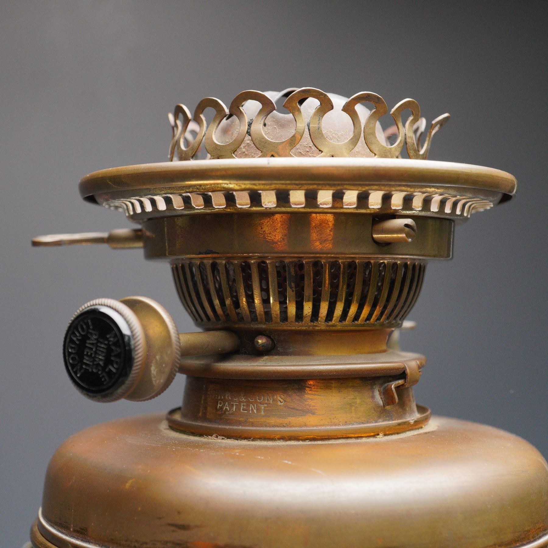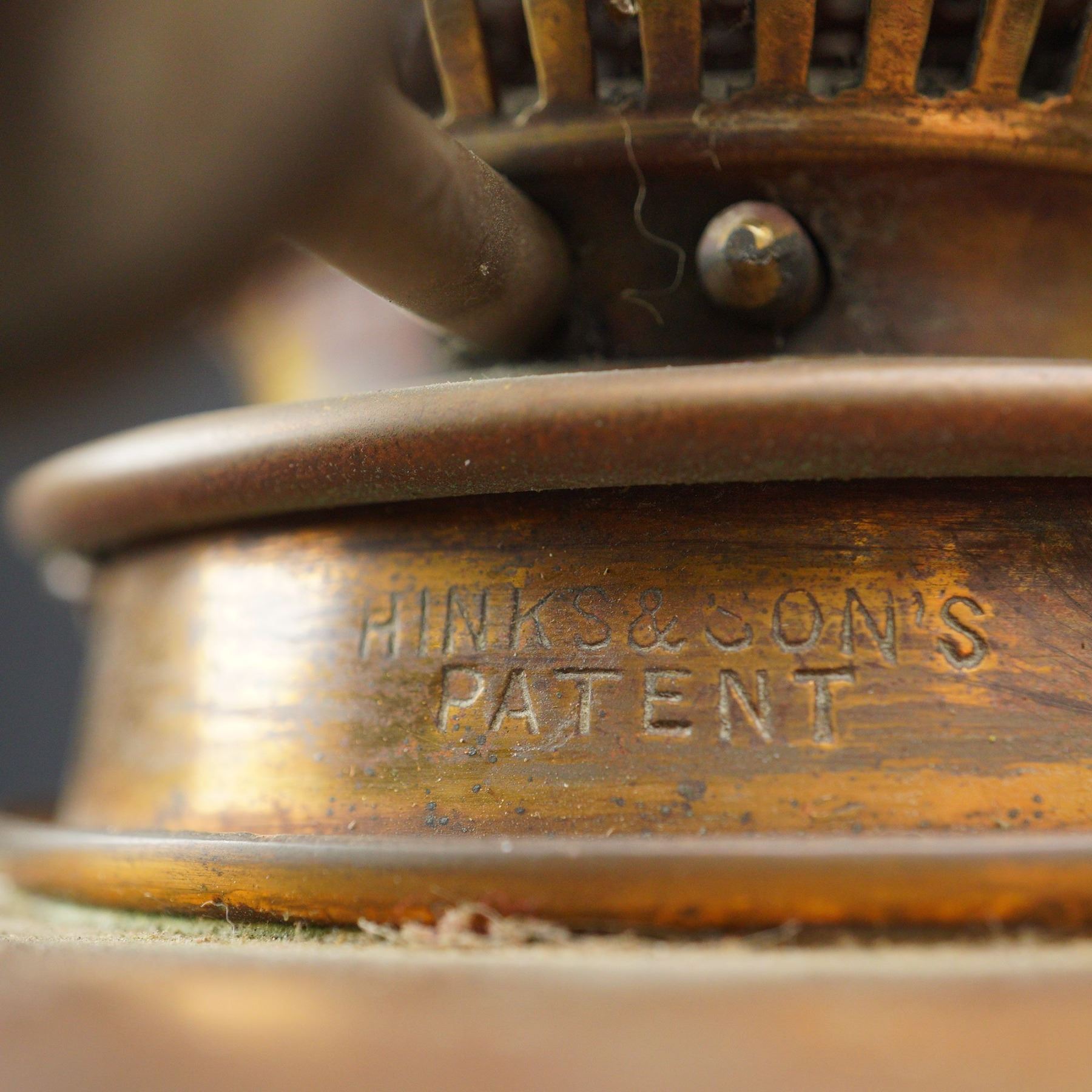 Impressive and large, stoneware oil lamp within a polished brass base, by Hinks and Sons London. This Victorian lamp of tapering baluster body richly decorated in relief with scrolling foliate panels in cobalt, ochre, and teal against a stippled ground. Brass mount and burner marked "Hinks and Sons".