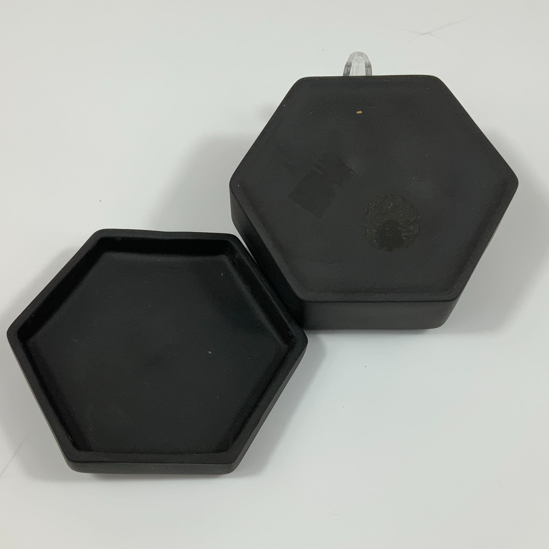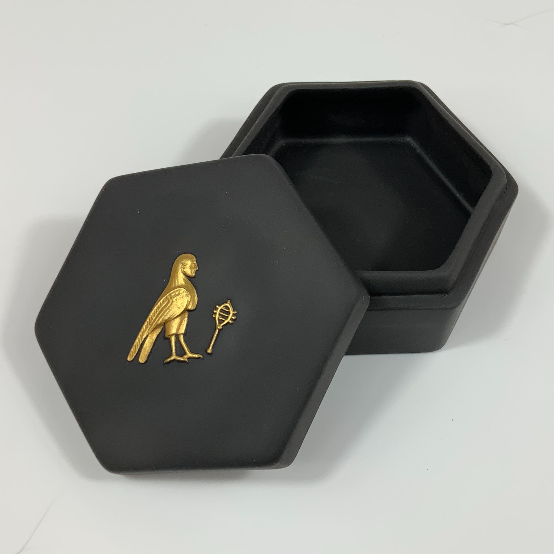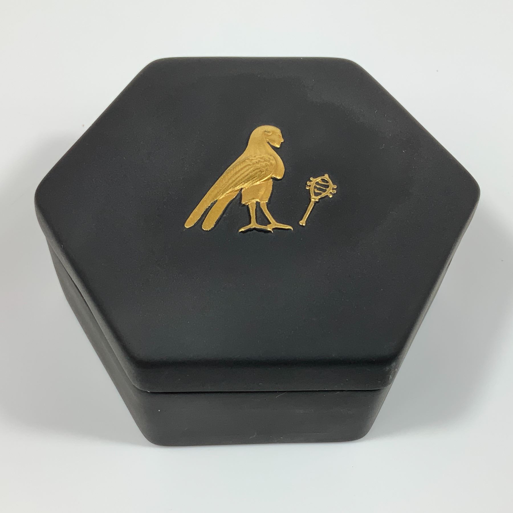 This Wedgwood black basalt and jasperware trinket box is designed in a hexagonal form with a flush-fitting lid. The item is crafted from matte, fine-grained black stoneware. The lid features a gilded relief motif in the Egyptian Revival style, depicting a Ba-bird, a mythological figure with a human head and bird body, adjacent to a sistrum instrument. The interior and exterior of the box have a uniform matte black finish. No factory marks or impressed signatures are visible on the base.