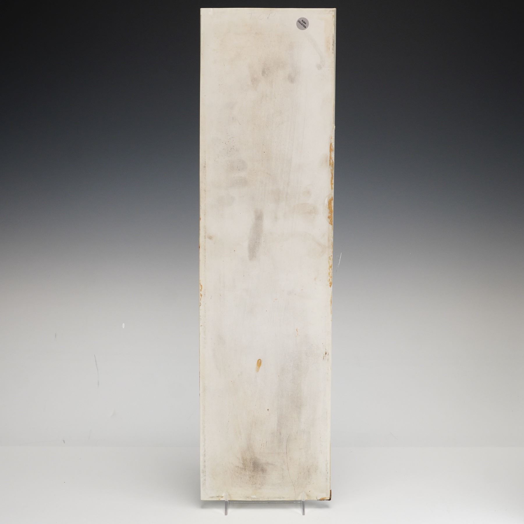 This tall rectangular vertical plaque is a product of Wedgwood, manufactured in Staffordshire, England. The piece is composed of matte sage green jasperware stoneware. The primary decoration consists of applied white relief sprigging in a classical foliate motif, featuring a vertical series of scrolling acanthus leaves and floral buds that end in a symmetrical acanthus leaf arrangement at the base. The reverse is impressed with the maker mark WEDGWOOD and the initials T. L. A small circular collection sticker is present on the reverse, printed with RUBIN COLLECTION. This item is identified in records as ww plaque rubib.