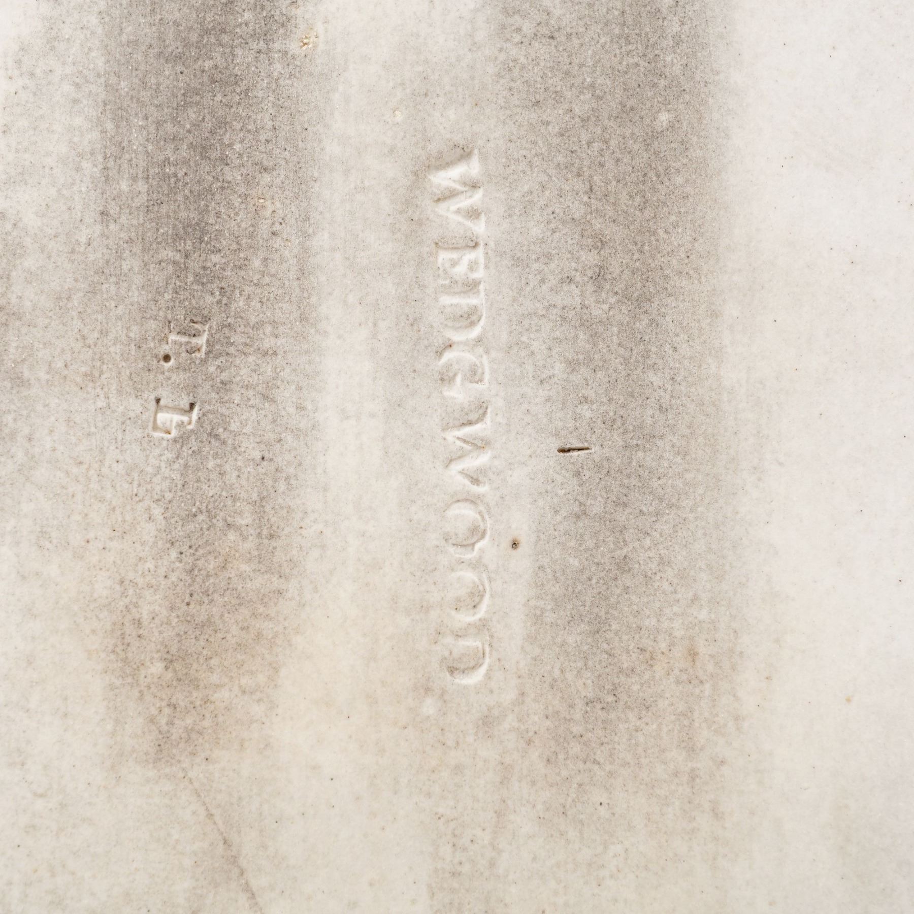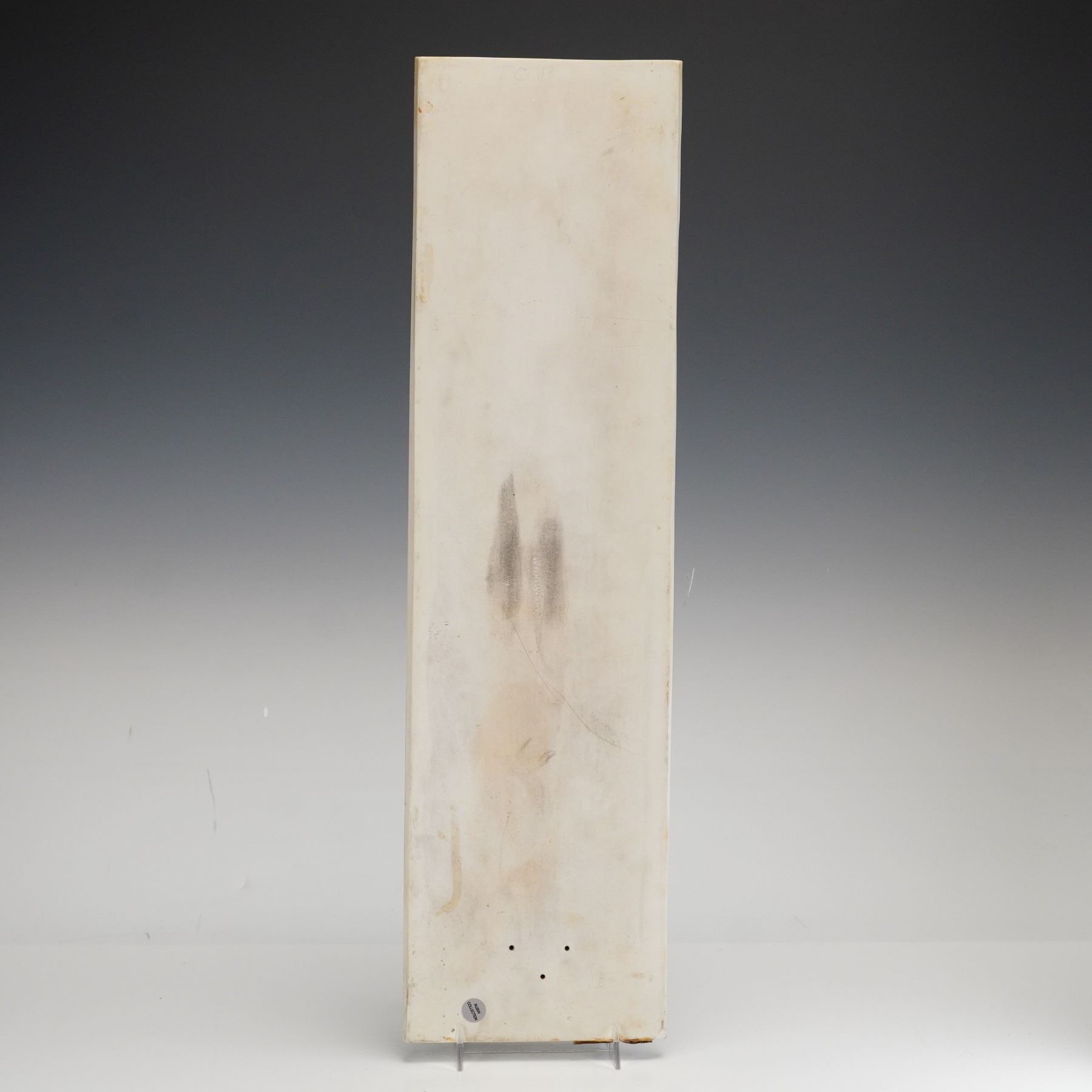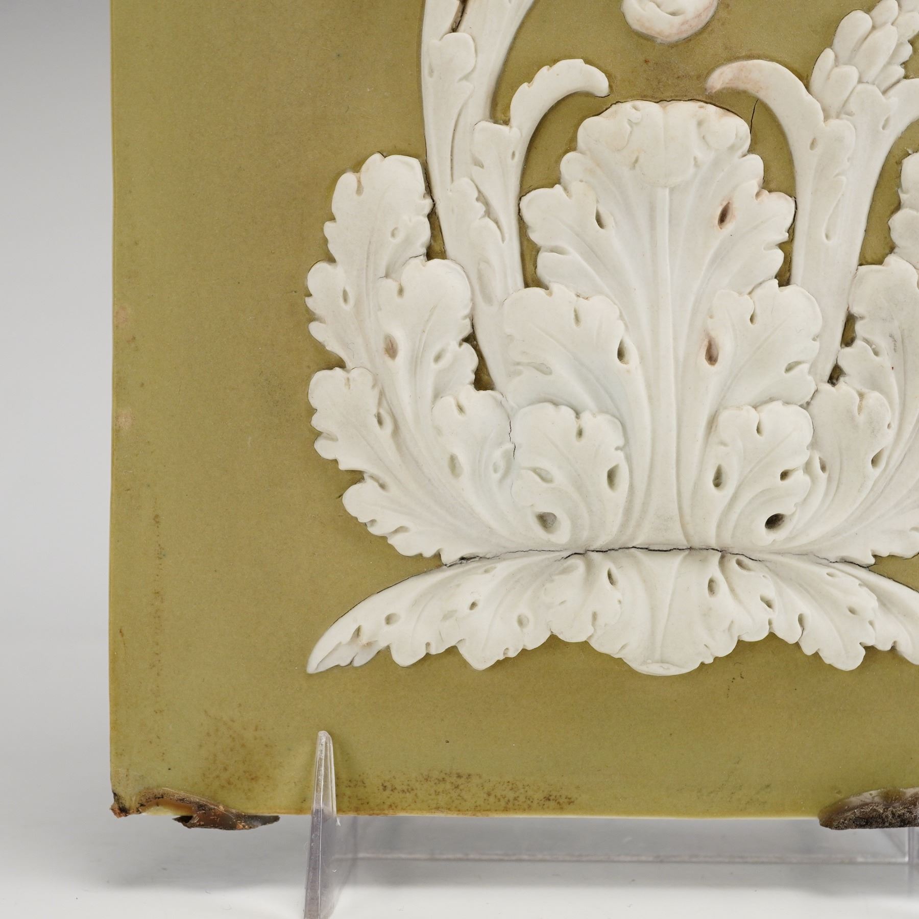 This rectangular vertical plaque is manufactured by Wedgwood in sage green jasperware stoneware. The decoration consists of white sprigged bas-relief neoclassical motifs featuring a vertical series of scrolling foliate and floral designs terminating in a large acanthus leaf at the base. The reverse of the plaque is impressed with the mark WEDGWOOD and the letters T and L.