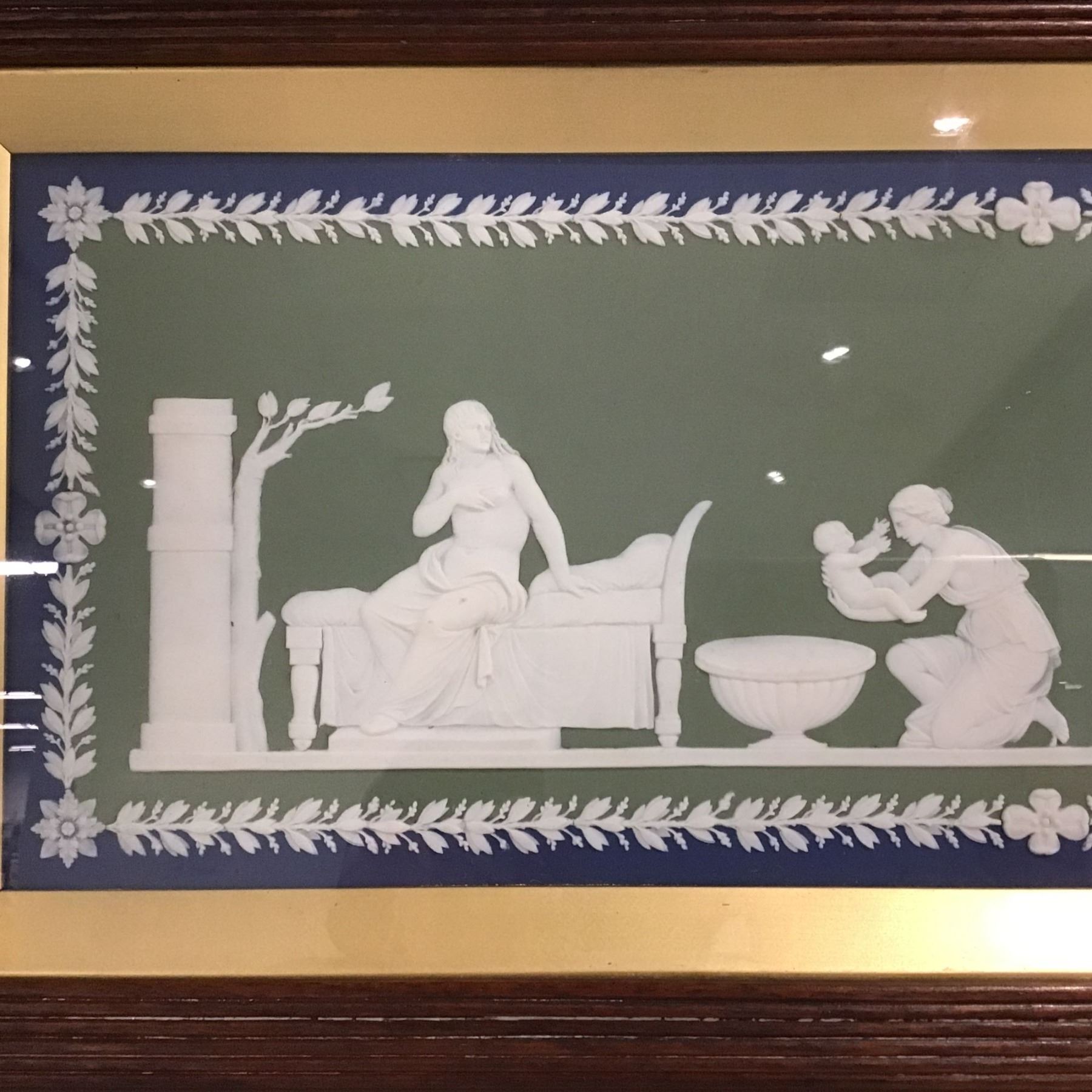 Housed in a wooden frame with a gilt-lined interior, the Wedgwood plaque depicting the "Birth and Dipping of Achilles" is rendered in white classical relief on sage green and pale blue jasperware grounds. The scenes are enclosed within a border of floral and foliate motifs in white relief.