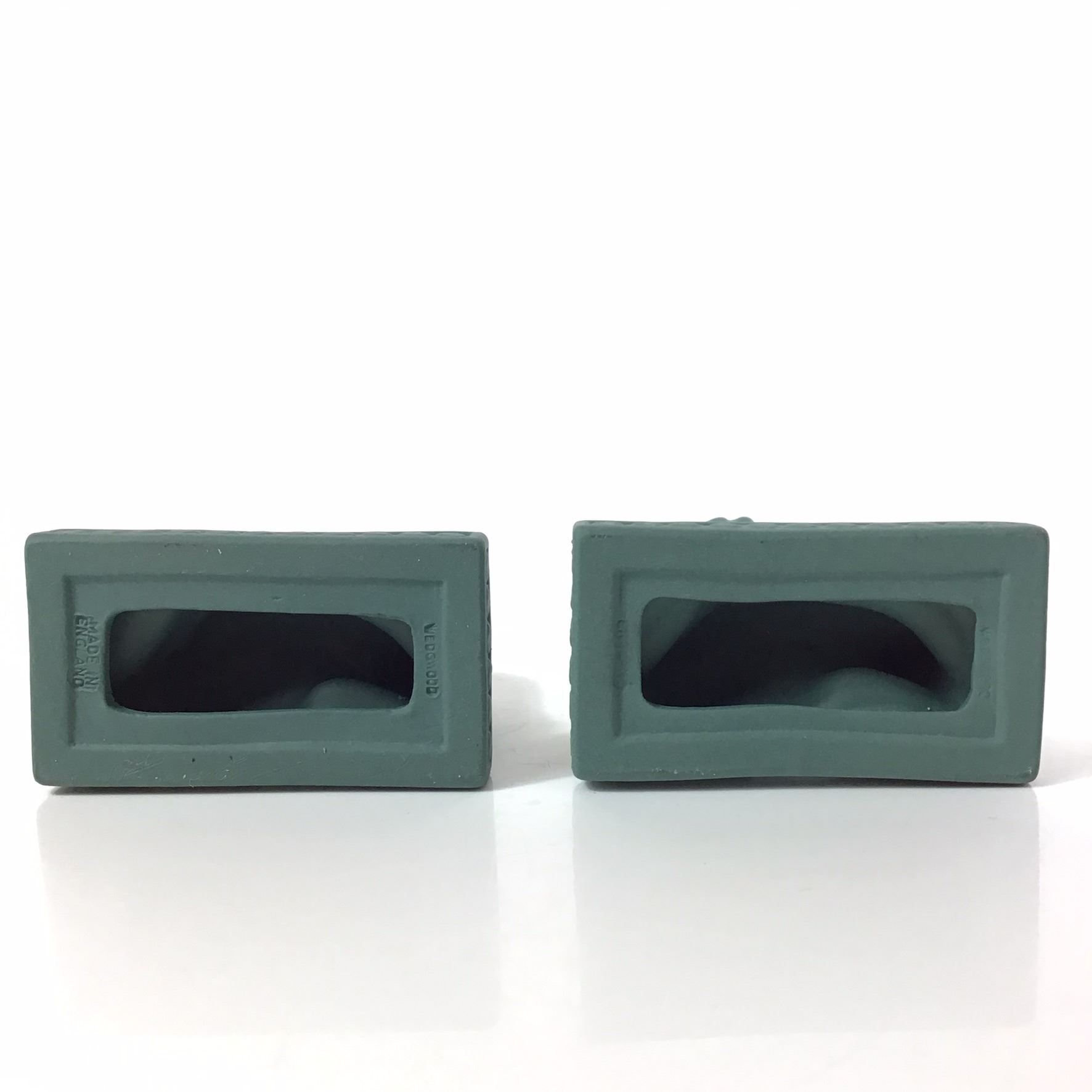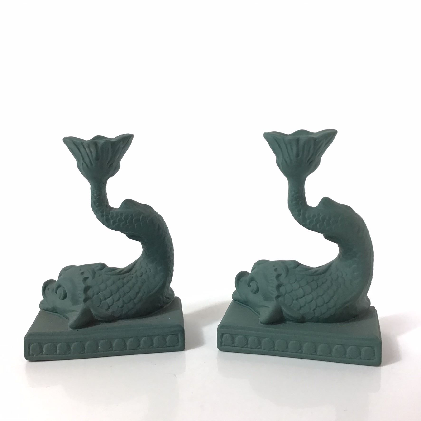 This 2pc Wedgwood candle holders set is crafted in sage green jasperware, which is a matte, unglazed stoneware ceramic. Each candlestick is modeled in a Neoclassical style as a stylized dolphin with its tail curved upward to support a foliate-form candle nozzle. The figures are mounted on rectangular plinth bases featuring a repeating relief border. The underside of the left base is impressed with the marks MADE IN ENGLAND and WEDGWOOD. The right base is impressed with the mark WEDGWOOD and a faint MADE IN ENGLAND mark. The construction is molded stoneware with a uniform color and original matte surface finish.
