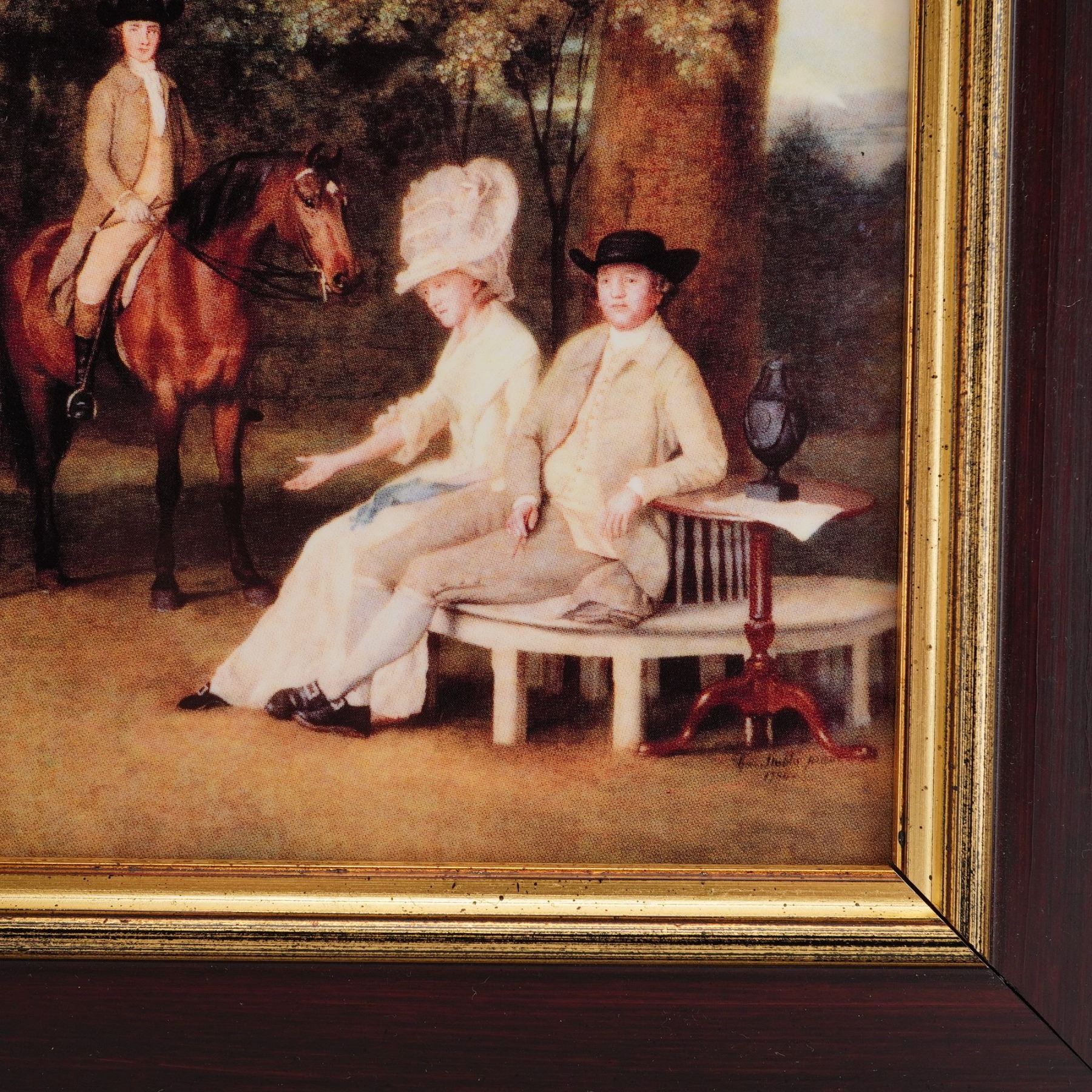 This item is a limited edition transfer-printed fine bone china plaque produced by Wedgwood, titled The Noble Line of Wedgwood. The scene is after an 18th-century conversation piece by George Stubbs depicting the Milbanke and Melbourne families in a parkland setting, identified as the grounds of Etruria Hall. The composition features figures in period attire on horseback, a seated couple on a garden bench, and two children in a small horse-drawn carriage. The plaque utilizes a stippled lithographic transfer technique to replicate the detail and soft color palette of the original work. The reverse is finished with a contemporary fiberboard backing featuring a circular aperture that reveals the Wedgwood manufacturer mark. Gold lettering on the porcelain reverse reads: OBSTANTIA DISCINDO / The Noble Line / of / Wedgwood / The Family Plaque / In A Limited Edition of 500. A circular sticker for the Rubin Collection is present on the backing, consistent with the ww rubin markings. The piece is housed in a substantial dark mahogany-toned wood frame with a gilded inner liner.
