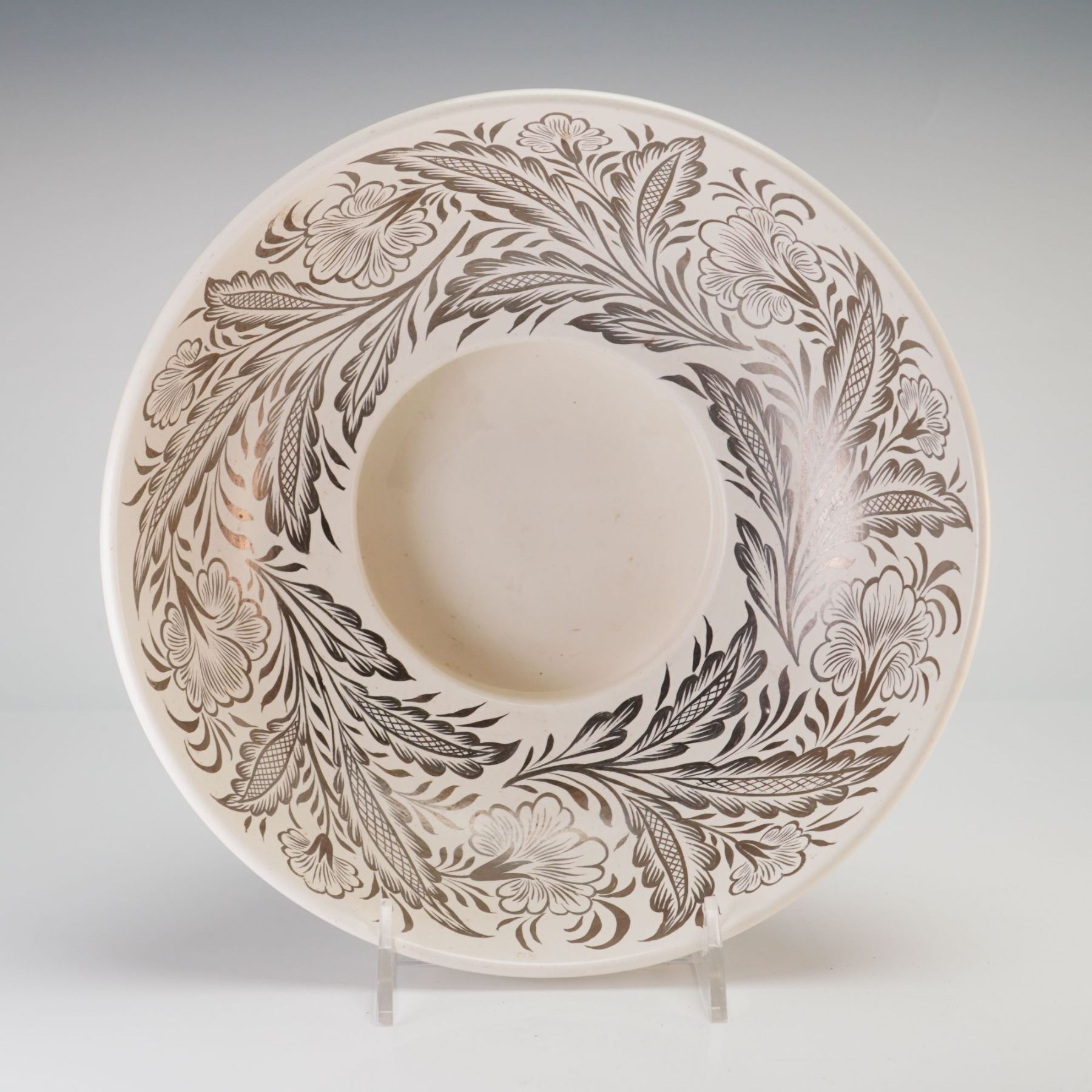 A refined Wedgwood & Barlaston creamware bowl featuring an elegant silver floral design. This classic example of mid'20th'century English craftsmanship showcases the brand's signature cream'toned earthenware, enhanced by a delicate metallic floral motif that adds a touch of sophistication. The bowl's balanced form and understated decoration make it a versatile display piece, equally suited for collectors of Wedgwood, lovers of traditional British ceramics, or those seeking a timeless accent for the home. A charming and well'preserved representation of Wedgwood & Barlaston's enduring aesthetic. Wedgwood & Barlaston backstamp on base.
