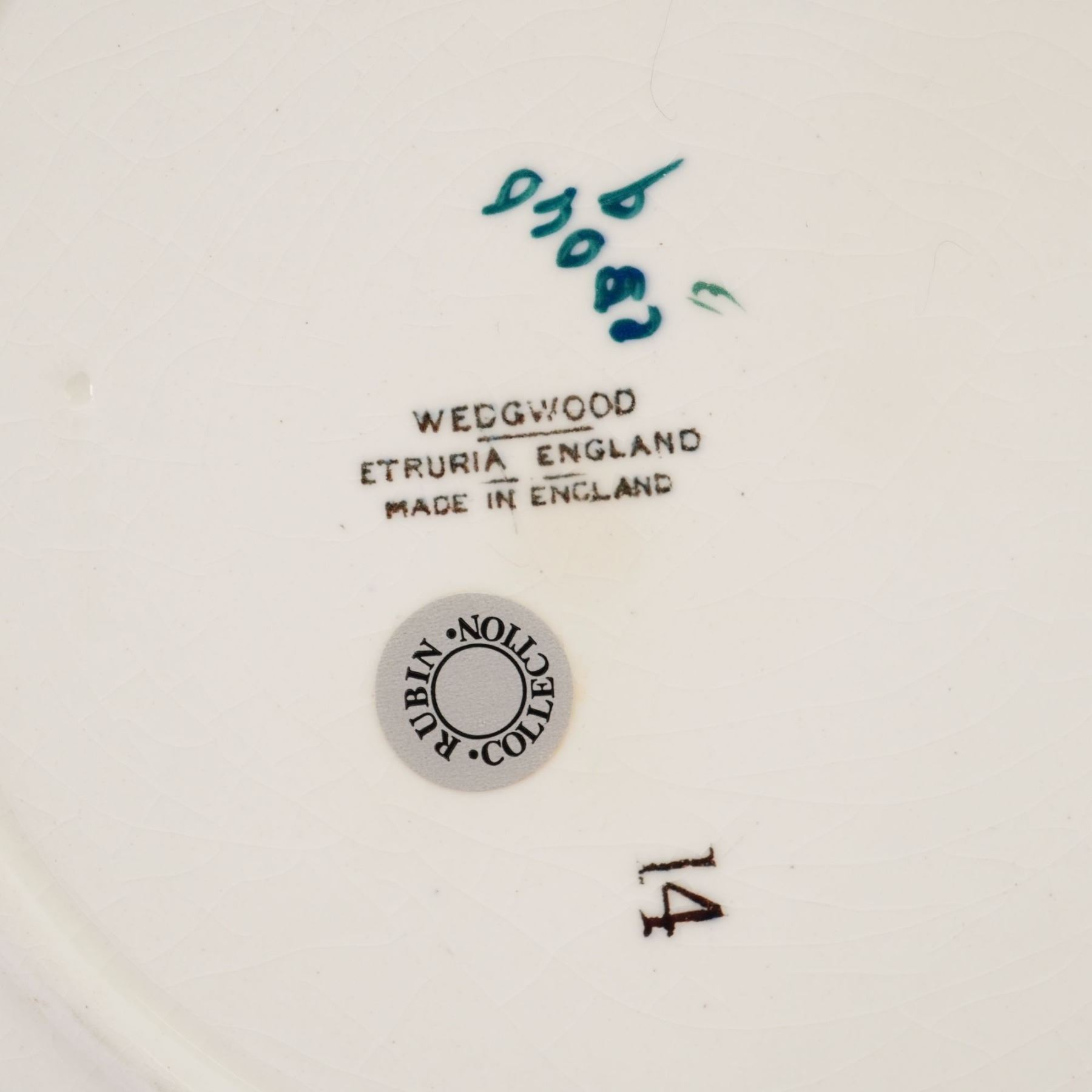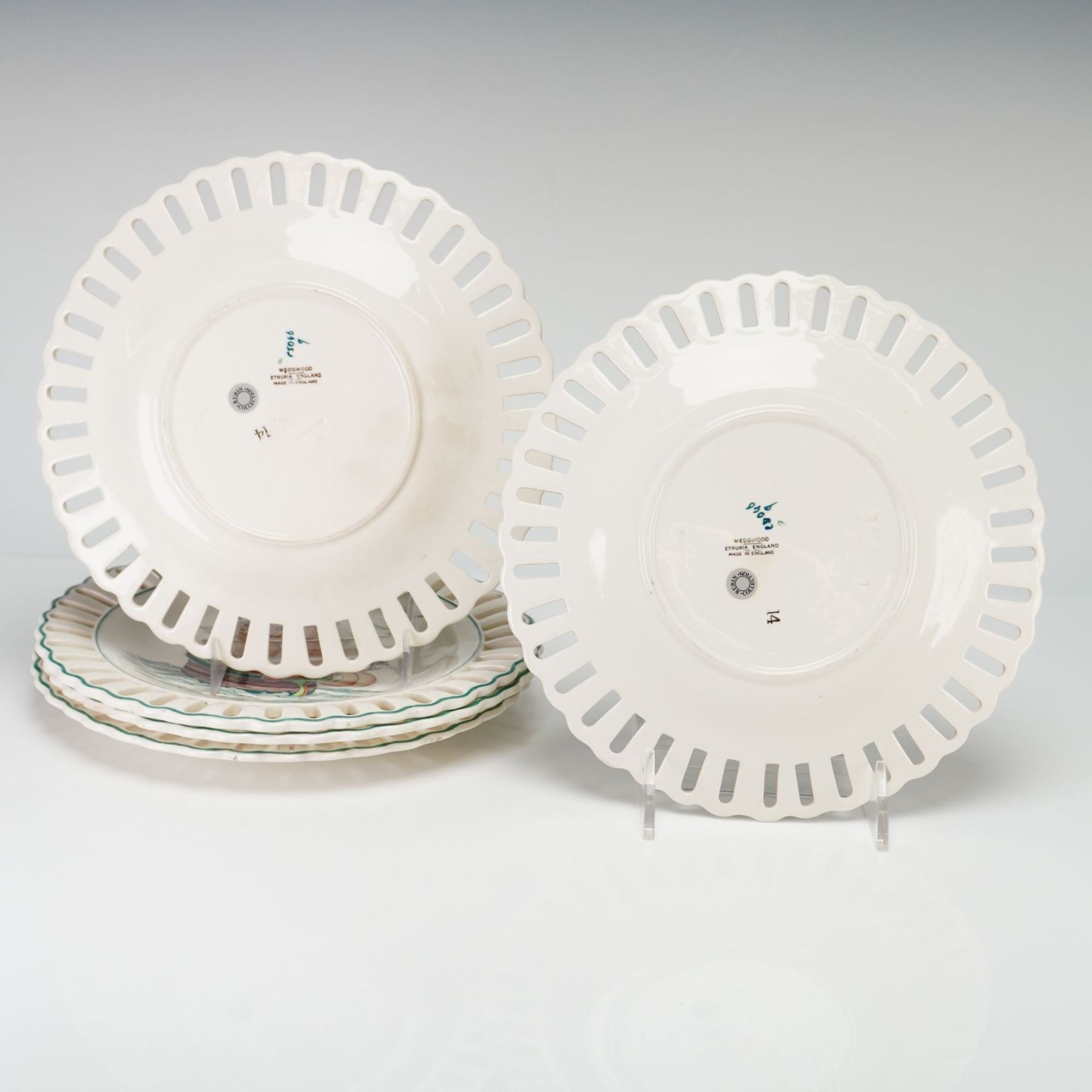 A set of five circular earthenware creamware plates manufactured by Wedgwood at the Etruria works in England. These plates feature wide reticulated or pierced basket-weave borders and scalloped rims accented with a hand-applied green line. The central wells are decorated with various maritime scenes depicting multi-masted sailing ships at sea. The decoration technique consists of transfer-printing with hand-painted polychrome overglaze accents in shades of orange, blue, purple, and green. On the reverse, the plates bear a stamped mark in ink that reads Wedgwood Etruria England and Made in England. There are hand-painted characters in blue-green ink, including 9405 b, and a separate stamped number 14. One or more plates bear a circular silver foil adhesive label for the Rubin Collection.