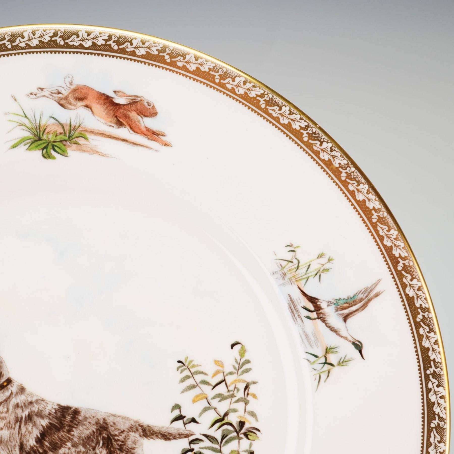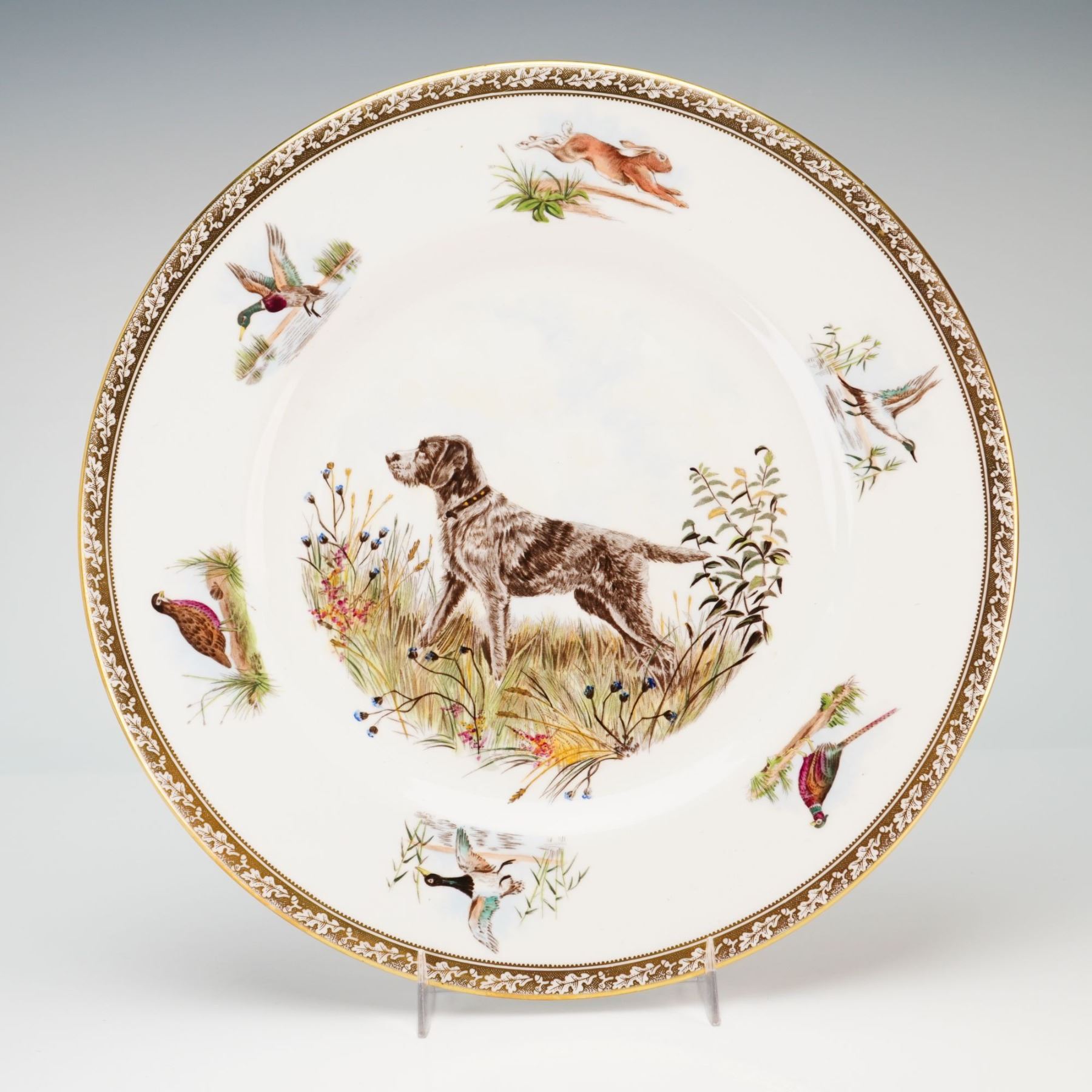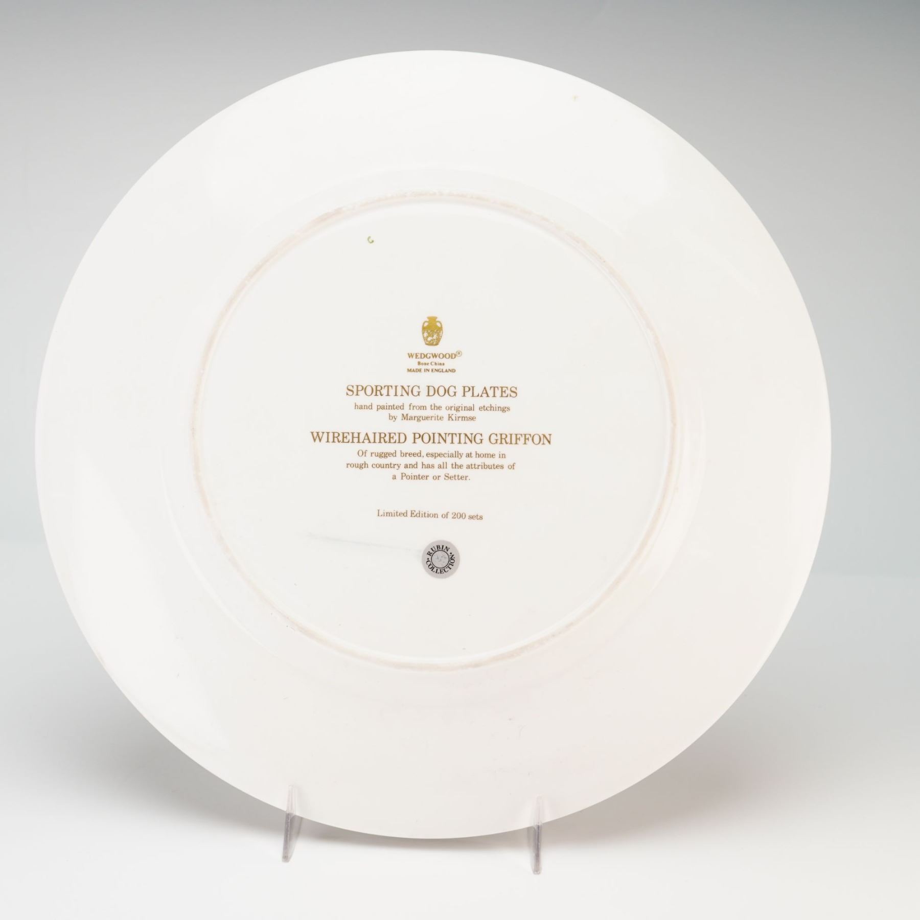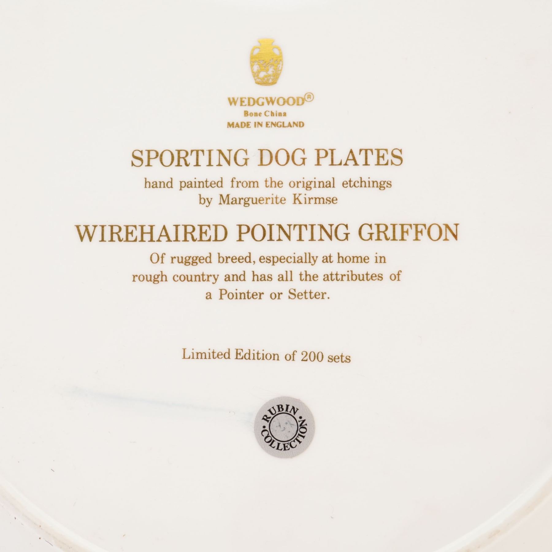 This Wedgwood bone china cabinet plate is part of The American Sporting Dog Plates series and features the Wirehaired Pointing Griffon. The decoration is hand painted based on original etchings by the artist Marguerite Kirmse. The central vignette depicts the dog standing in a field of tall grass and wildflowers. The rim is adorned with six smaller hand painted vignettes of game animals in their natural habitats, including mallard ducks, a running hare, and pheasants. The edge is finished with a gilt rim and a decorative border of oak leaves and acorns in a golden-brown tone. The underside of the plate bears a gold Wedgwood urn mark and the following transcription: WEDGWOOD, Bone China, MADE IN ENGLAND, SPORTING DOG PLATES, hand painted from the original etchings by Marguerite Kirmse, WIREHAIRED POINTING GRIFFON, Of rugged breed, especially at home in rough country and has all the attributes of a Pointer or Setter, Limited Edition of 200 sets. A circular black and white sticker from the Rubin Collection is also attached to the base.