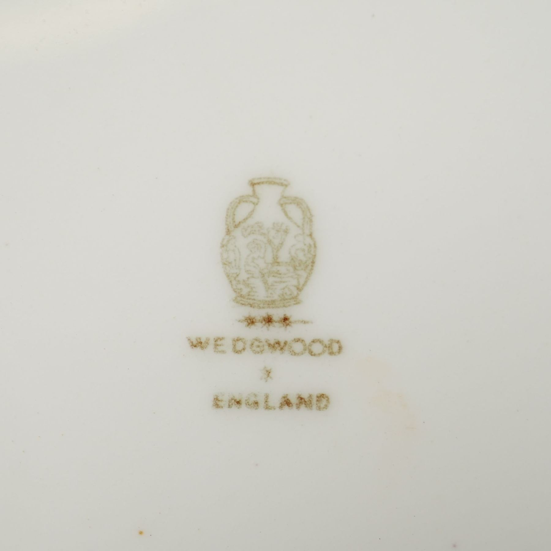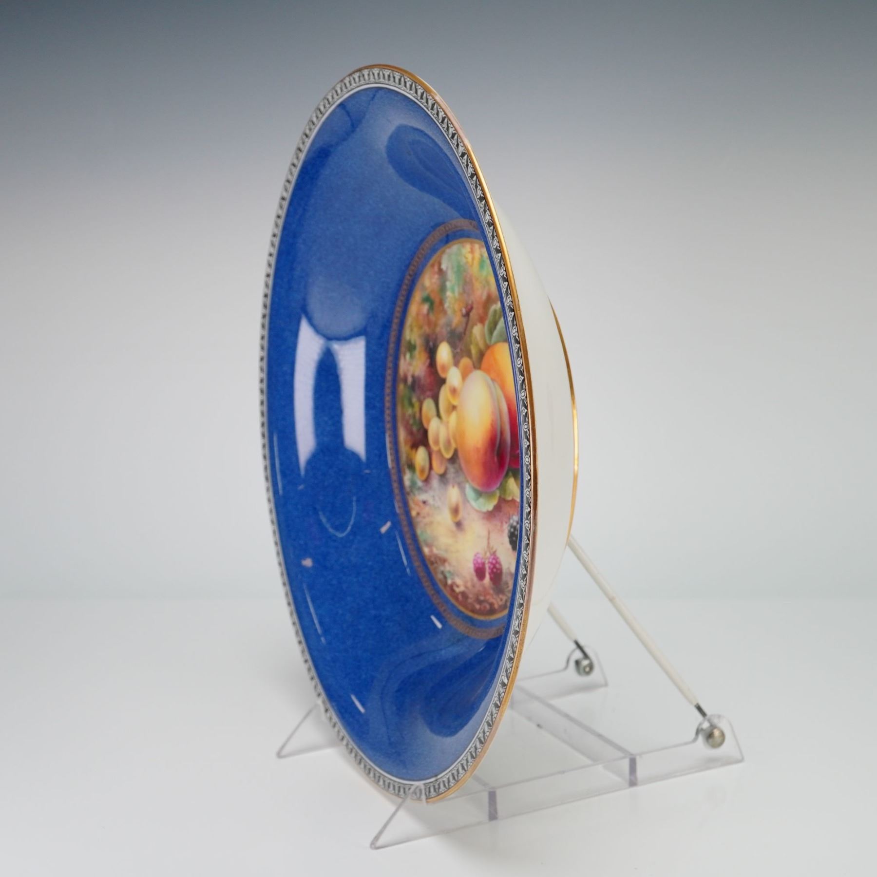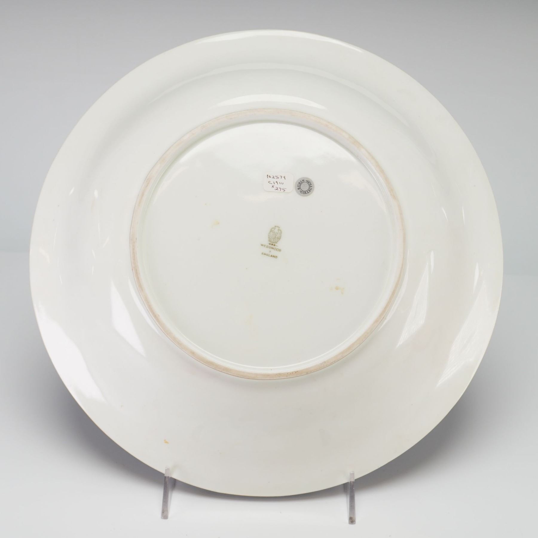 A Wedgwood fine bone china charger featuring a hand painted fruit study signed by the artist A. Holland. The central circular reserve depicts a still life of peaches, clusters of white grapes, raspberries, and blackberries against a variegated ground. The painting is signed A. Holland in the lower left portion of the scene. This central medallion is framed by a gilded foliate border. The wide shoulder of the plate is finished in a mottled powder blue glaze, accented by an outer geometric black and white border with a gilt edge. The reverse displays the printed brown Portland Vase mark above the word WEDGWOOD, a star, and ENGLAND. A silver toned collector label for the Rubin Collection is affixed to the back, alongside a dealer label with an inventory number and a date of circa 1910.