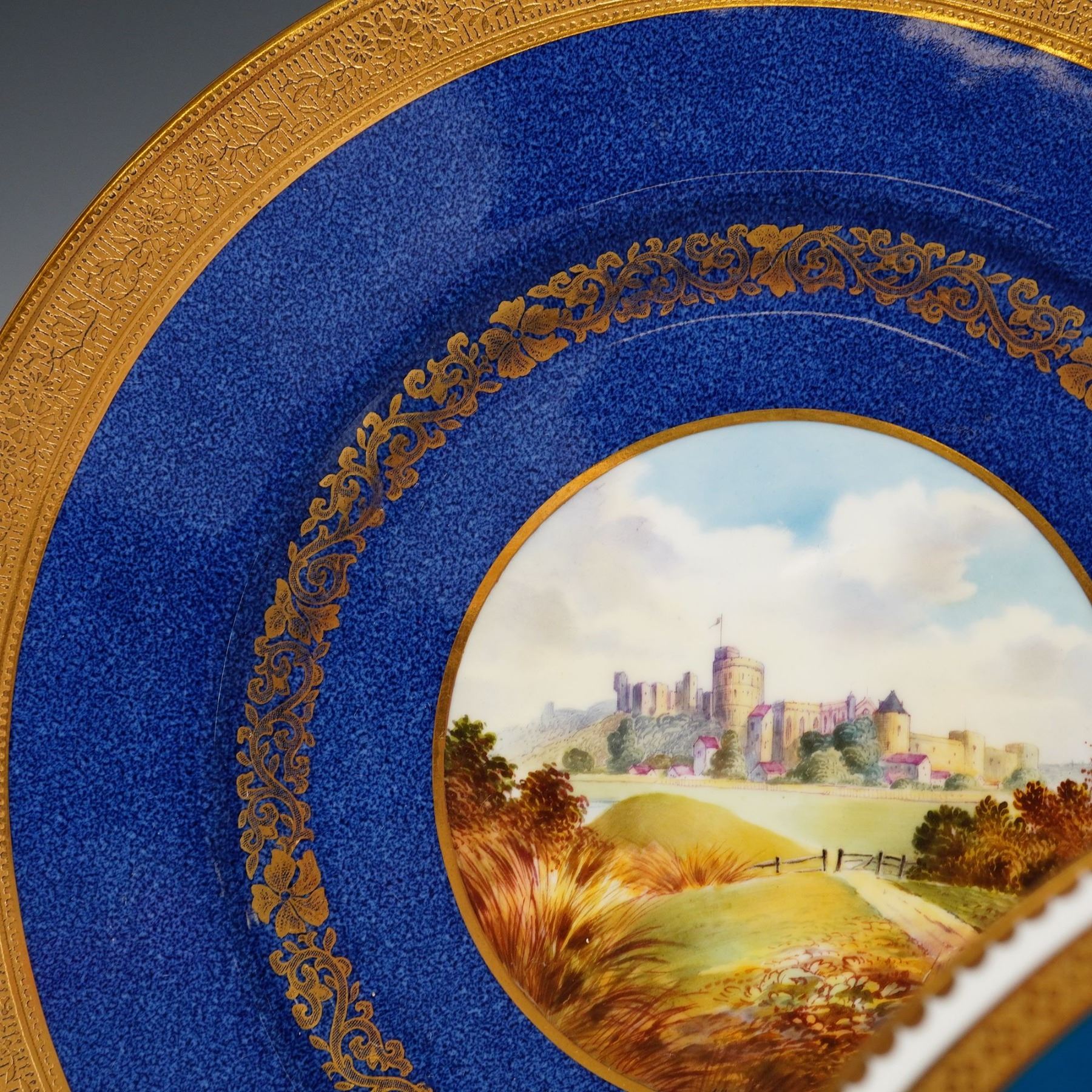 This trio of Wedgwood porcelain cabinet plates features hand-painted central landscape vignettes. One plate depicts Windsor Castle, another depicts the ruins of Kilchurn Castle, and the third shows a coastal scene with sailboats and a clifftop ruin. The coastal scene is signed J.H. Plant in the lower left of the vignette. Two plates feature powder blue borders, one with a wide acid-etched gilded border and the other with a gilded vine-and-leaf border. The third plate has a blue border decorated with a wide band of raised-gold foliate scrollwork. The reverse of each plate bears a WEDGWOOD and MADE IN ENGLAND stamp. Titles for Windsor Castle and KILCHURN are hand-written in red script on the reverse. Provenance is indicated by several collection and auction labels, including the Rubin Collection, the Shulman Collection, and Skinner auctions.