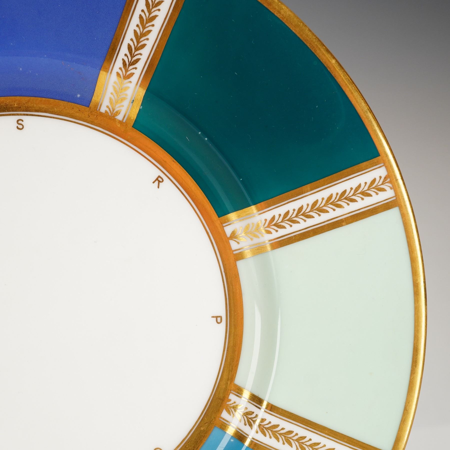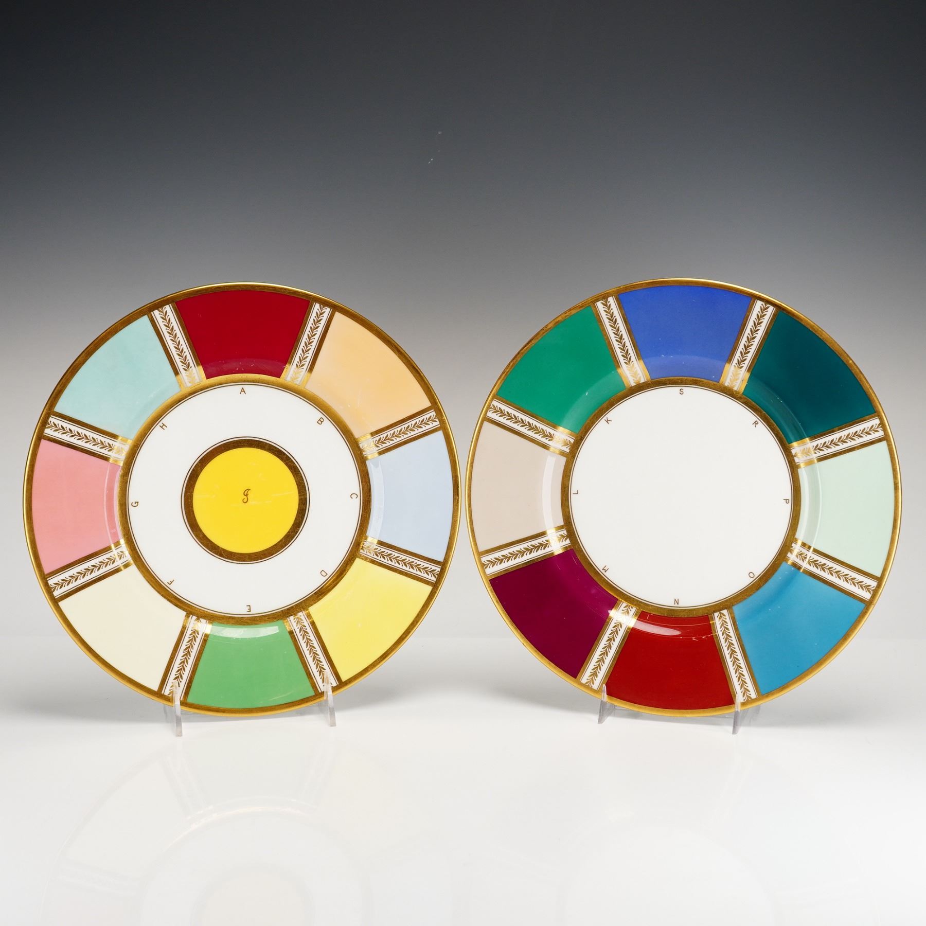 This pair of Wedgwood fine porcelain display plates features radial segments showcasing various colored enamel glazes separated by gilded laurel leaf bands. The first plate is divided into eight sections including Crimson, Champagne, and Rose-du-Barri, centered by a yellow medallion with a script "L." The second plate features eight different segments including Sherwood Green and Cherry Lacquer, with corresponding gilded letters at the inner edge of each color. Both plates bear the Wedgwood Portland Vase mark on the reverse alongside hand-painted inscriptions identifying each specific color sample. Each piece is finished with a solid gilded rim and retains a sticker for the Rubin Collection.