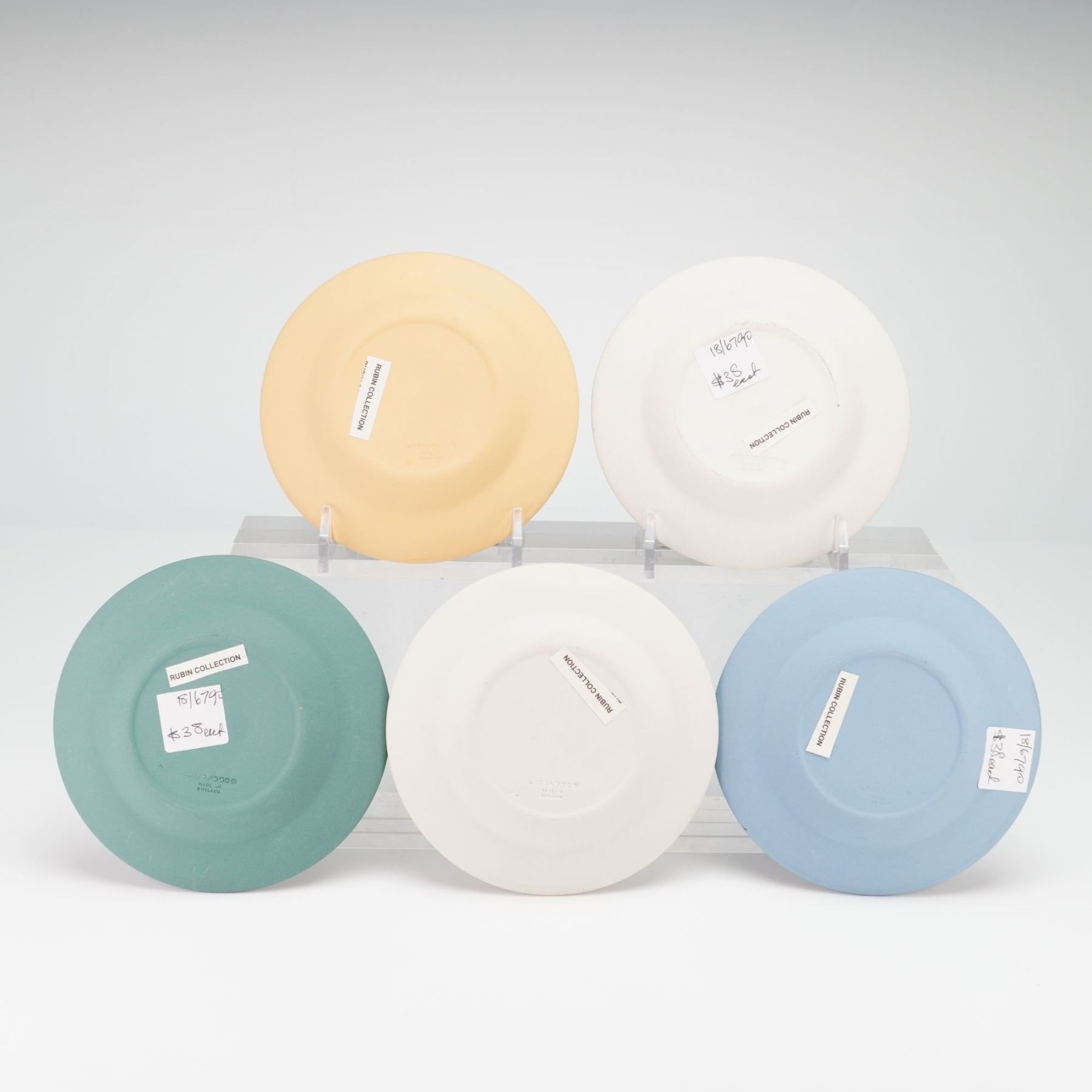 This collection of five Wedgwood jasperware miniature dishes features motifs from the Australian Native Flowers series. Each circular stoneware dish is decorated using a sprigged bas-relief technique, featuring a central botanical specimen and a coordinating foliate or laurel leaf border in a contrasting color to the body. The group includes a yellow dish with white relief, a white dish with cream relief, a sage green dish with pink relief, a white dish with pink relief, and a light blue dish with pink relief. The floral motifs include representations of primroses, blossoming branches, bleeding hearts, chrysanthemums, and hibiscus. The reverse of each piece bears the impressed mark WEDGWOOD and MADE IN ENGLAND, along with various individual potter marks. These items are part of the ww rubin coll, with each dish retaining a paper label for the Rubin Collection and handwritten inventory notations.