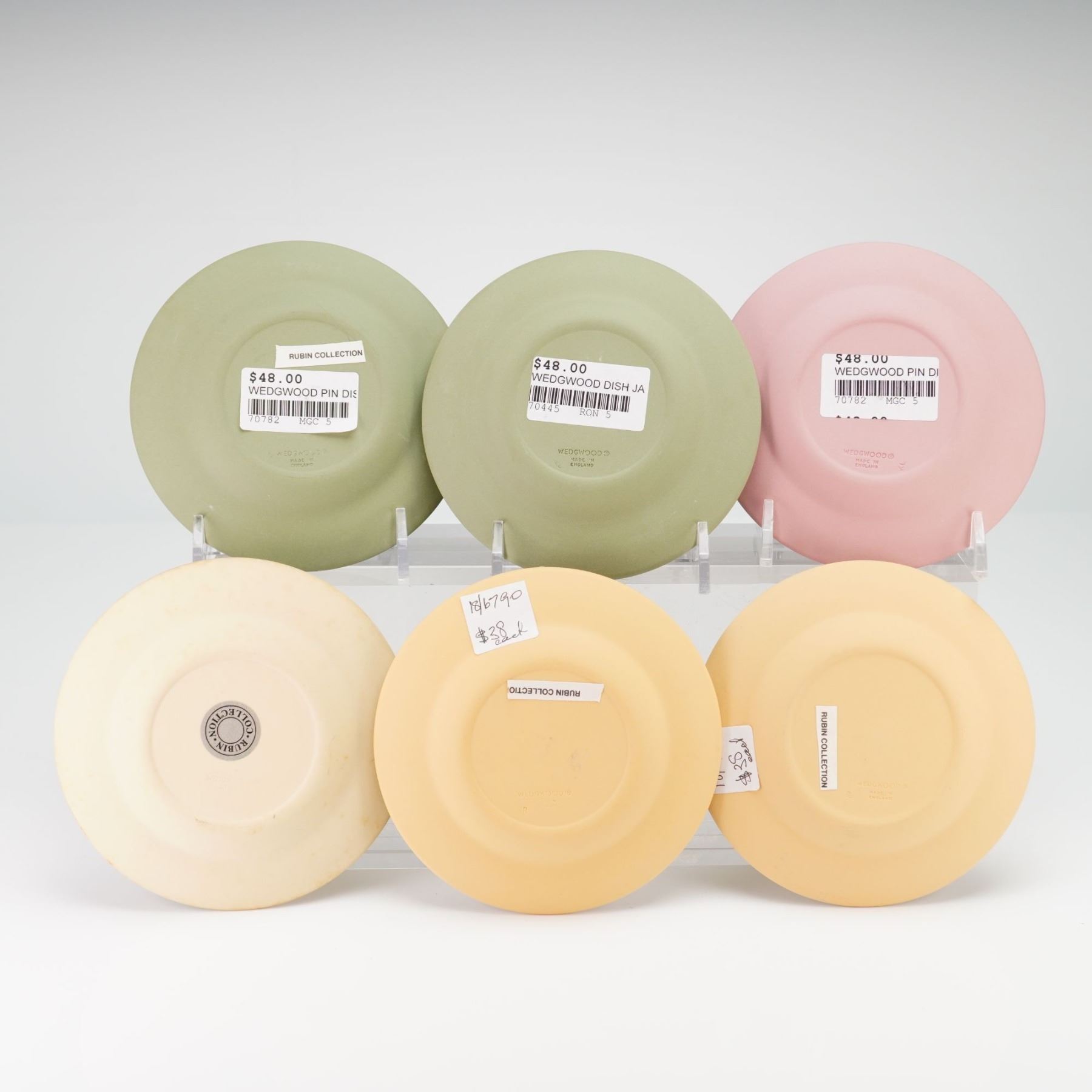 This collection of Wedgwood jasperware consists of several circular pin dishes featuring motifs from the Australian animal and bird series. Each dish is constructed from unglazed vitreous stoneware with applied sprigged bas-relief decoration in various color combinations. The motifs include a white swan on sage green, a terracotta lyrebird on sage green, a white cockatoo on pink, a terracotta crocodile on cream, a black swan on yellow, and a sage green griffin on yellow. Each central figure is enclosed within a decorative laurel wreath or stylized floral border. The underside of each piece features the impressed factory mark Wedgwood and Made in England, accompanied by a registered trademark symbol. Several items in this lot include adhesive labels from the Rubin Collection.