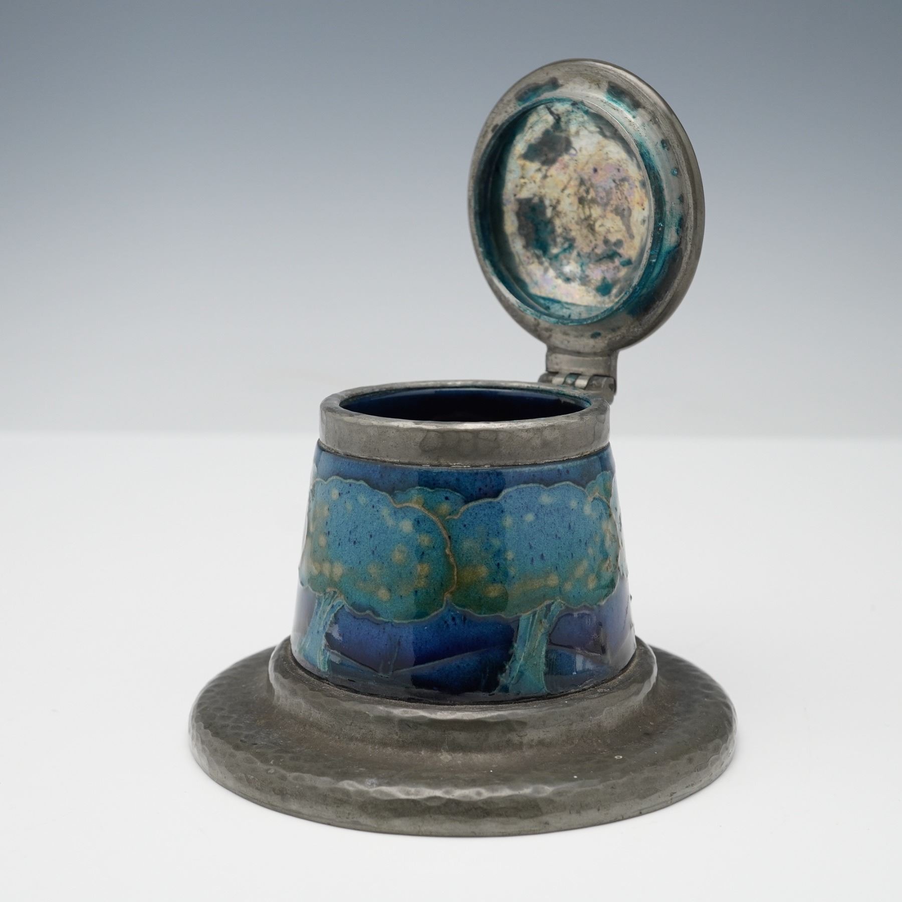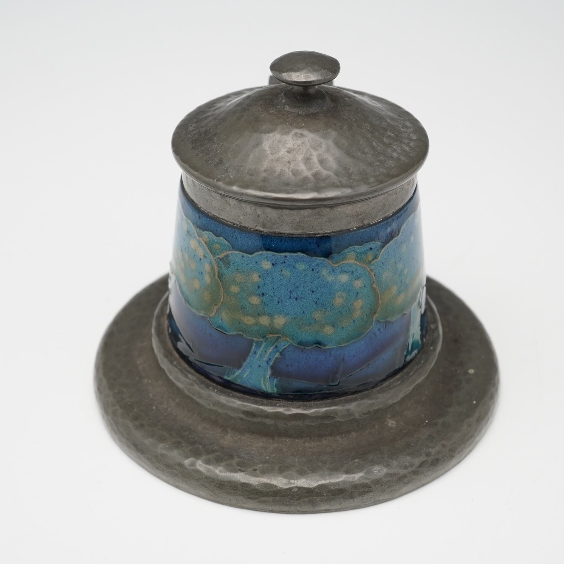 A inkwell comprising a Tudric hammered pewter base and hinged lid, enclosing a tube lined decorated holder. Depicts a band of stylized trees against a cobalt and indigo ground. Tudric Moorcroft and 01363 impressed to underside.