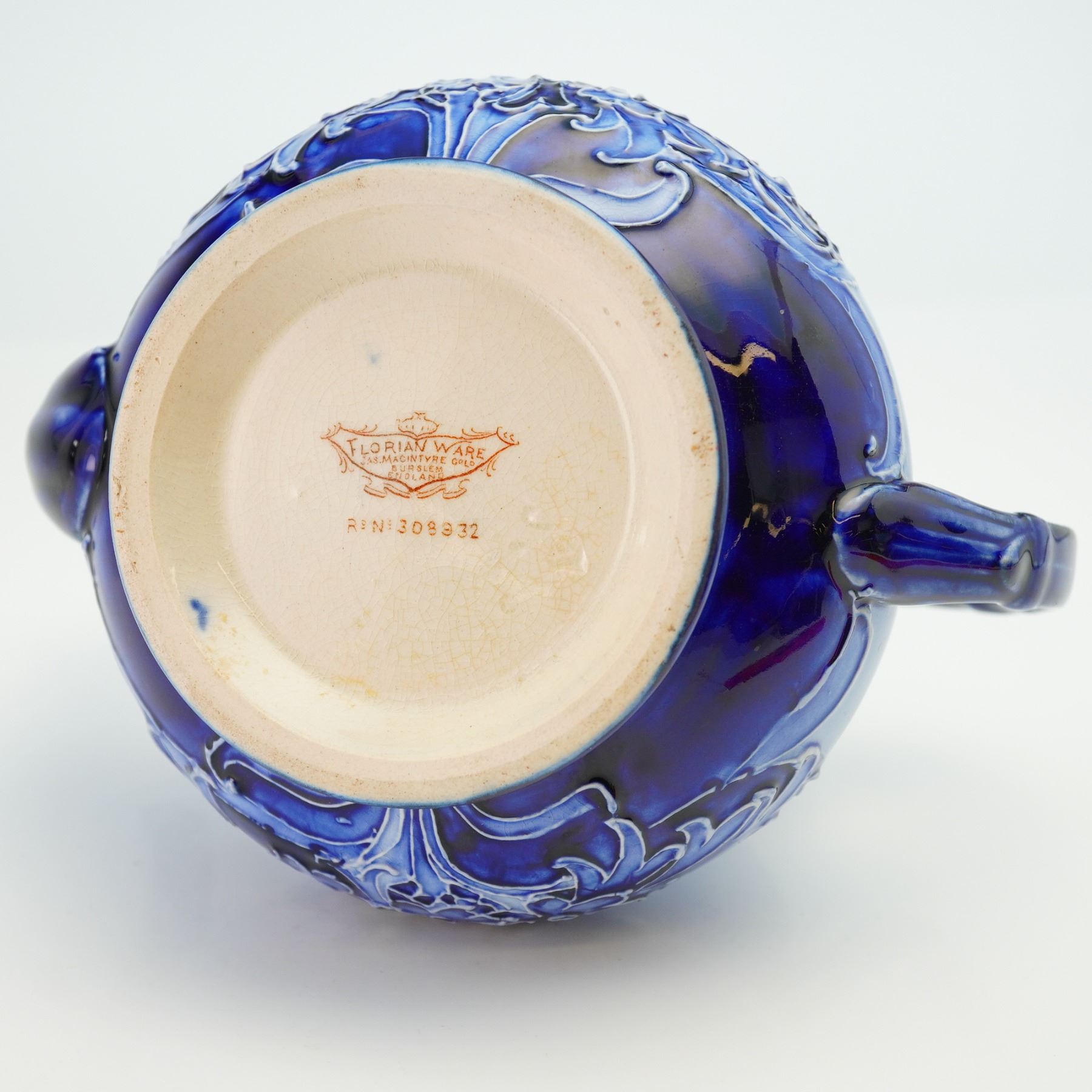 Art nouveau inspired blue and white cornflower tube-lined design. Florian Ware James Macintyre mark on base.