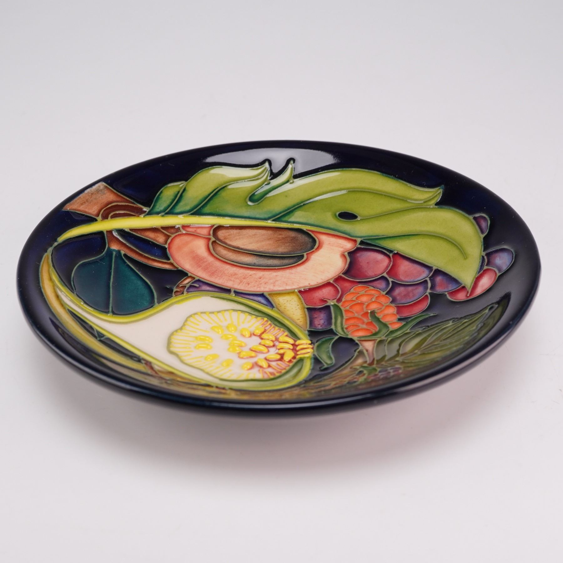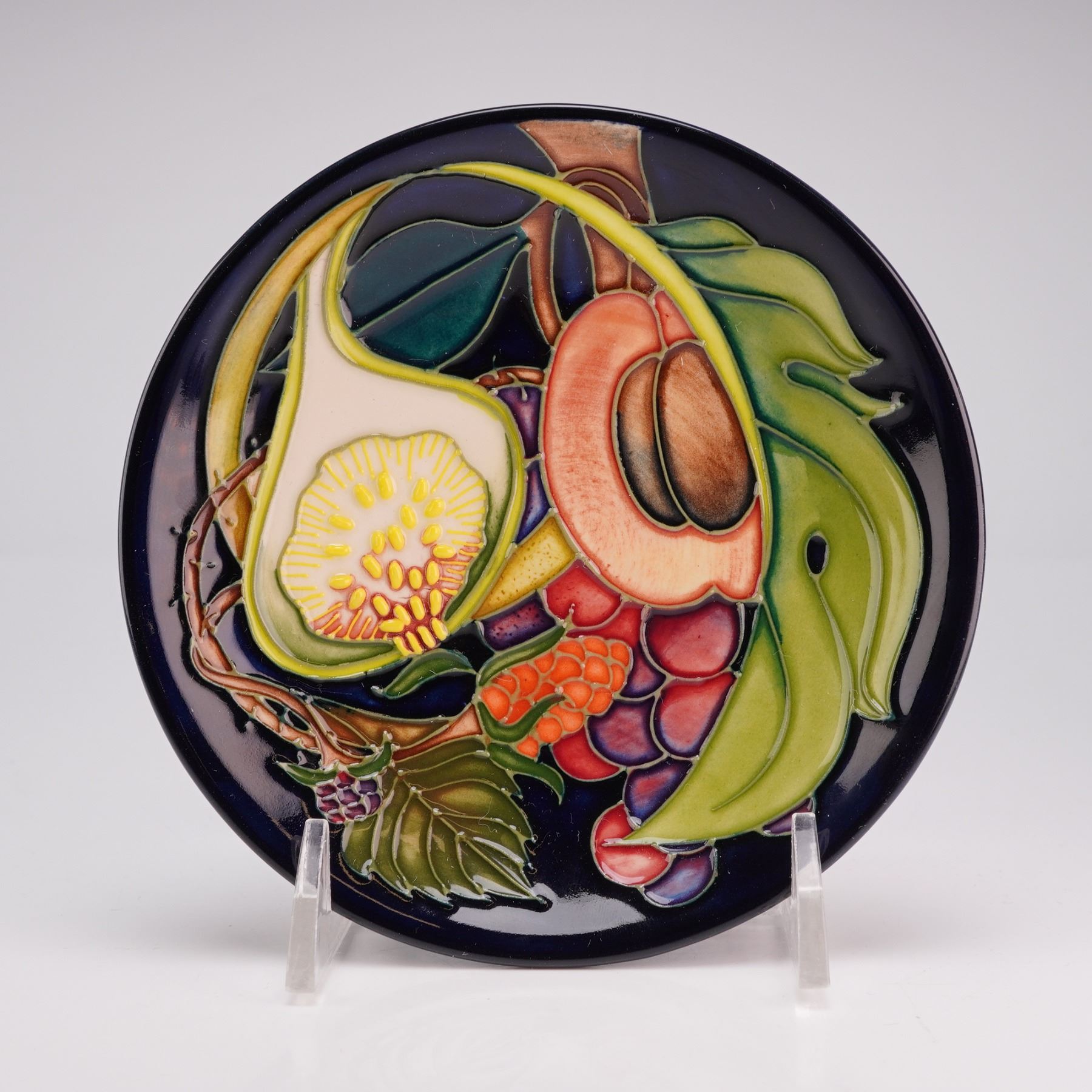 The piece is decorated using the signature tube-lining technique, featuring hand-painted polychrome glazes under a clear high-gloss finish. The motif depicts a variety of fruits including a halved fig, a halved peach, grapes, and berries set against a dark cobalt blue ground. The underside bears the Moorcroft impressed mark.