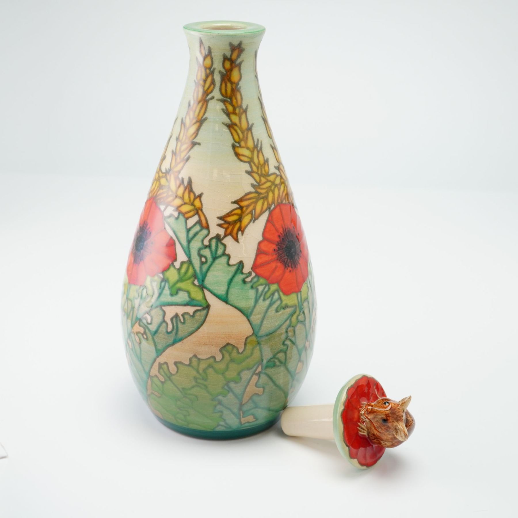 The teardrop-shaped vessel is crafted using the tube-lining technique and hand-painted under a clear glaze. Its decoration features vibrant red poppies with black centers, broad green foliage, and upright stalks of golden wheat set against a cream-colored ground. The fitted stopper is topped with a hand-modeled figurine of a harvest mouse holding a grain of wheat. The underside of the vase bears the Dennis China Works backstamp, artists' marks, and the number 8.