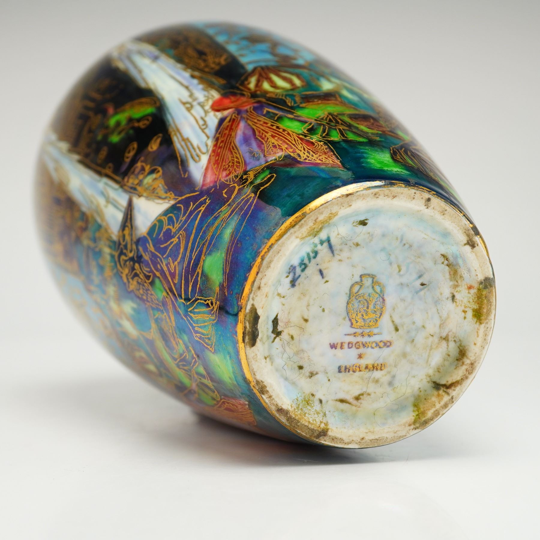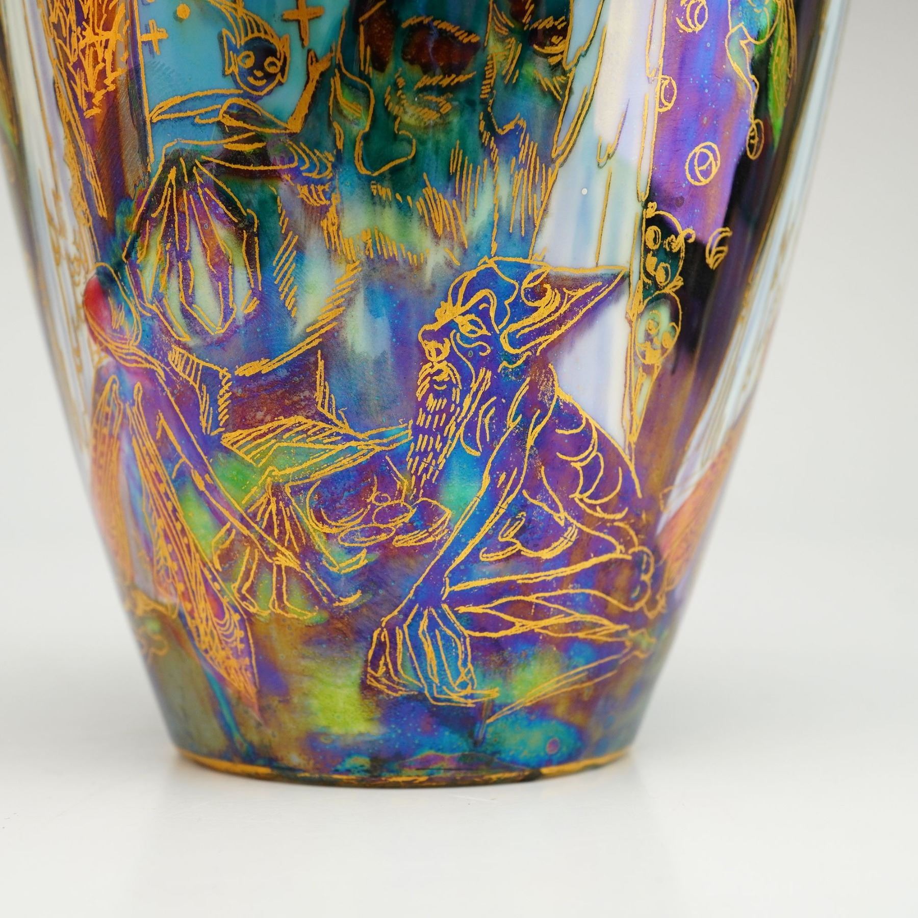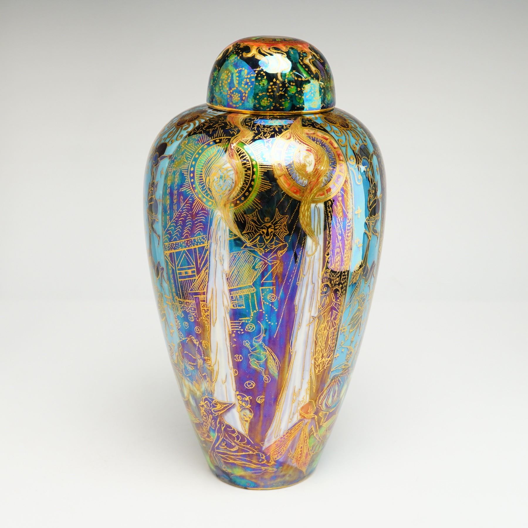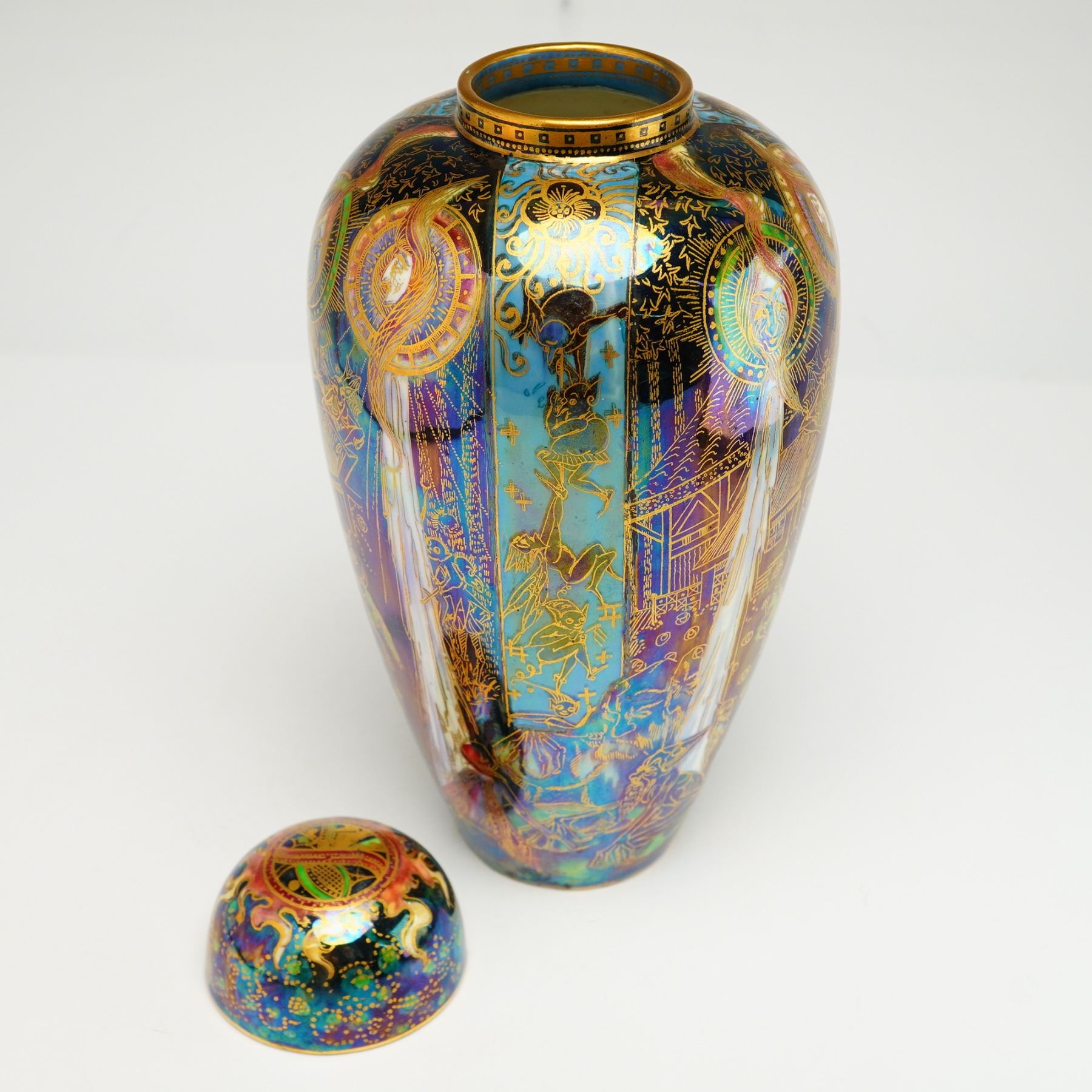 Covered pot designed by Daisy Makeig-Jones in the Black Fairyland color scheme, depicting the Candlemas feast, which commemorates the Presentation at the Temple and the Purification of the Virgin Mary. The design includes narrow blue lustre bands with suspended brown figures resembling bell ringers, and stylized white candles shaded in blue with human heads encircled by green aureoles. The lid features the Flaming Wheel pattern. The underside marked with the Wedgwood backstamp, and Z5157.