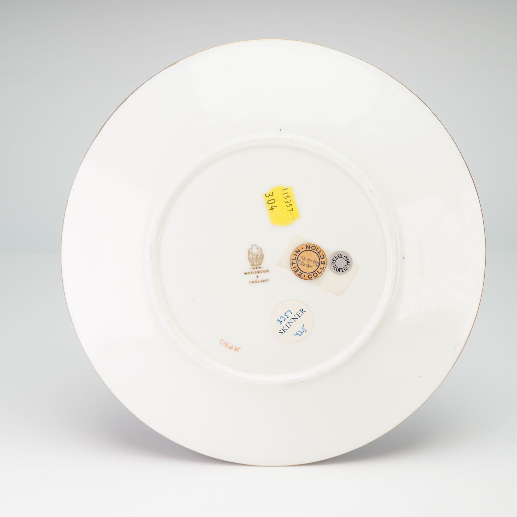 This circular porcelain plate is manufactured by Wedgwood and features a powder blue ground. The central motif depicts two white calves or oxen standing in gilded grass, a design derived from the Venturino Mercati Book of Hours in the Morgan Library and Museum. The rim is decorated with a gilded laurel leaf border and a gold-lined edge. The reverse displays a gold printed Wedgwood factory mark with a classical urn and the word England. Additional markings include a red handwritten alphanumeric code C1687. This piece carries provenance from the Zeitlin Collection and the Rubin Collection, as evidenced by collector labels, and includes a Skinner auction house label.