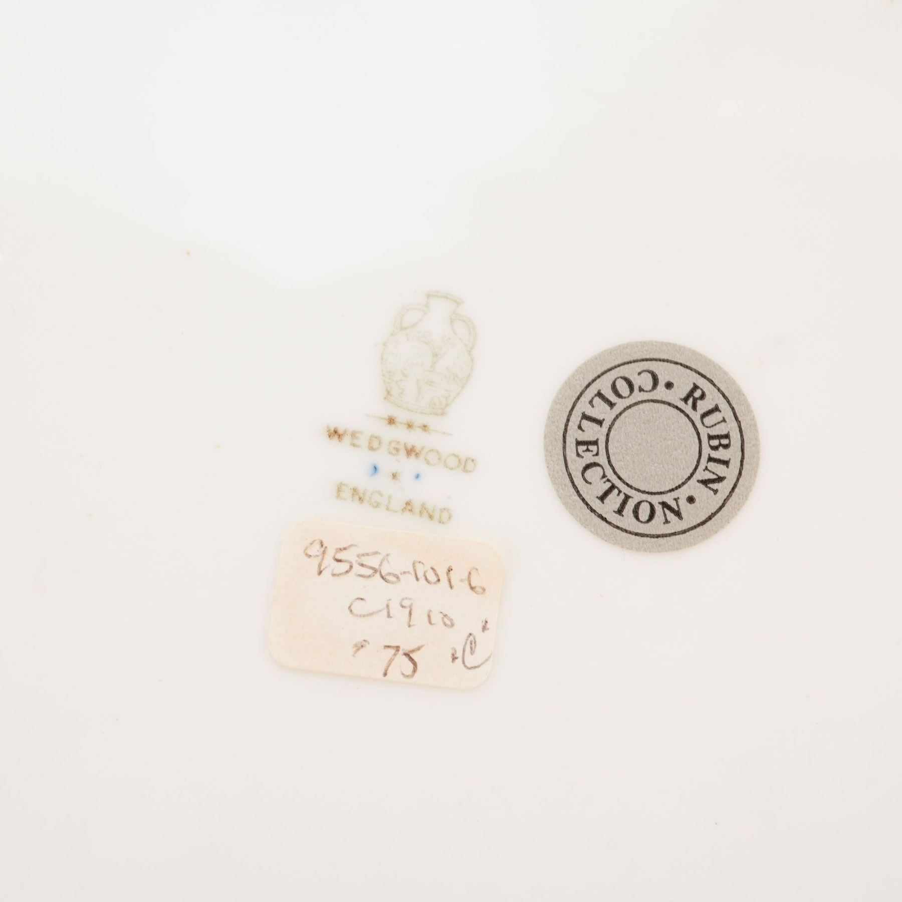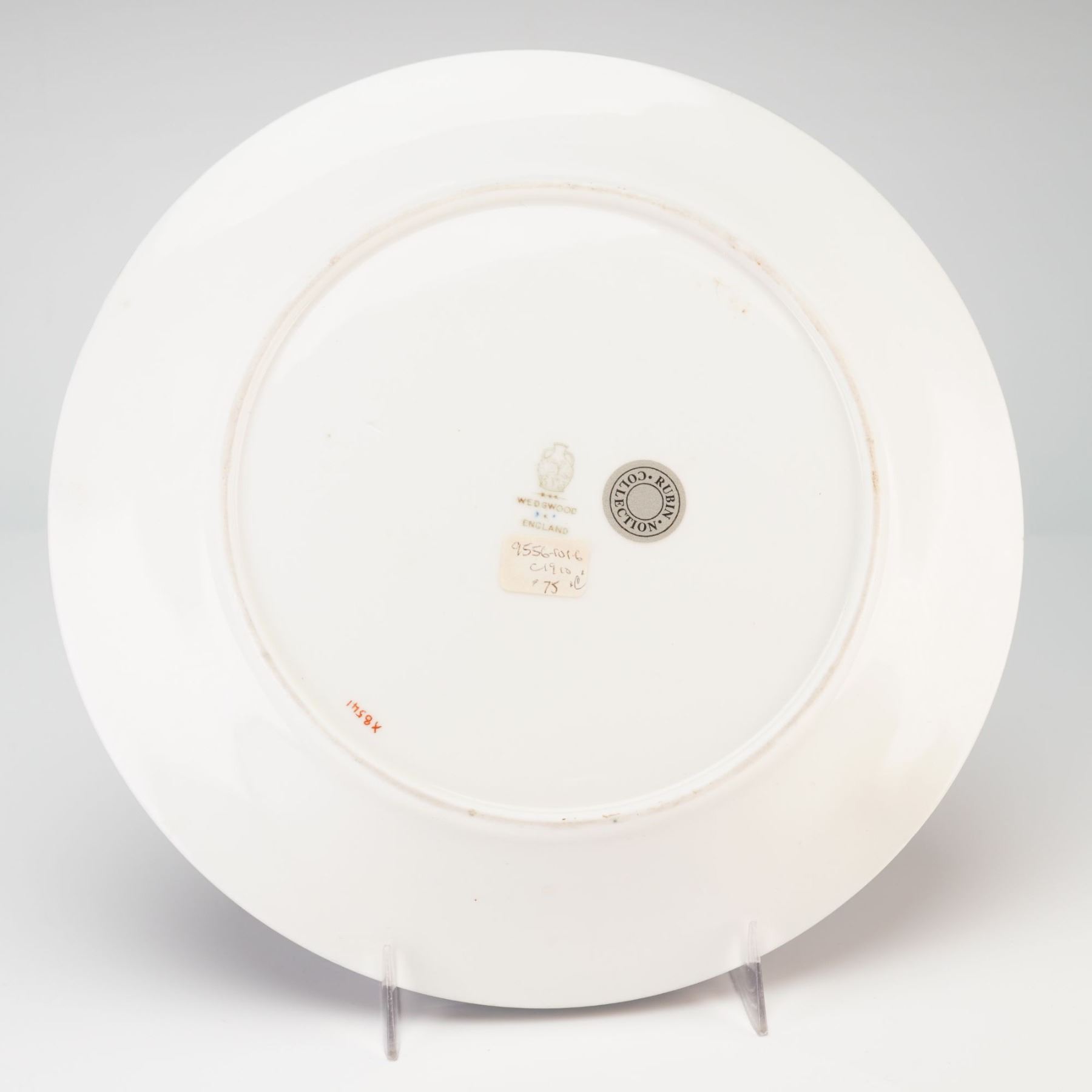 Cobalt plate features a central gilded fish motif. The central design is surrounded by a radiating gold-tone fishnet or reticulated pattern extending to the edge of the rim. The rim is finished with a thin gold band. The base bears a brown printed factory mark for Wedgwood, England, featuring the Portland Vase icon. Additional markings include a circular grey sticker for the Rubin Collection, a paper inventory label with handwritten notations including a circa 1910 date, and a handwritten alphanumeric code X8541 in red.