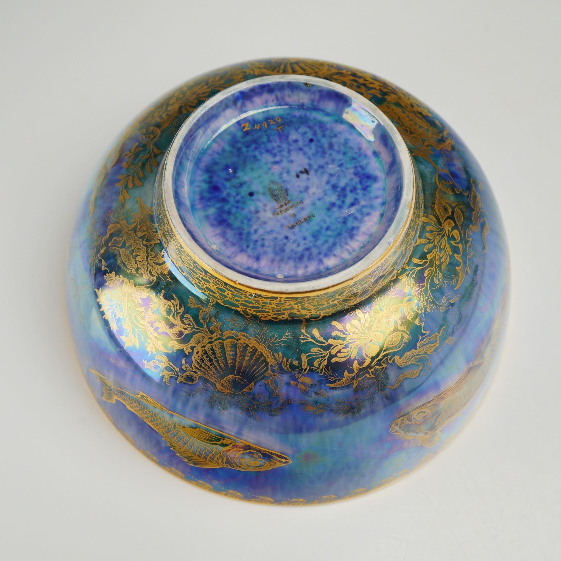 A Wedgwood porcelain bowl of circular footed form featuring the Fish Luster pattern, number Z4920. This design is attributed to Daisy Makeig-Jones. The exterior is finished in a mottled iridescent luster glaze with tones of cobalt blue, violet, and turquoise. The exterior decoration consists of three gilt fish swimming among shells and aquatic foliage. A gilt foliate border encircles the upper rim and the foot. The interior is finished in a pale celadon green glaze and features two polychrome painted fish swimming among strands of green and red seaweed. The interior rim is decorated with an ornate gilt border. The base bears a printed mark in black featuring the Portland Vase above the words WEDGWOOD and MADE IN ENGLAND. The pattern number Z4920 and the letter T are hand painted in gold script.