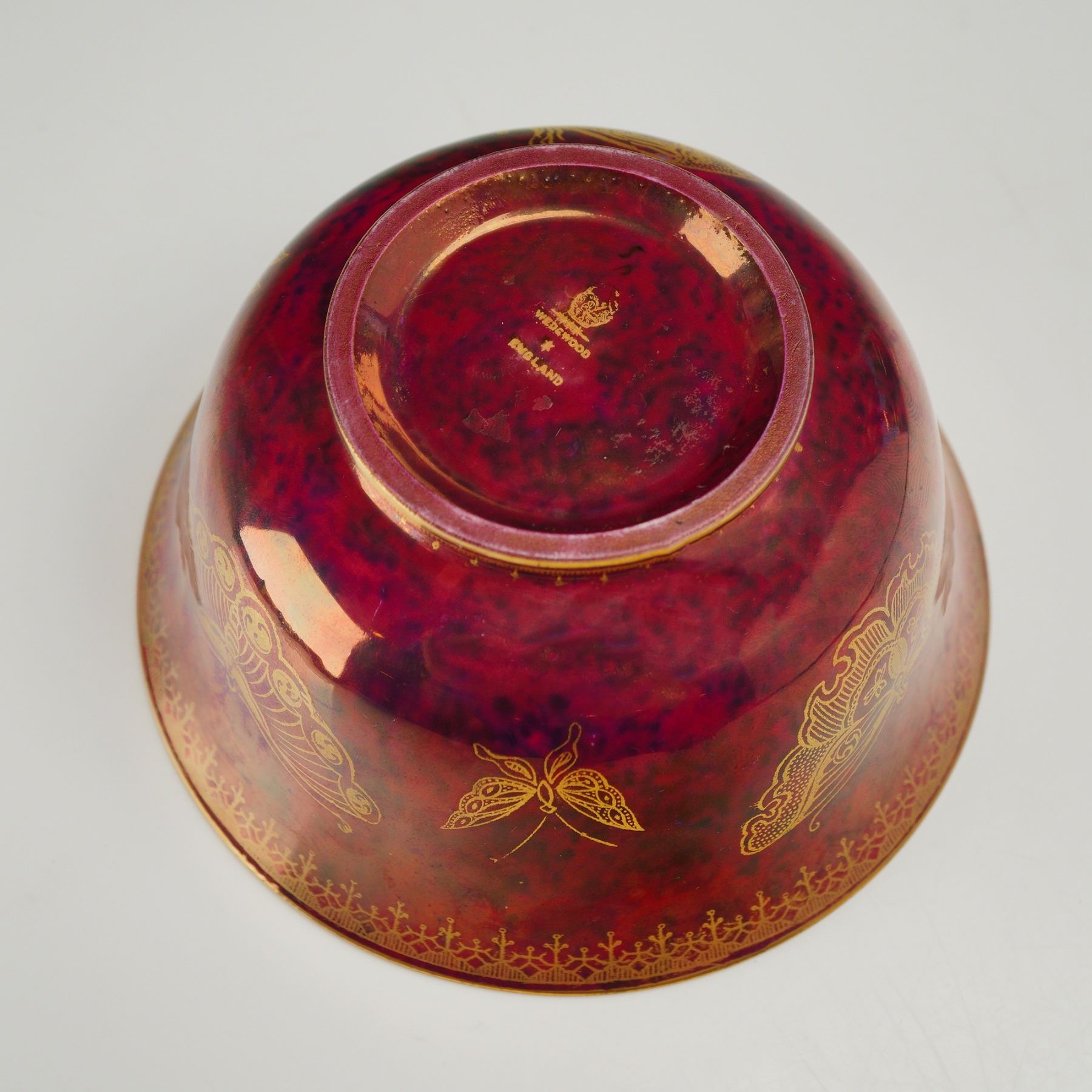 This Wedgwood bone china bowl is decorated in the Butterfly Luster pattern designed by Daisy Makeig-Jones. The vessel features a flared circular form supported by a raised foot. The exterior is finished in a mottled maroon or ruby red luster glaze and is ornamented with several stenciled gilt butterflies of various species. A delicate geometric gilt border encircles both the exterior rim and the foot. The interior of the bowl displays a contrasting iridescent pale yellowish-green mottled luster ground. A large, centrally positioned butterfly is rendered in multi-colored enamels including shades of blue, orange, and green, accented with heavy gilt highlighting. A matching gilt repeating border runs along the inner rim. The base of the bowl bears a printed mark in gold featuring the Portland Vase, the name WEDGWOOD, a star symbol, and the word ENGLAND.