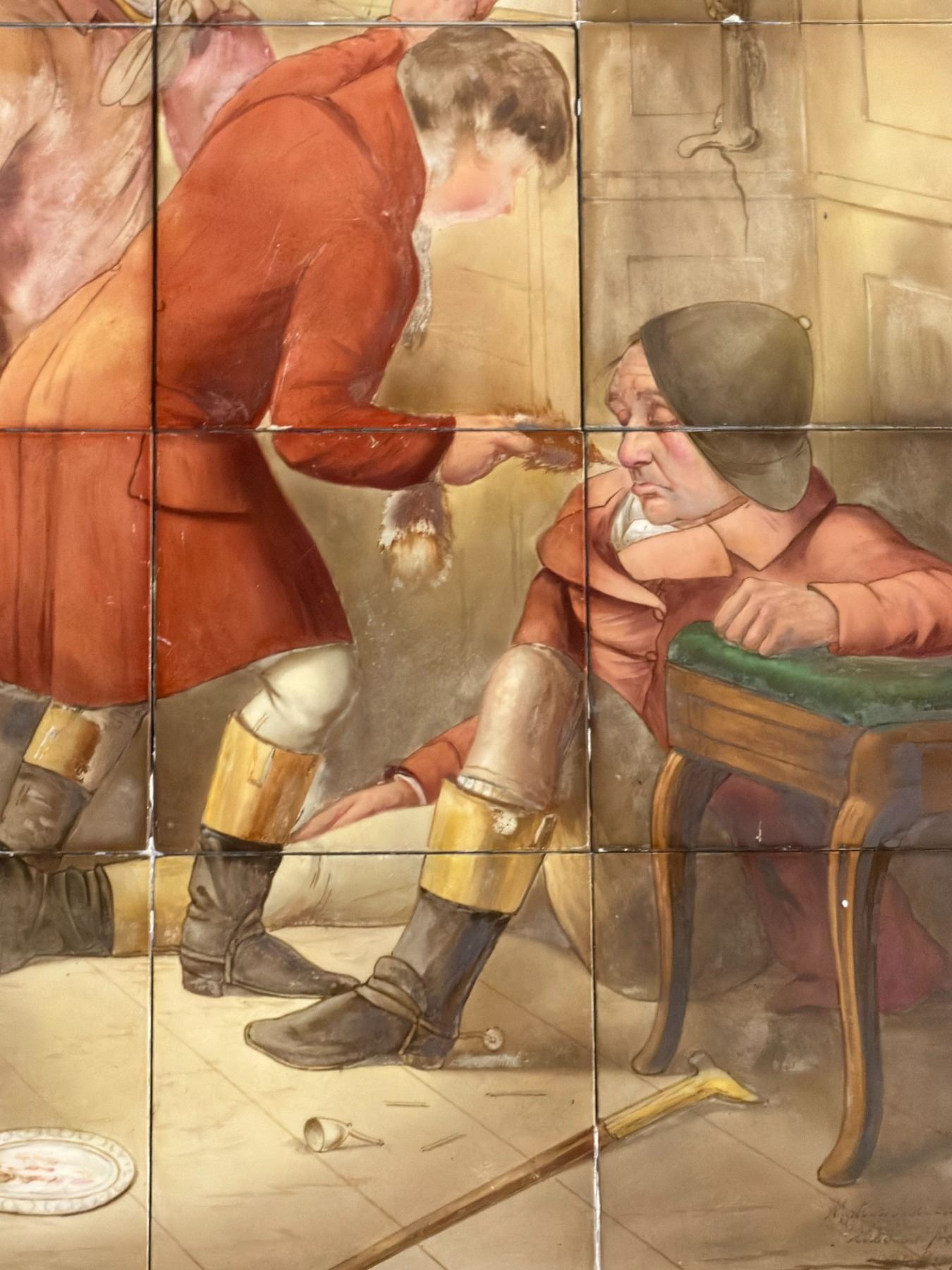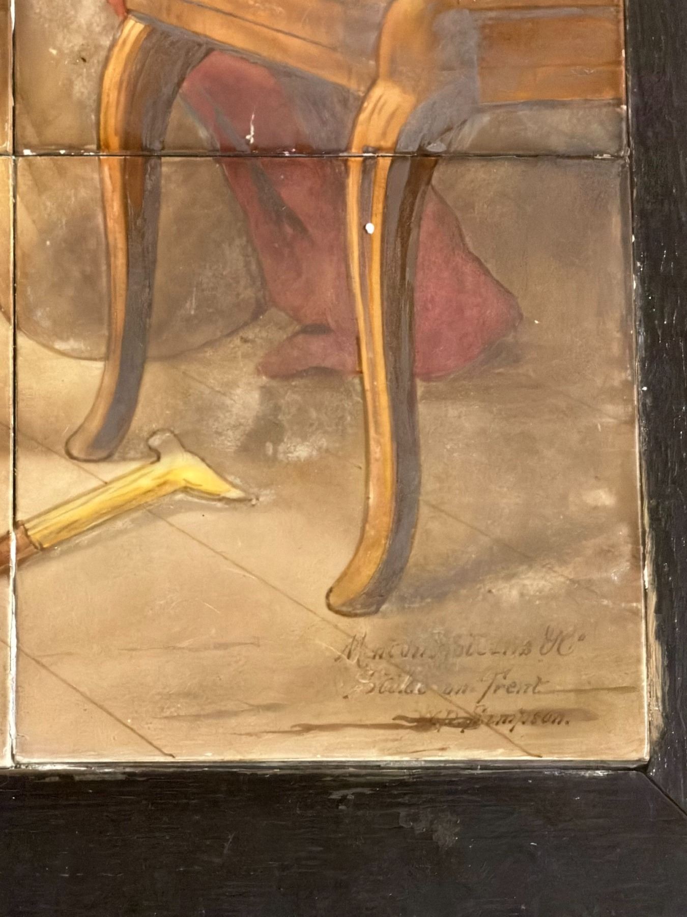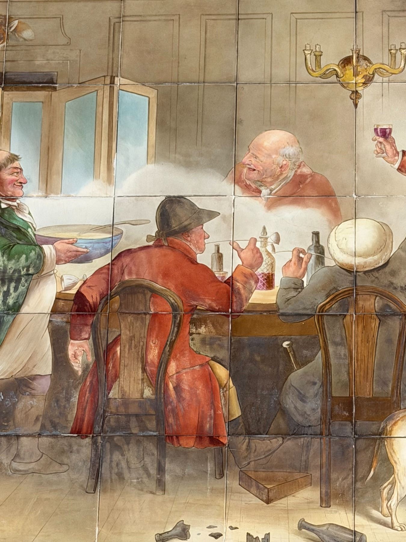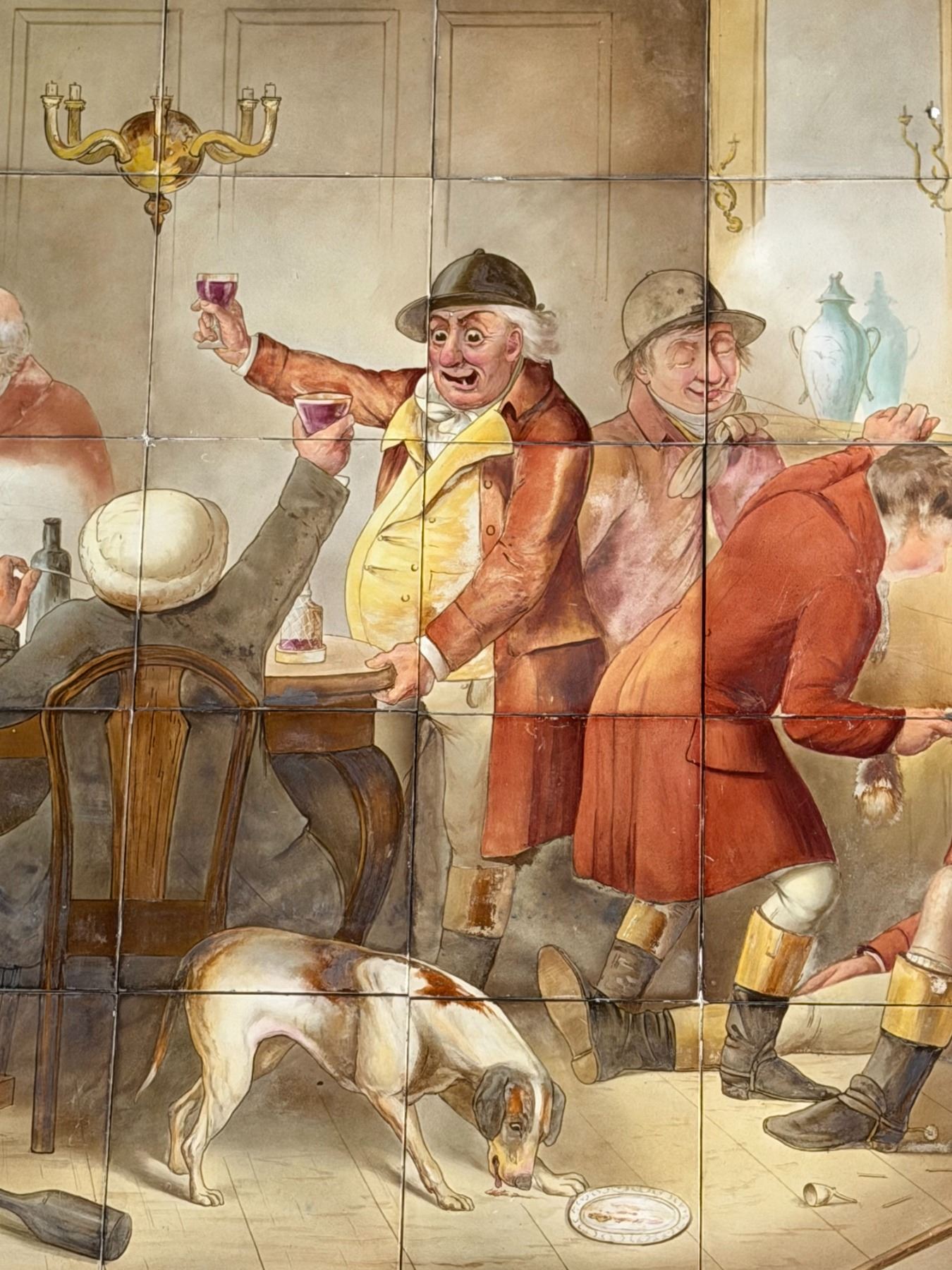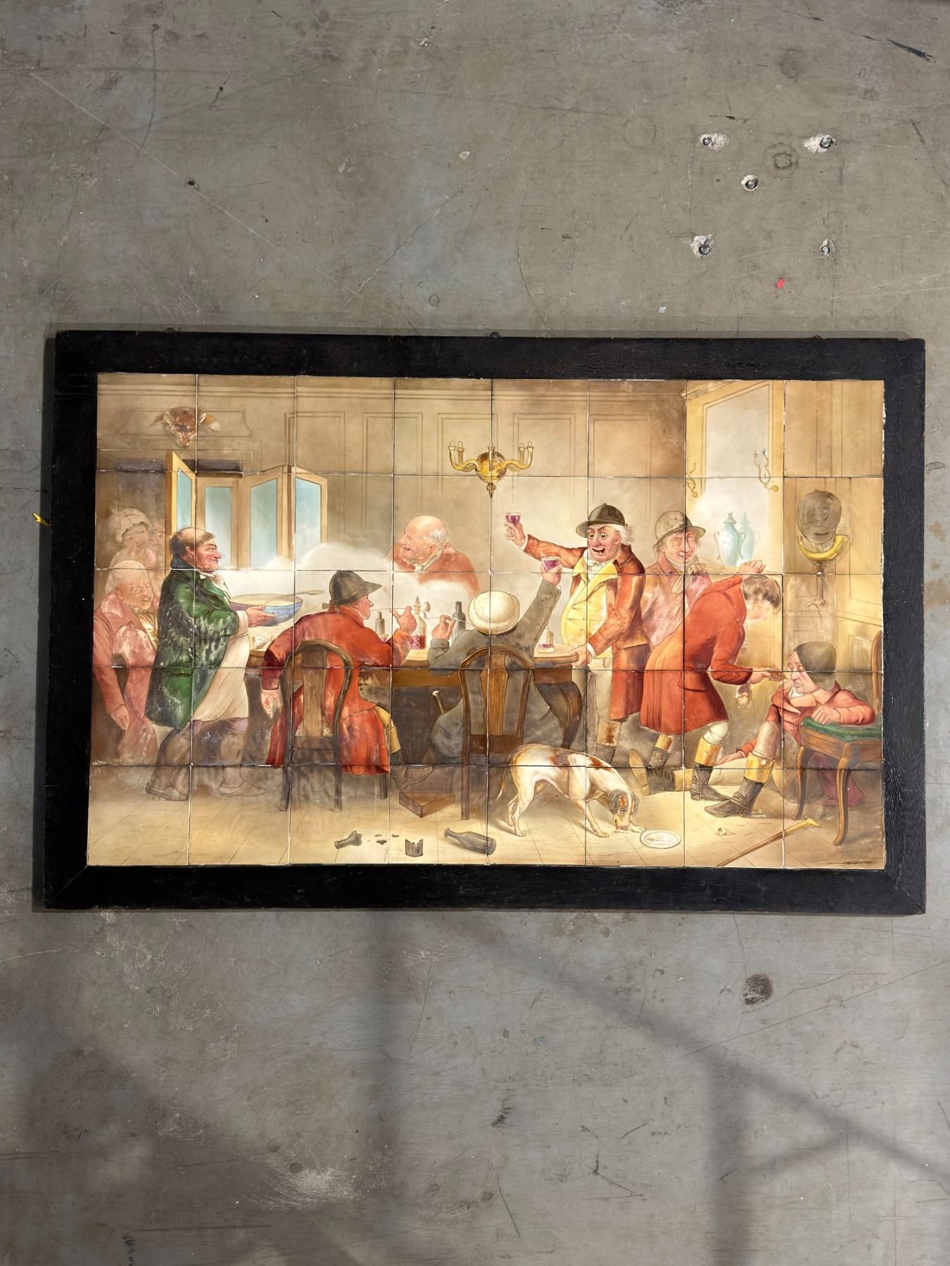 This charming hand-painted composition features a lively and humorous tavern scene of huntsmen gathered in drink and camaraderie, rendered with expressive character detail and period atmosphere. Signed "Minton Hollins & Co., Stoke-on-Trent" with "W.P. Simpson" at the lower right. The panel consists of 40 individual tiles, mounted on a wood backing and presented in a frame.