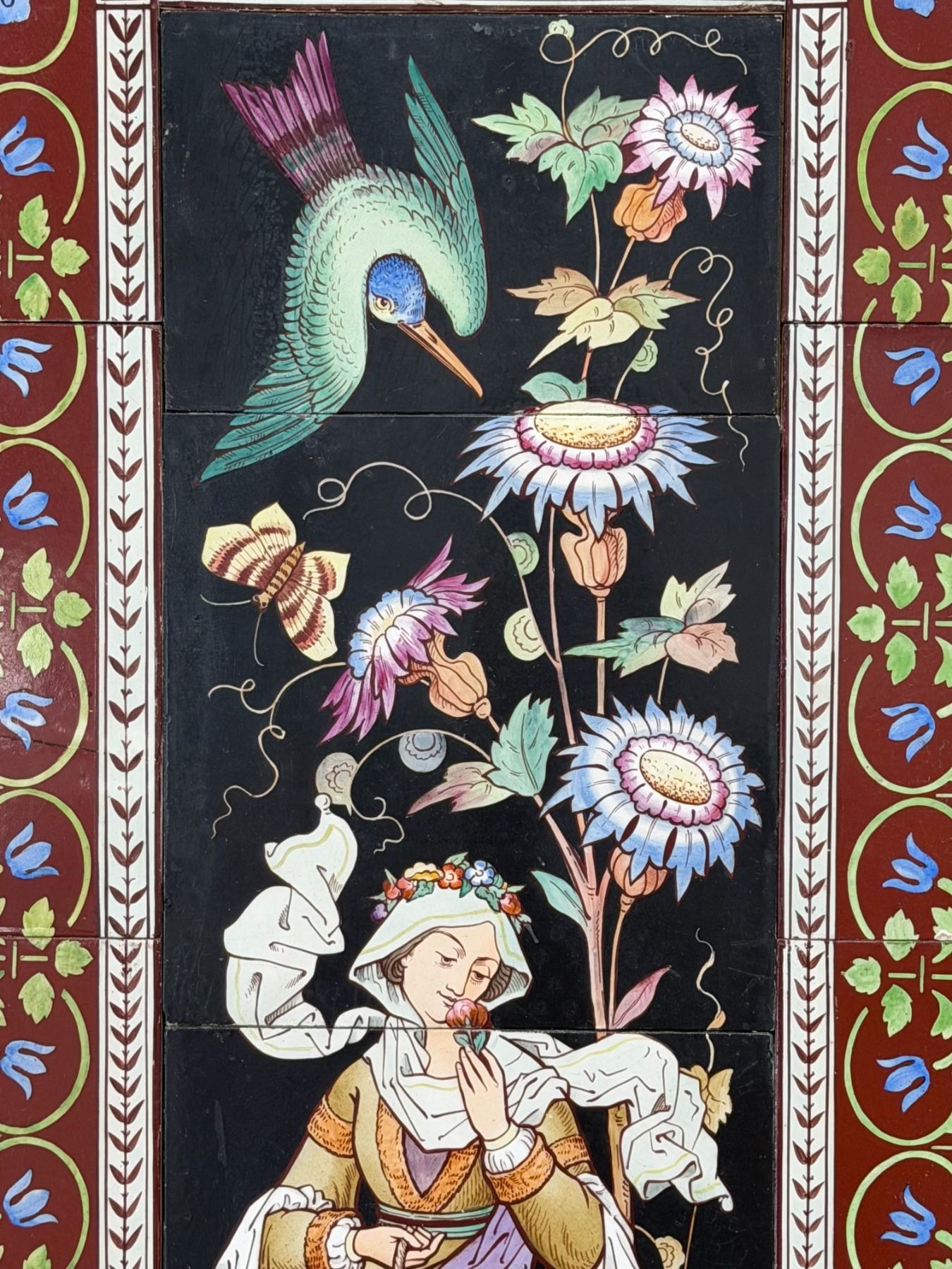 Late 19th century 16-tile panel housed in a gilt wood frame. The central scene depicts a woman in stylized medieval attire wearing a lavender gown with ermine-style trim and a floral crown, holding a woven basket of flowers, set against a black ground. Surrounding decoration includes oversized stylized flowers, a hummingbird in green and blue, and a butterfly. The central image is framed by a white foliate spearhead border and a wide burgundy border with a continuous scrolling vine of blue and pink flowers. Frame size: 24.25"W x 48"H x 2.25"D. Sight size: 17.75"W x 41.5"H.