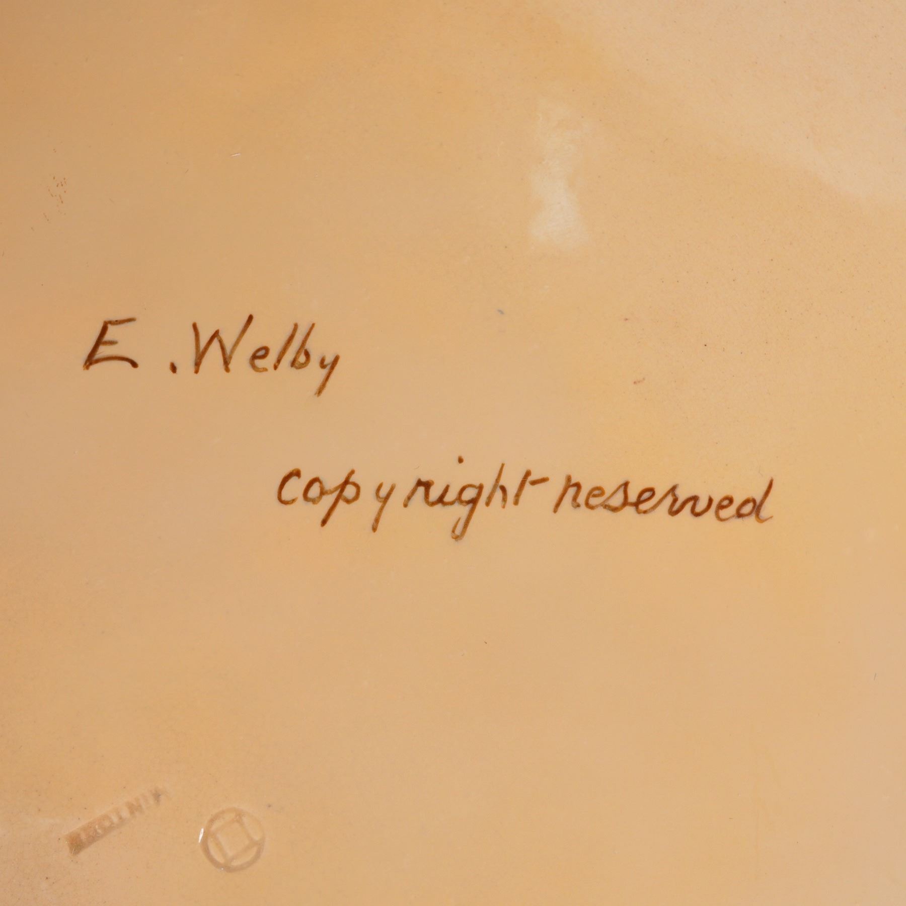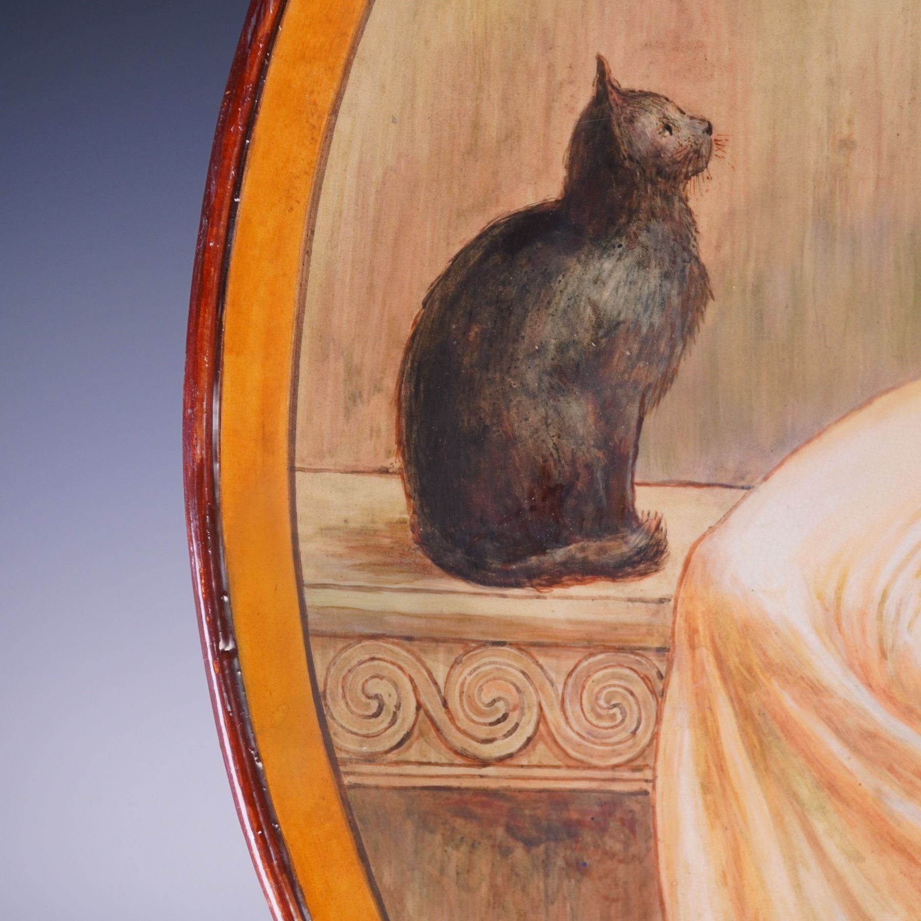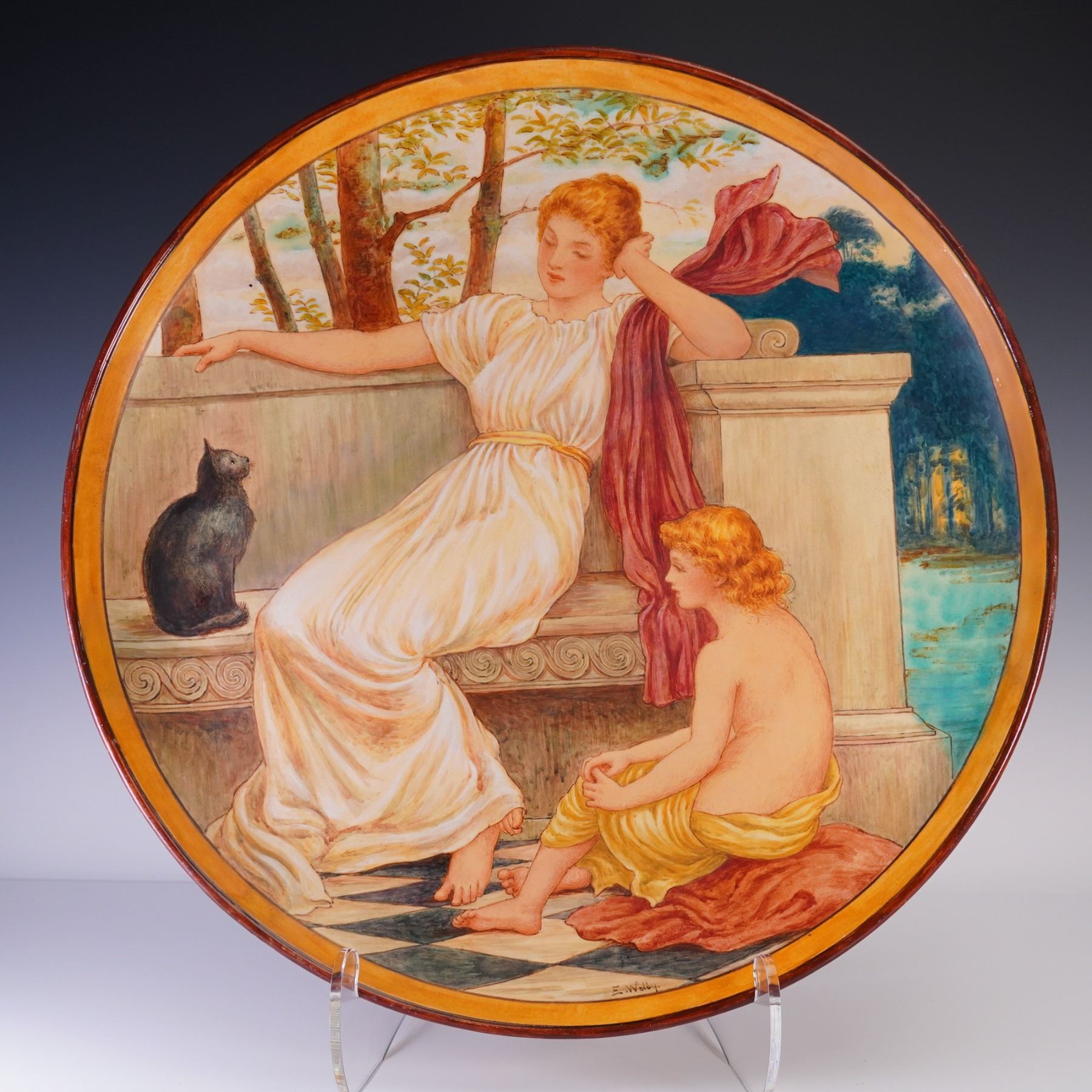 A large, decorative charger plate depicting a woman in white robe reclining on a stone bench. She has brown hair and rests her head on her hand with the other arm outstretched, looking at a black cat also sitting on the bench. On the ground a young woman wearing a brown robe sits and looks up at the woman on the bench. The floor has a chequerboard design in blue and white. Trees and a green bush are painted in the background. Signed E. Welby. Minton impressed backstamp.