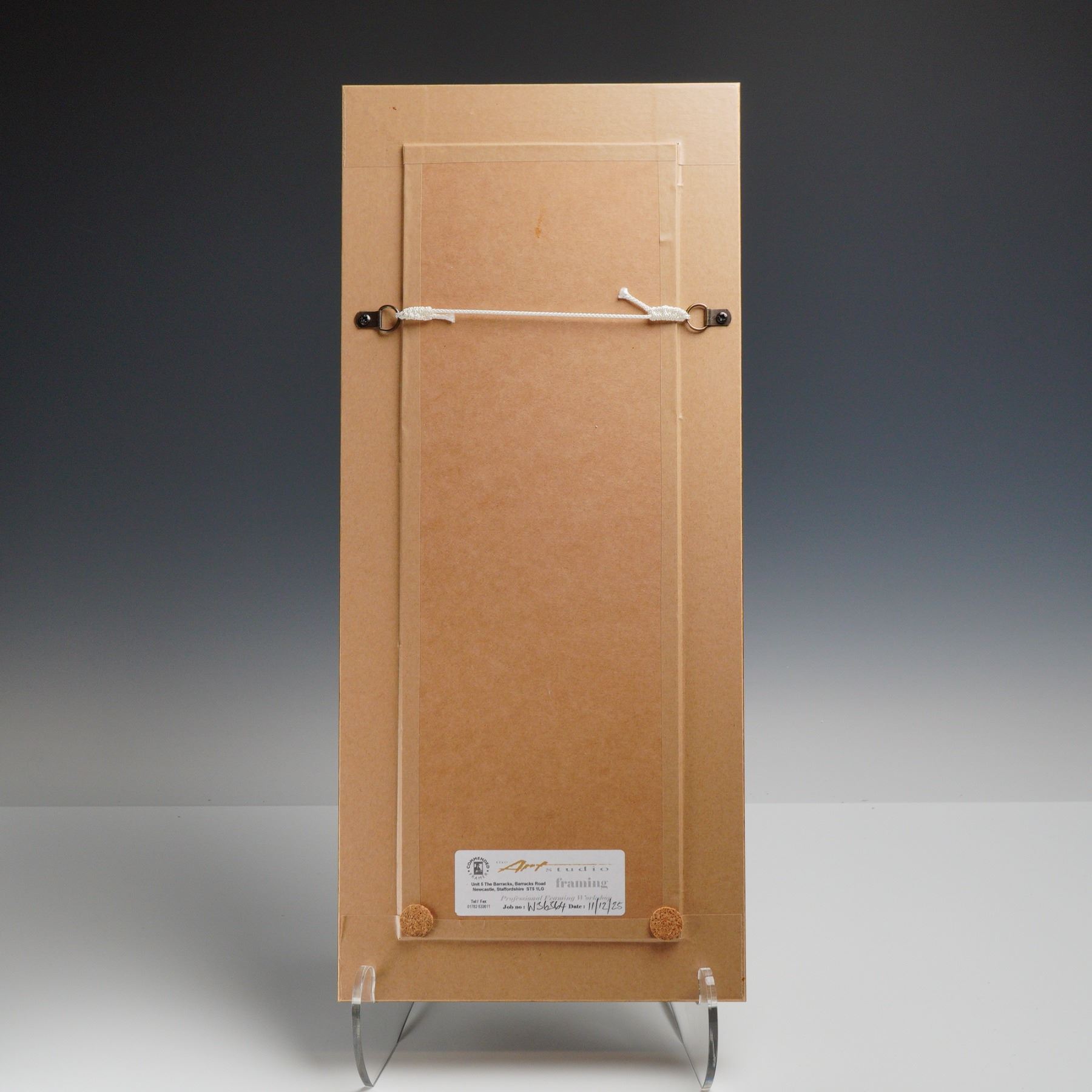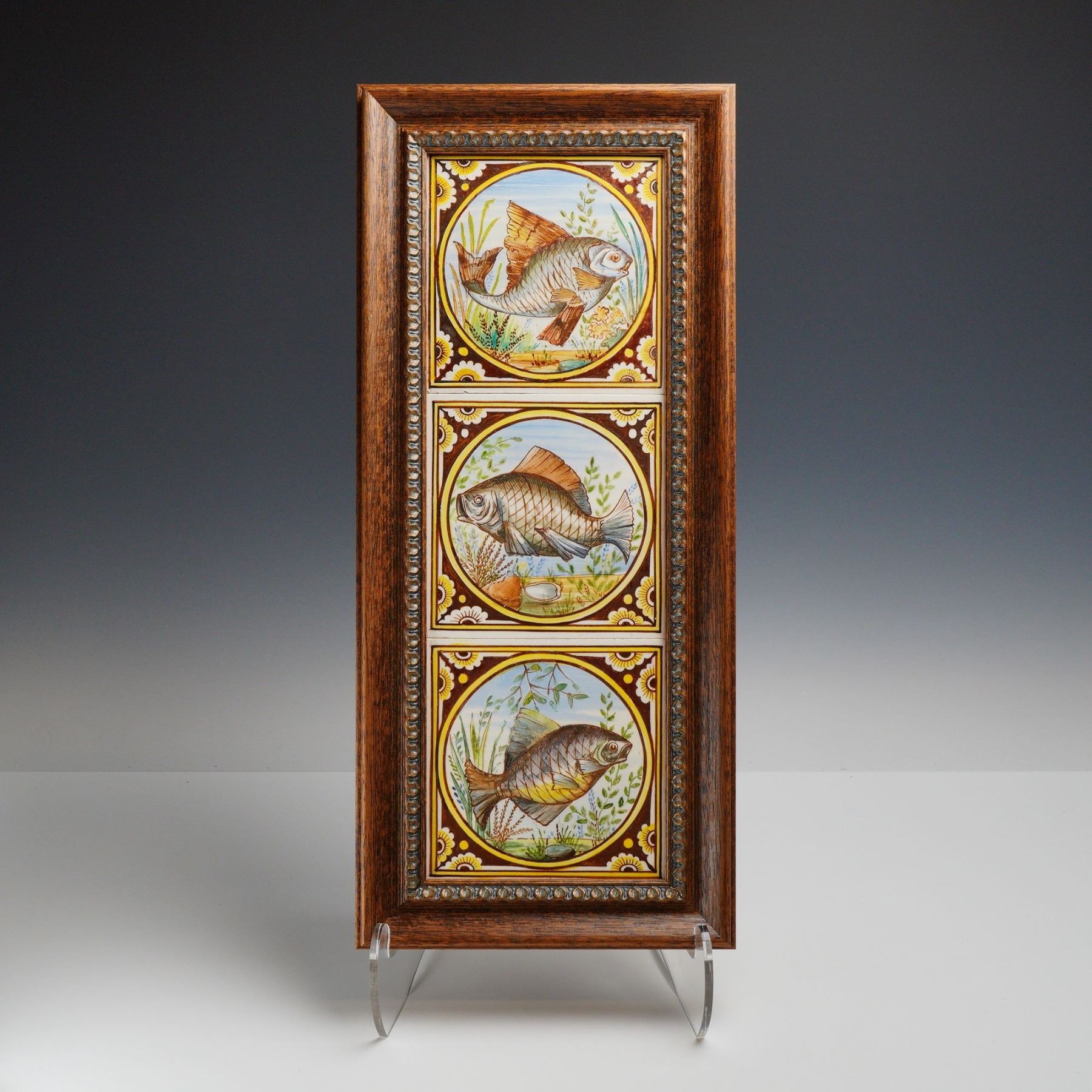 This wooden framed artwork consisting of 3 hand-painted ceramic tiles depicting fish and flora with brown and yellow accents is attributed to the Staffordshire manufacturer Minton Hollins and Co., dating to approximately 1880. The set is arranged as a vertical triptych of square earthenware tiles. Each tile features a central circular medallion depicting a specific fish species rendered in naturalistic tones of ochre, brown, and blue among aquatic plants. The spandrels are decorated with stylized sunburst and floral motifs in yellow and brown glazes, characteristic of the Aesthetic Movement. The production technique involves transfer-printed outlines with hand-painted color washes under a clear glaze. The tiles are set in a dark-stained wooden frame. The reverse includes a modern professional framing label from Art Studio Framing in Newcastle, Staffordshire, UK, which notes a job date of 11/12/25.