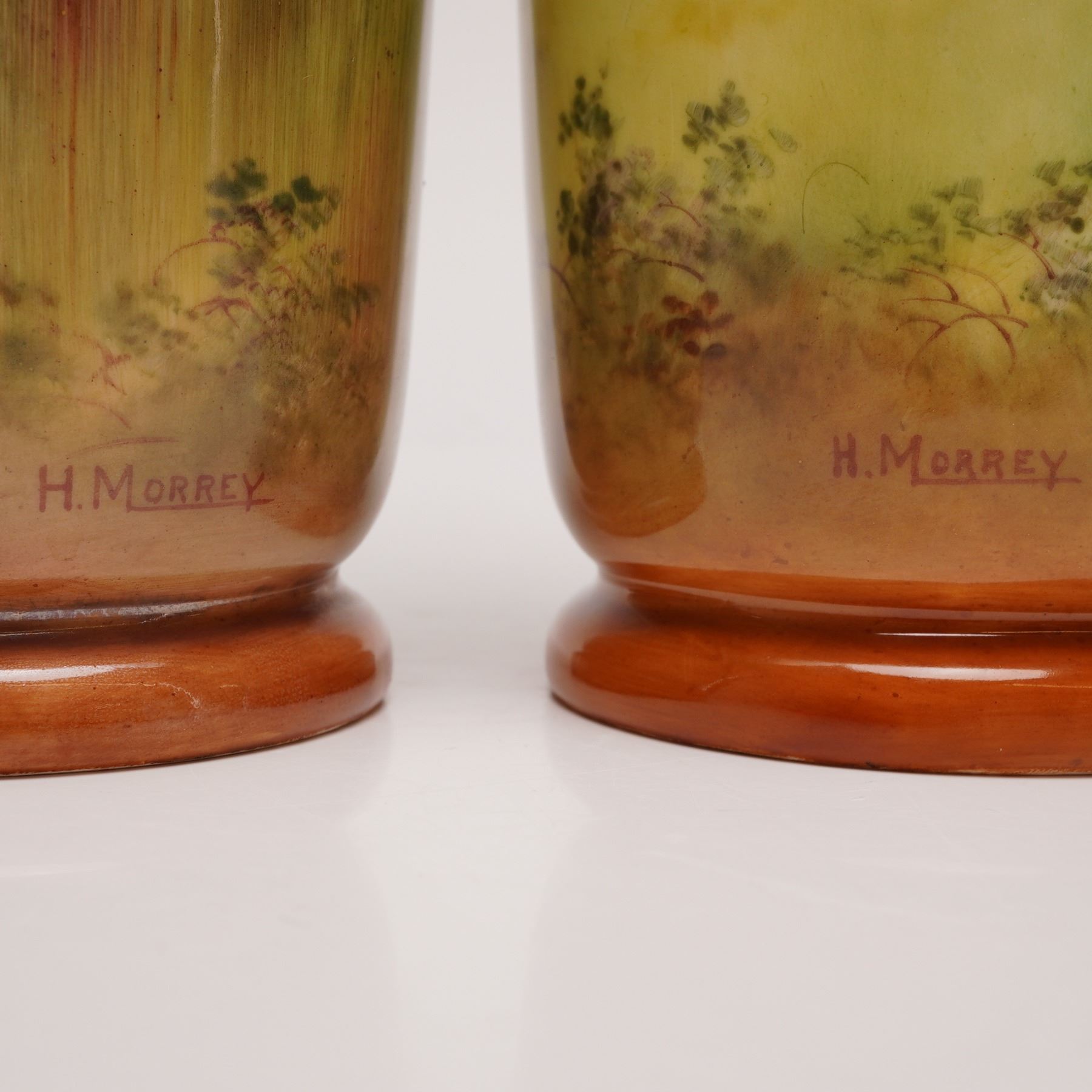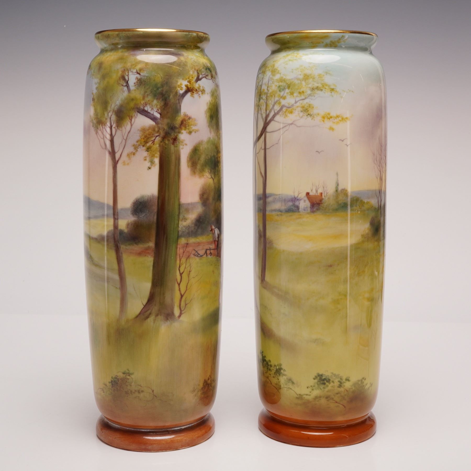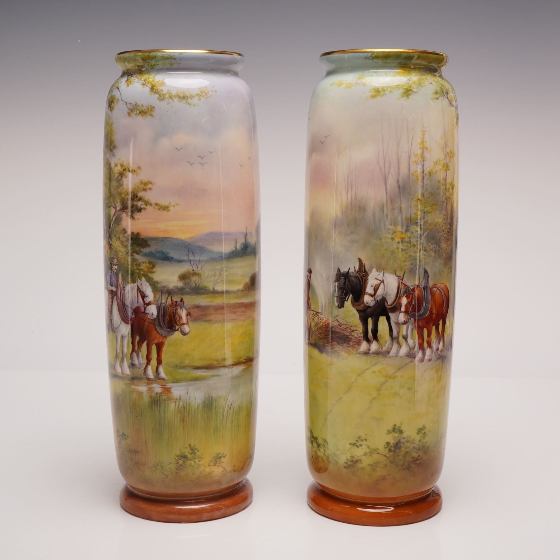 A pair of English porcelain vases in cylindrical form, each hand-painted with complementary but distinct pastoral scenes. Both depict countryside settings with farmers and working horses. One vase shows a farmer tending a burning pile of sticks, while the other depicts a mounted farmer alongside another working the land. Each vase is signed by Harry Morrey near the lower body. The rims are finished with gilding, and both vases bear the Royal Doulton backstamp on the underside.