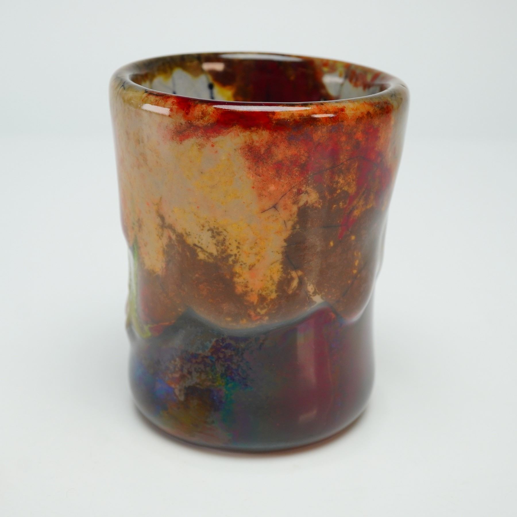 Featuring a high-temperature, copper-based reduction glaze. The glaze displays varied streaked colors including deep reds, ox-blood tones, purples, browns, oranges, and occasional greens or blues. The surface is thick and flowing with a crackled, textured appearance characteristic of the Chang style developed in the 1920s by Royal Doulton designers. The underside bears the Royal Doulton Chang backstamp, and the artists' initials.