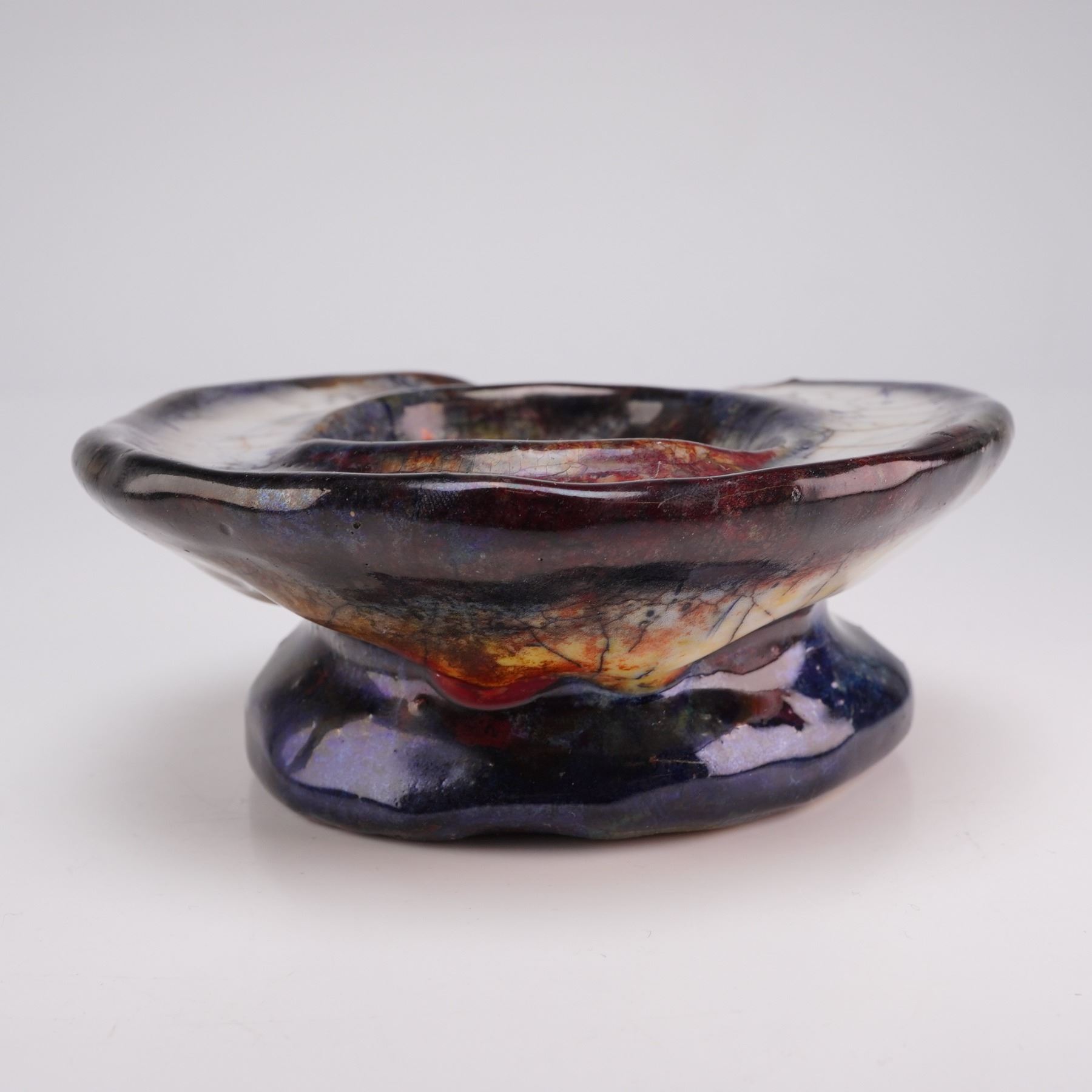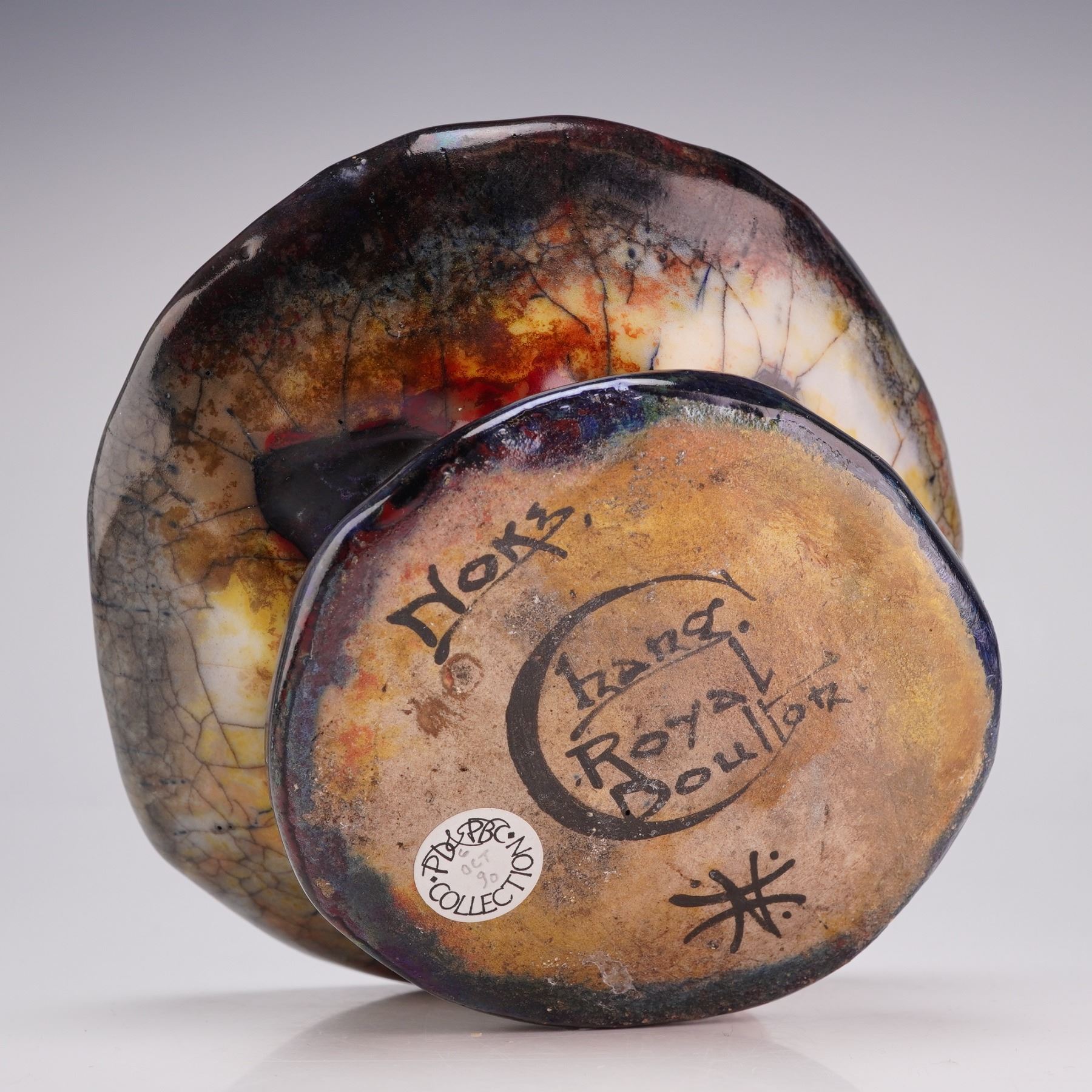 This Royal Doulton Chang mushroom dish is a footed earthenware vessel featuring a thick, multi-layered volcanic glaze. The form consists of an irregular, undulating rim set upon a squat pedestal base. The decoration utilizes the Chang glaze technique, characterized by a heavy white overglaze with wide-spaced crackle that reveals underlying layers of crimson red, ochre yellow, and deep blue. The pedestal base is finished in a lustrous, iridescent dark blue glaze. The underside of the base bears hand-painted marks in black pigment including the mark for Charles Noke and Harry Nixon, the word Chang partially enclosed in a circular stroke, and the manufacturer name Royal Doulton. Provenance sticker from PD & PBC Collection.