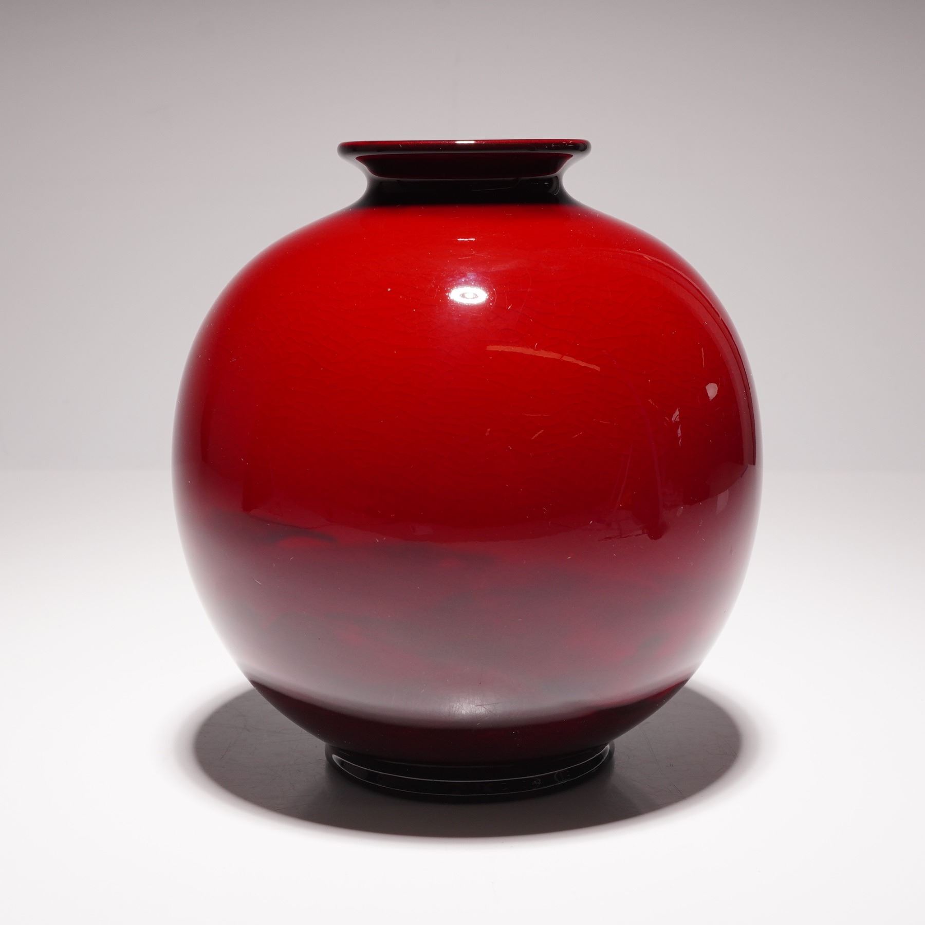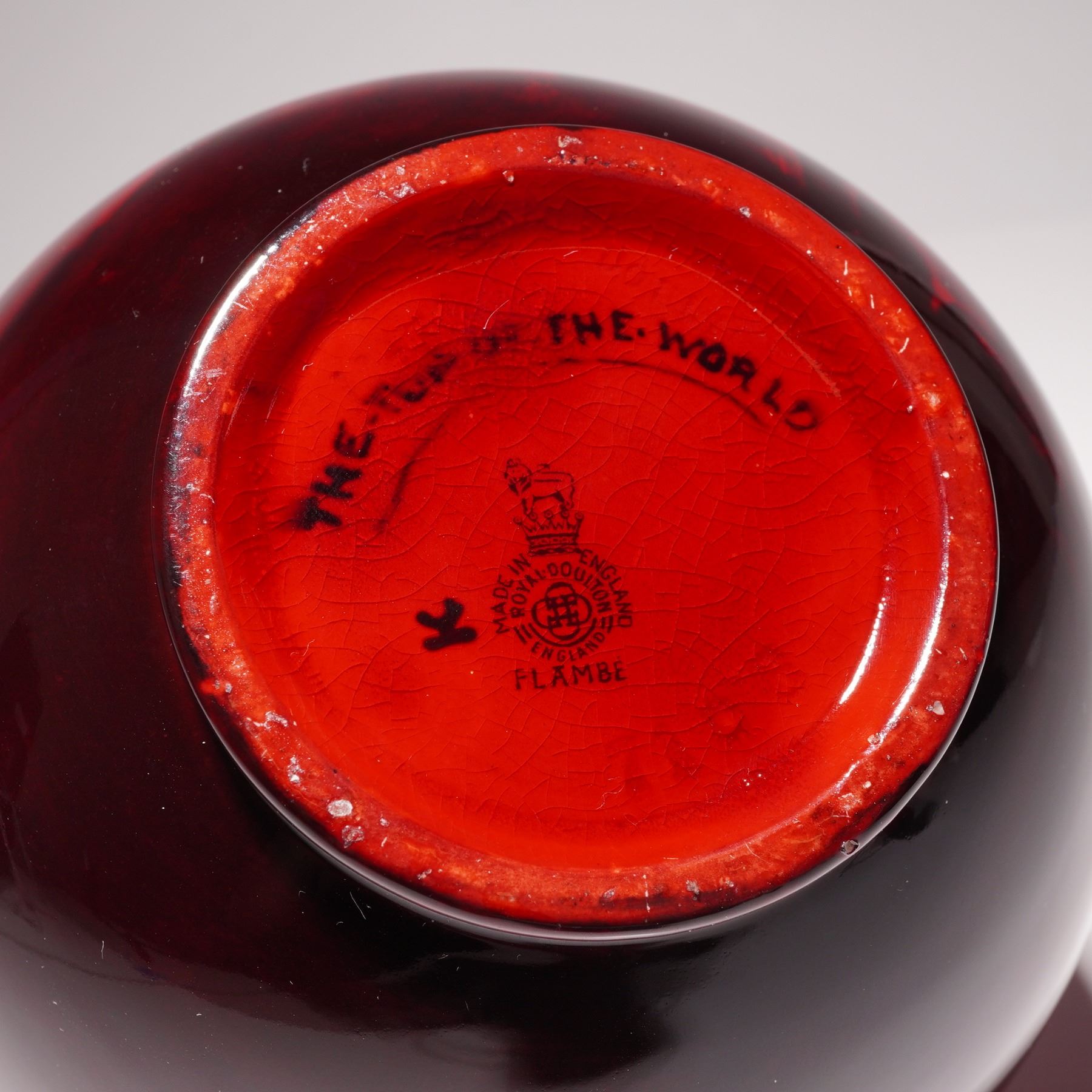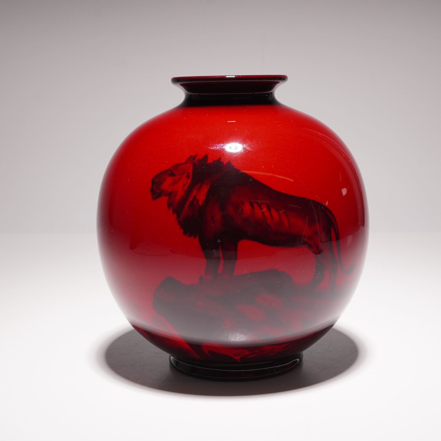 Features a globular body with a short, flared neck and a recessed foot. The piece is finished in a deep red flambe glaze, which is achieved through a high-temperature reduction firing process. The exterior is decorated with a dark silhouette depicting a lion standing on a rocky outcrop. The base of the vase bears the Royal Doulton Flambe backstamp.