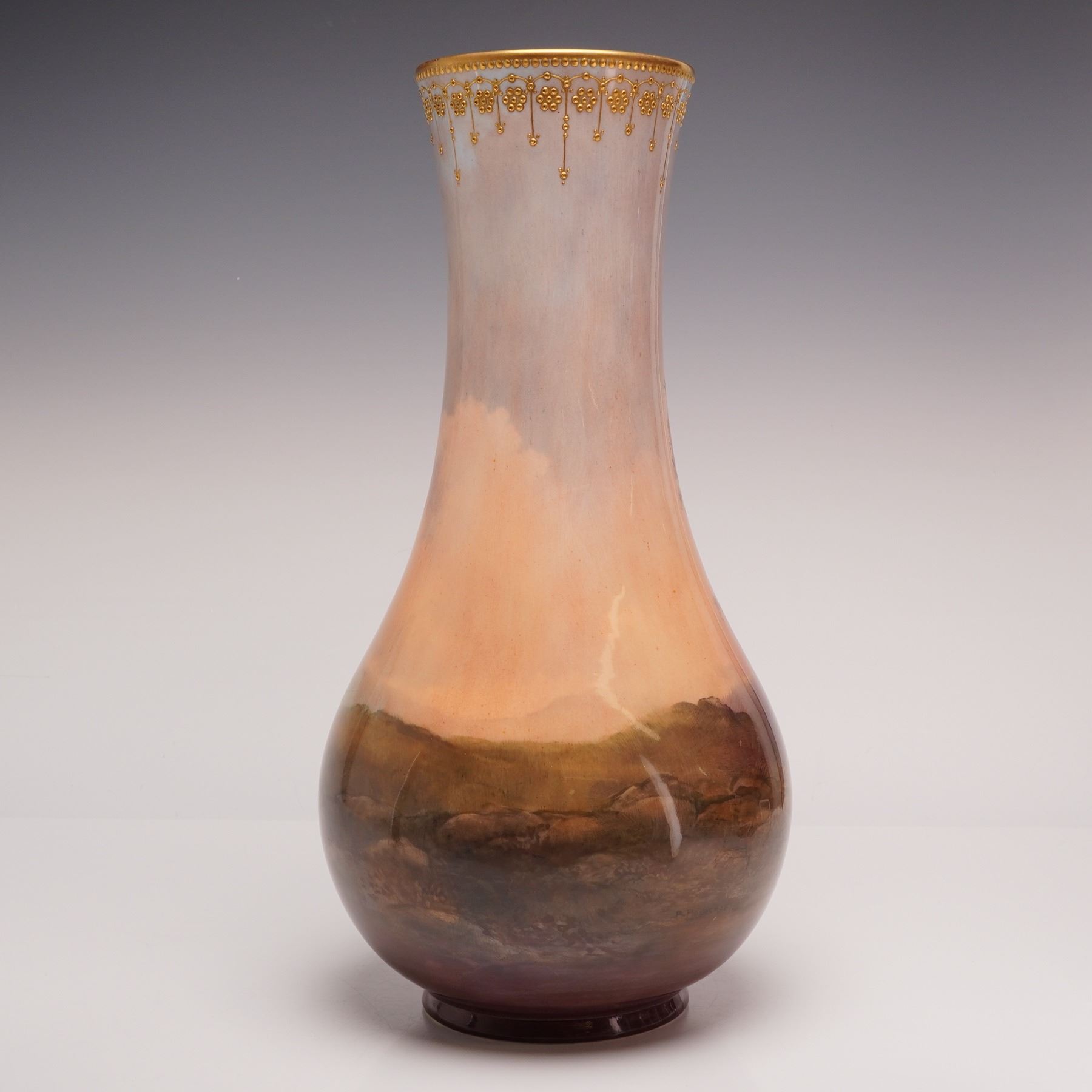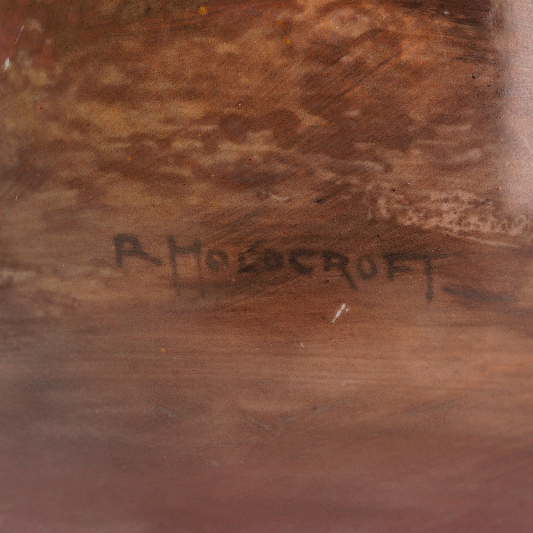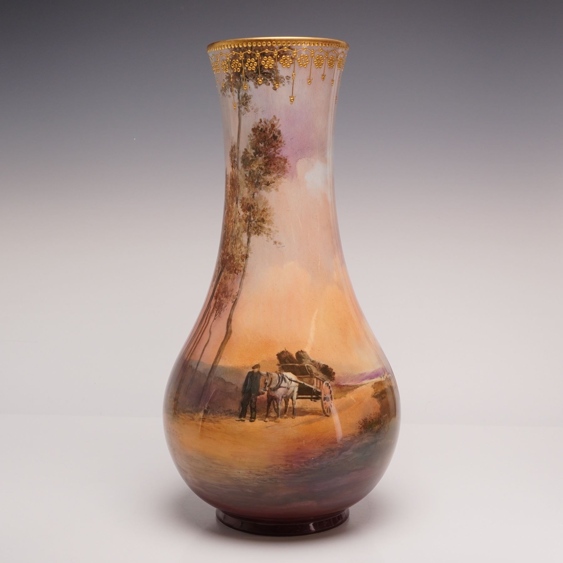 An English porcelain vase, hand-painted by Rowland Holdcroft. The vase depicts a man walking alongside a horse-drawn hay wagon on a dirt road. Trees line the path, and a farmhouse is visible in the distance. The vase has a flared rim decorated with gilded hand-painted beaded relief. A "Flambe" glaze covers the surface, highlighting the colors and details of the scene. The piece is signed by Rowland Holdcroft on the lower body. Royal Doulton Flambe marked on the underside.