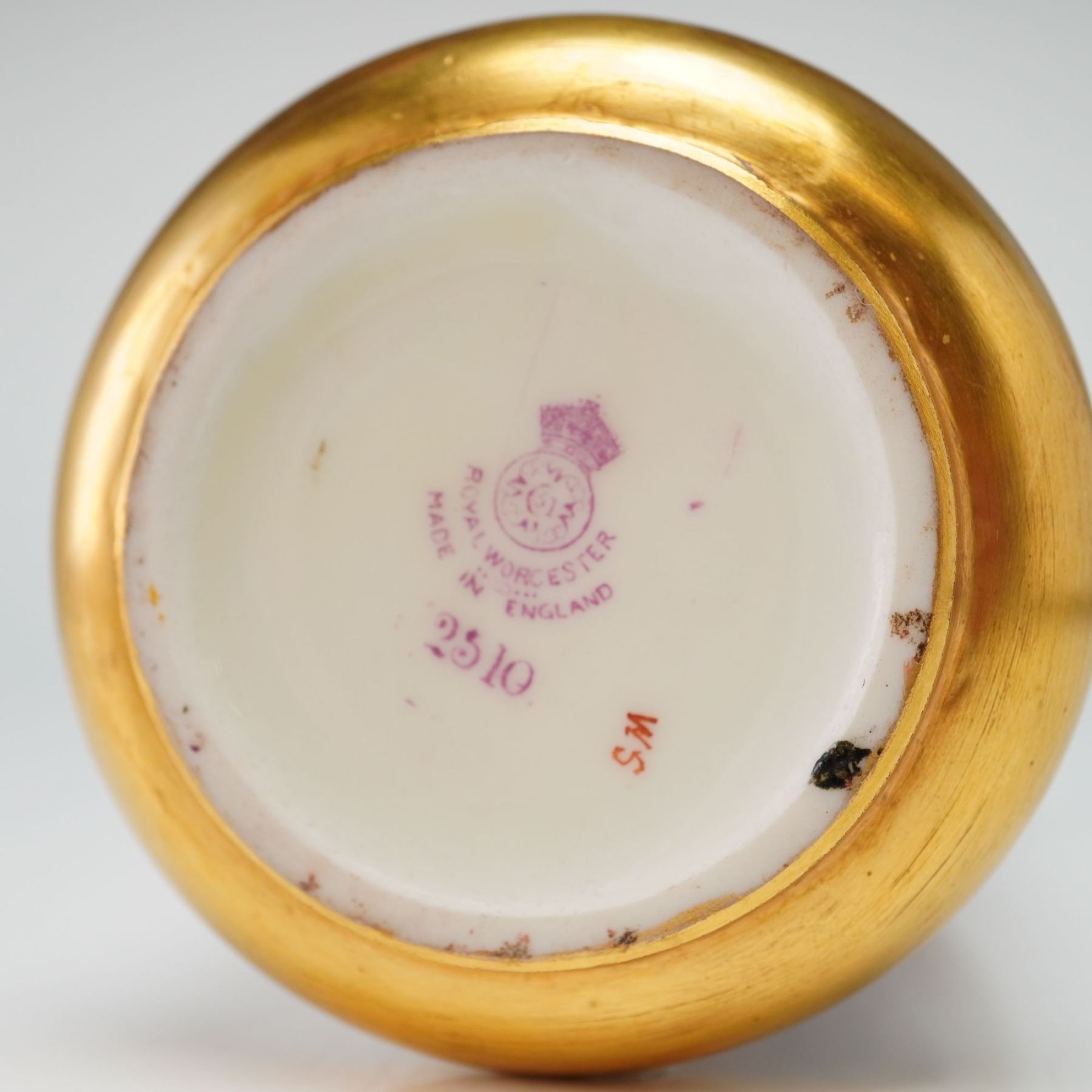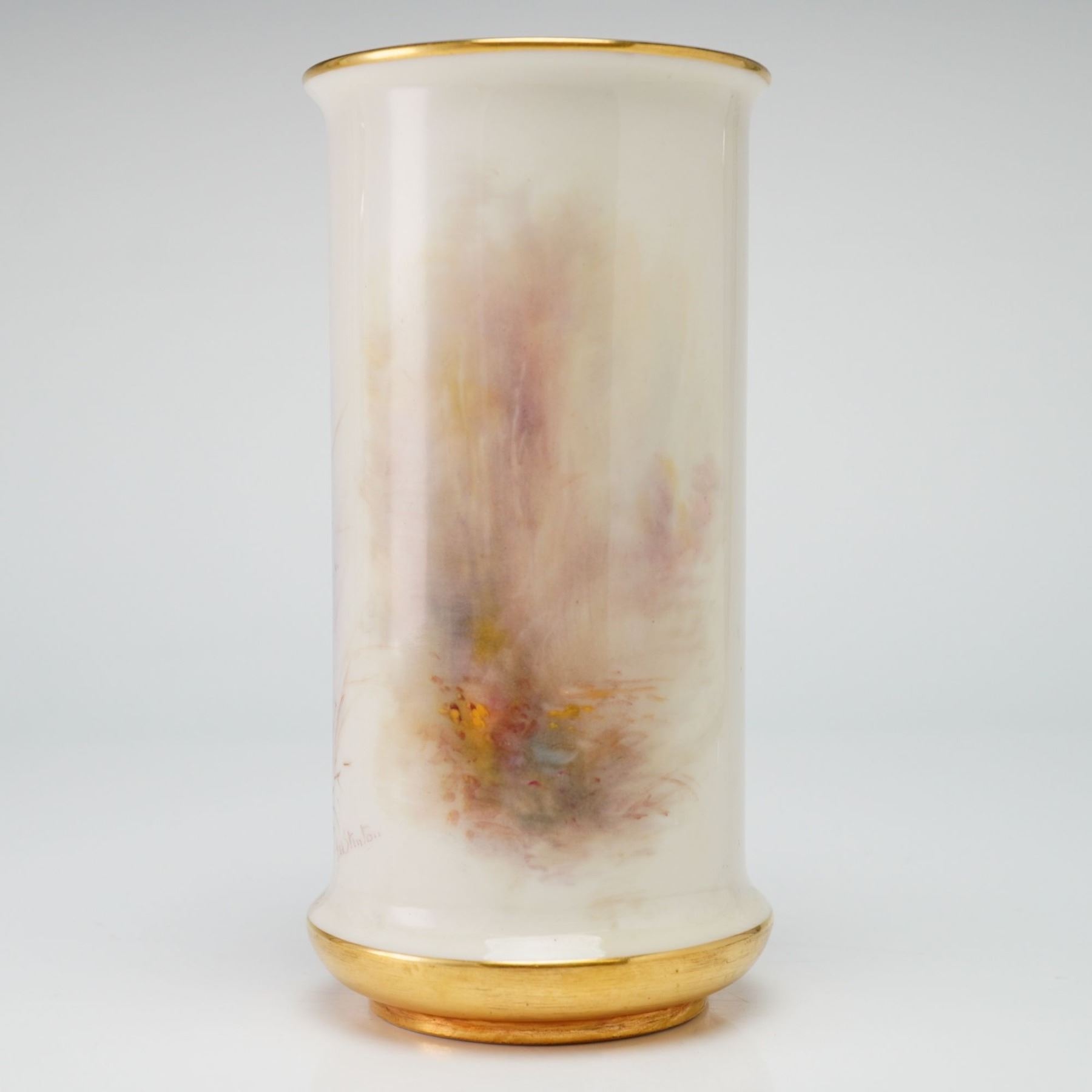 James Stinton (1870-1951) of the Stinton family of Royal Worcester artists. Porcelain cylindrical spill vase, shape number 2510, decorated with a hand-painted duck motif depicting mallards in flight over water and cattails. The scene is signed "Jas Stinton" at the lower left. The vase has a flared rim and stepped circular base with gilt accents. The underside bears the Royal Worcester backstamp.