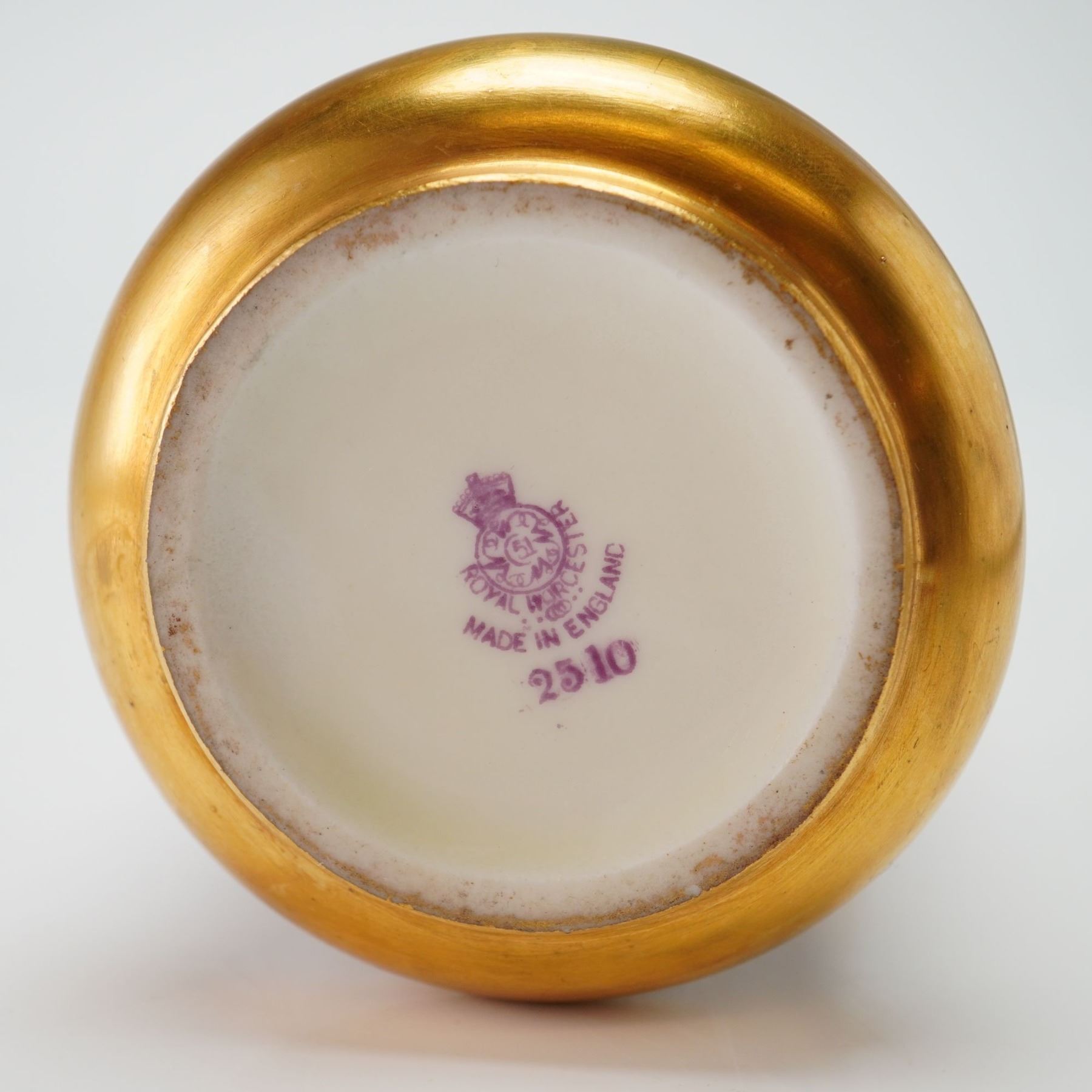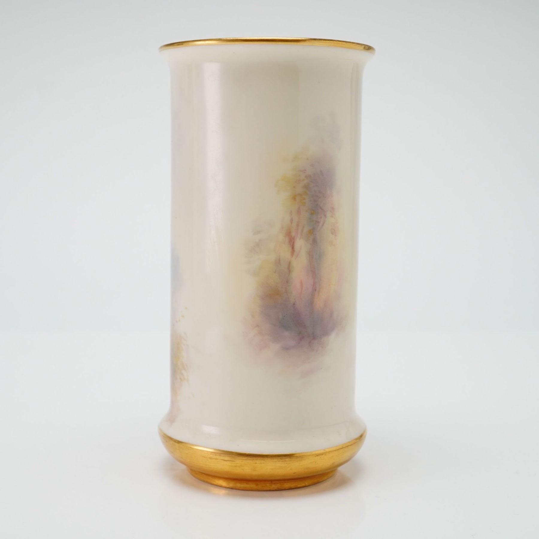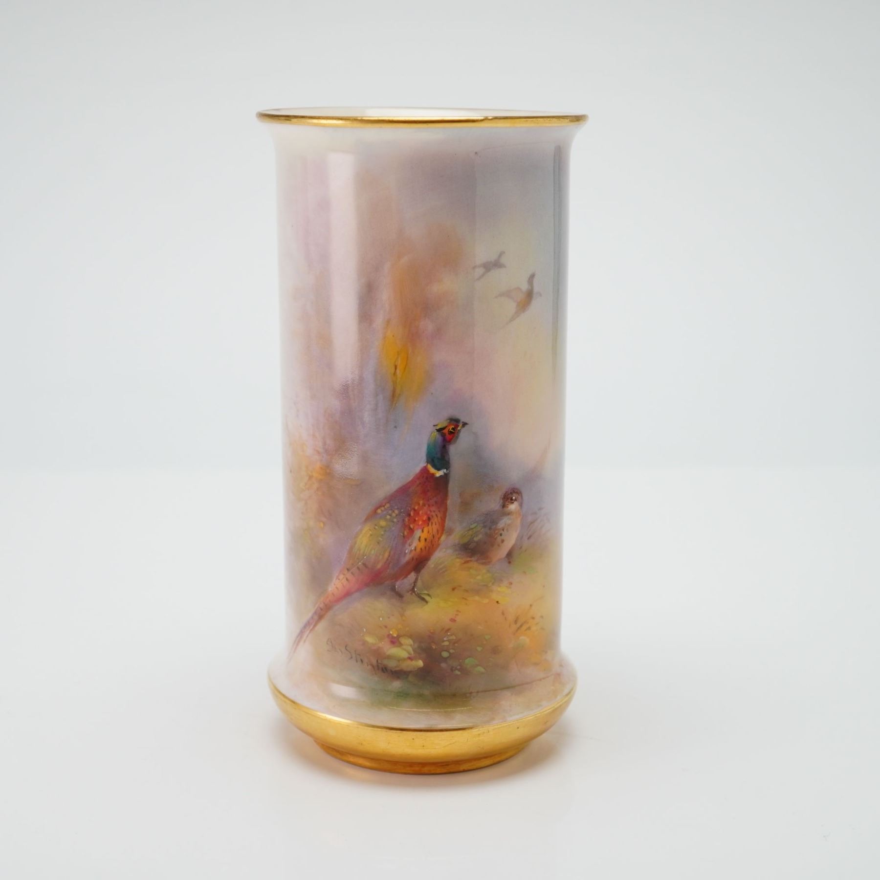 Porcelain spill vase, shape no. 2510, designed by James Stinton (1870-1951). The cylindrical body is hand-painted with a cock and hen pheasant set within a misty moorland landscape, signed "Jas Stinton" at the lower left. The vase features a flared rim and circular base, both with gilt decoration. The underside bears the Royal Worcester backstamp and 2510.