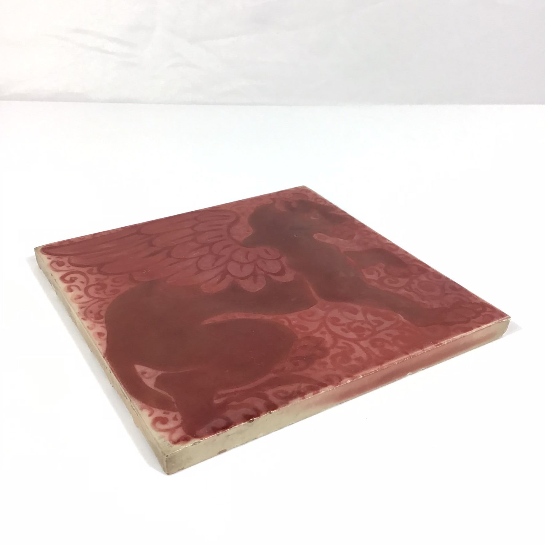 This hand-painted ceramic tile is an earthenware architectural piece featuring a red luster glaze. The central motif depicts a mythological winged creature, resembling a winged lion, shown in profile against a dense scrolling foliate background.
