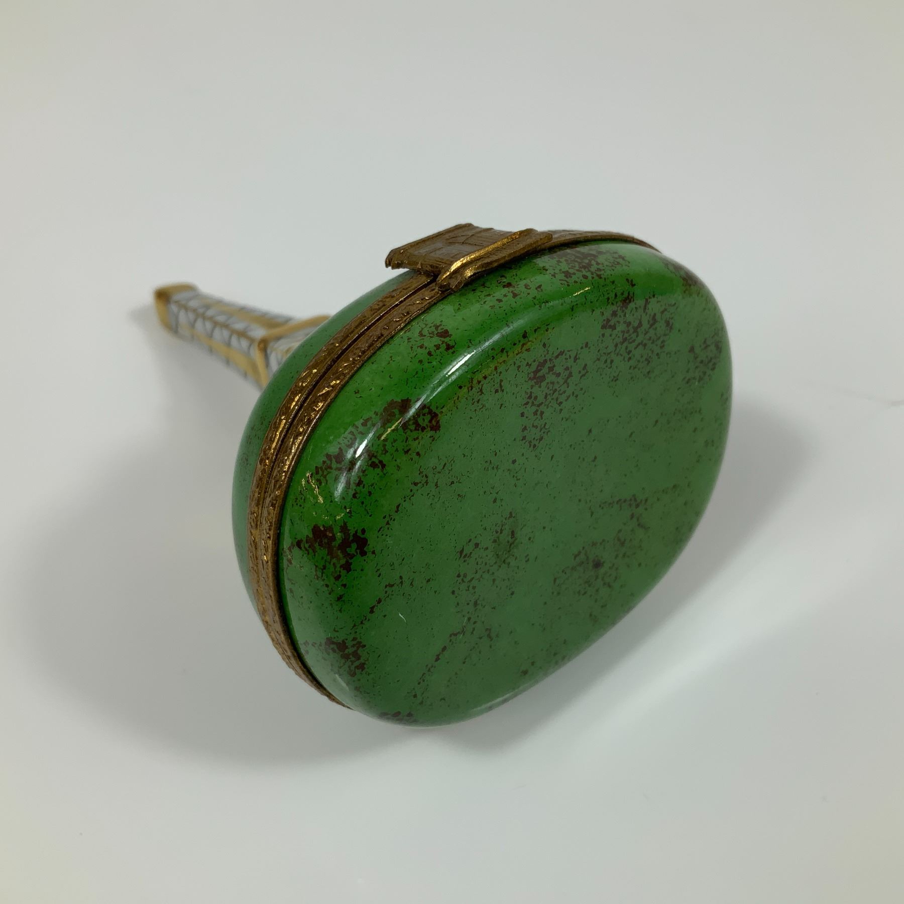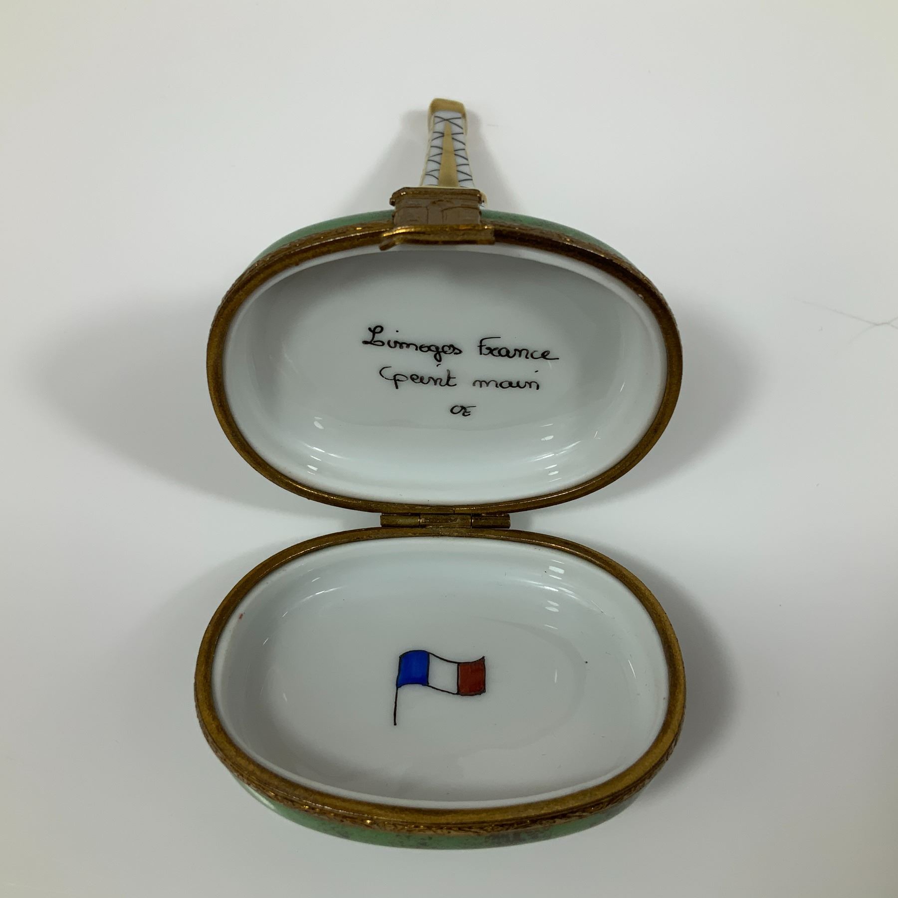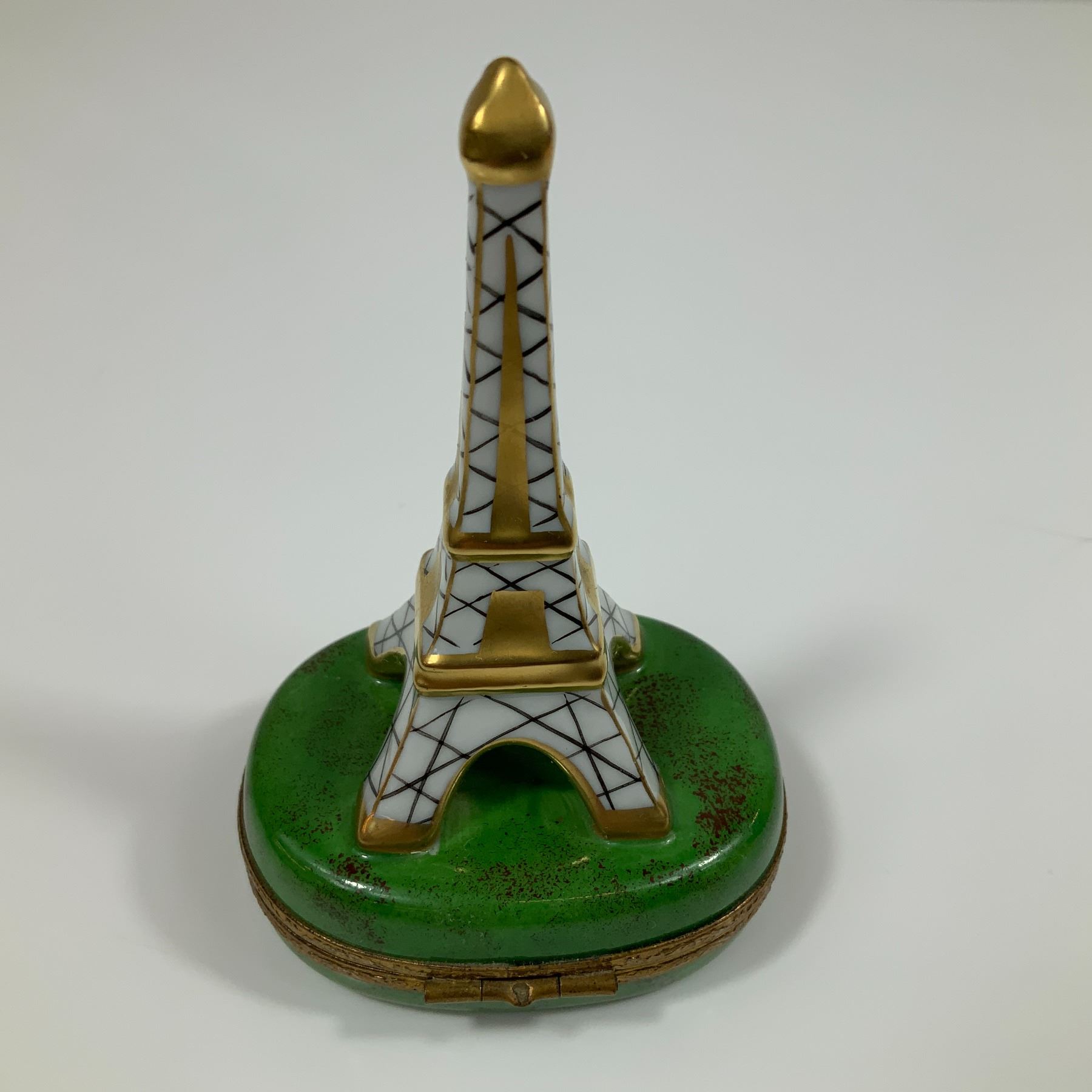 A Limoges porcelain hinged trinket box featuring a miniature model of the Eiffel Tower set upon an oval base. The tower is decorated with a hand-painted black lattice pattern over a white ground, accented with gilt highlights at the corners, intermediate levels, and the tip. The oval base is finished in a green glaze with mottled brown and reddish decoration representing the Champ de Mars. The interior of the bottom half of the box features a hand-painted depiction of the French tricolor flag. The box is fitted with a decorative gold-tone metal mount and hinge, with a clasp shaped in the form of the Arc de Triomphe. The interior of the lid bears handwritten marks in black script reading Limoges France, peint main, and the initials OE.