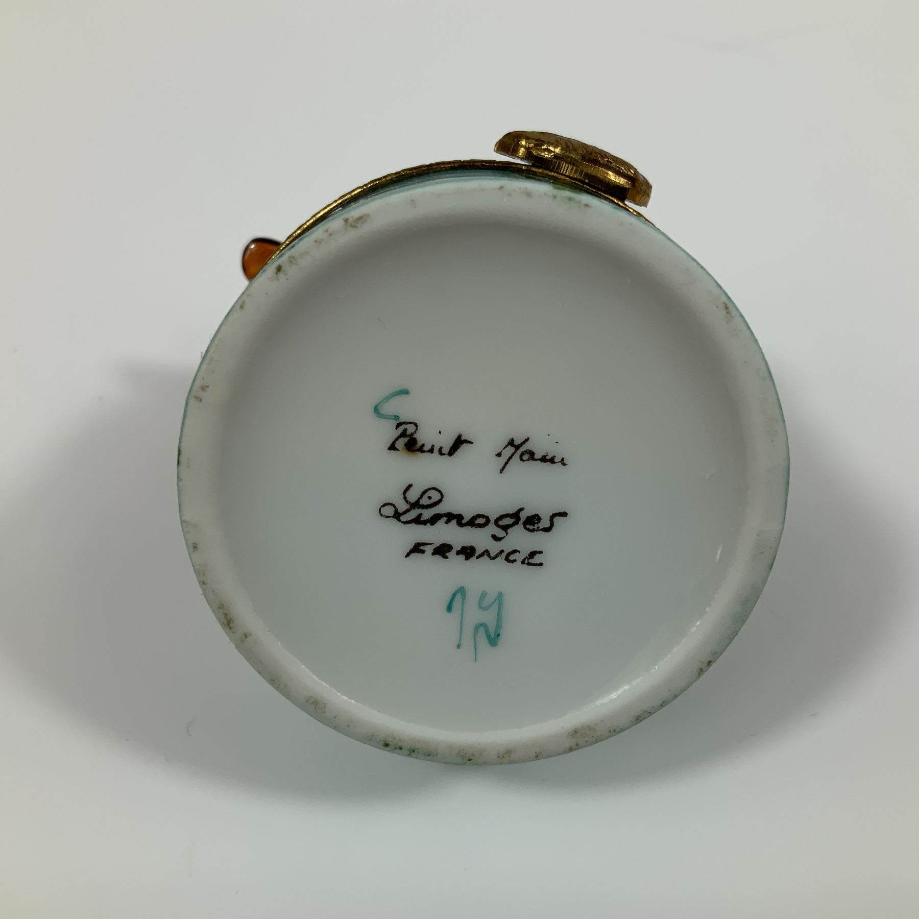 This genuine Limoges porcelain trinket box features a figural mallard duck lid and hand-painted decoration. The circular box is crafted from fine white porcelain and fitted with gold-toned metal mounts, including a decorative clasp shaped like a small duck. The lid is modeled as a mallard with a green head, orange beak, and detailed brown, white, and black plumage. The cylindrical base displays a pond scene with yellow water lilies and green reeds set against a vibrant turquoise ground. A small green leaf motif is hand-painted on the interior bottom. The underside is marked with the hand-painted inscriptions Peint Main, Limoges, and FRANCE in script and block lettering. Additional turquoise markings include a letter C and stylized initials.