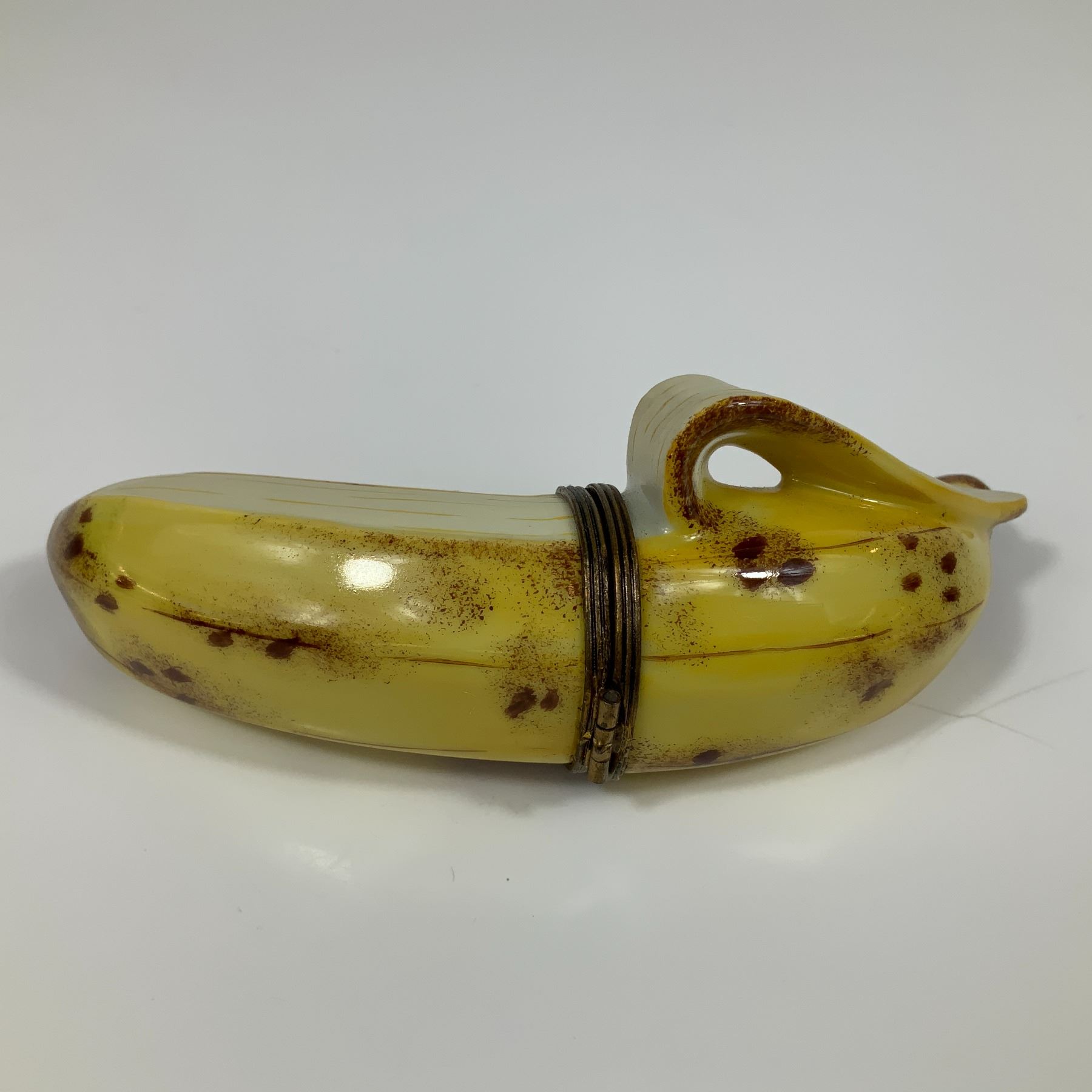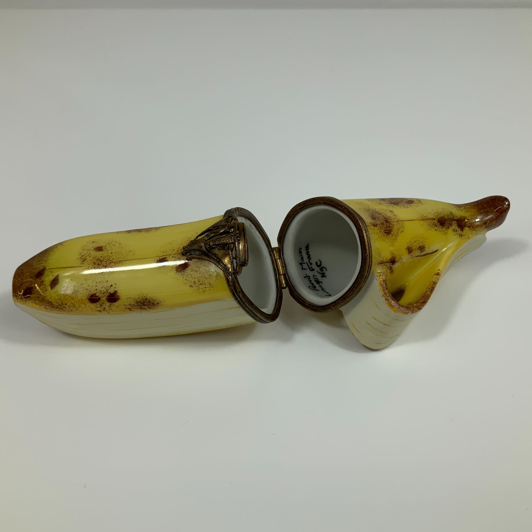 This hand-painted porcelain trinket box is naturalistically modeled in the form of a partially peeled, ripening banana. The exterior is finished with a yellow glaze accented by brown stippling and spots to mimic the appearance of fruit. One end of the form depicts a section of the peel curling back to reveal a cream-colored interior. The box is constructed in two halves joined by a metal hinge and an ornate metal clasp in the form of a bird. The interior of the box contains handwritten script in black ink that reads Peint Main, Limoges France, and the artist initials NgC.