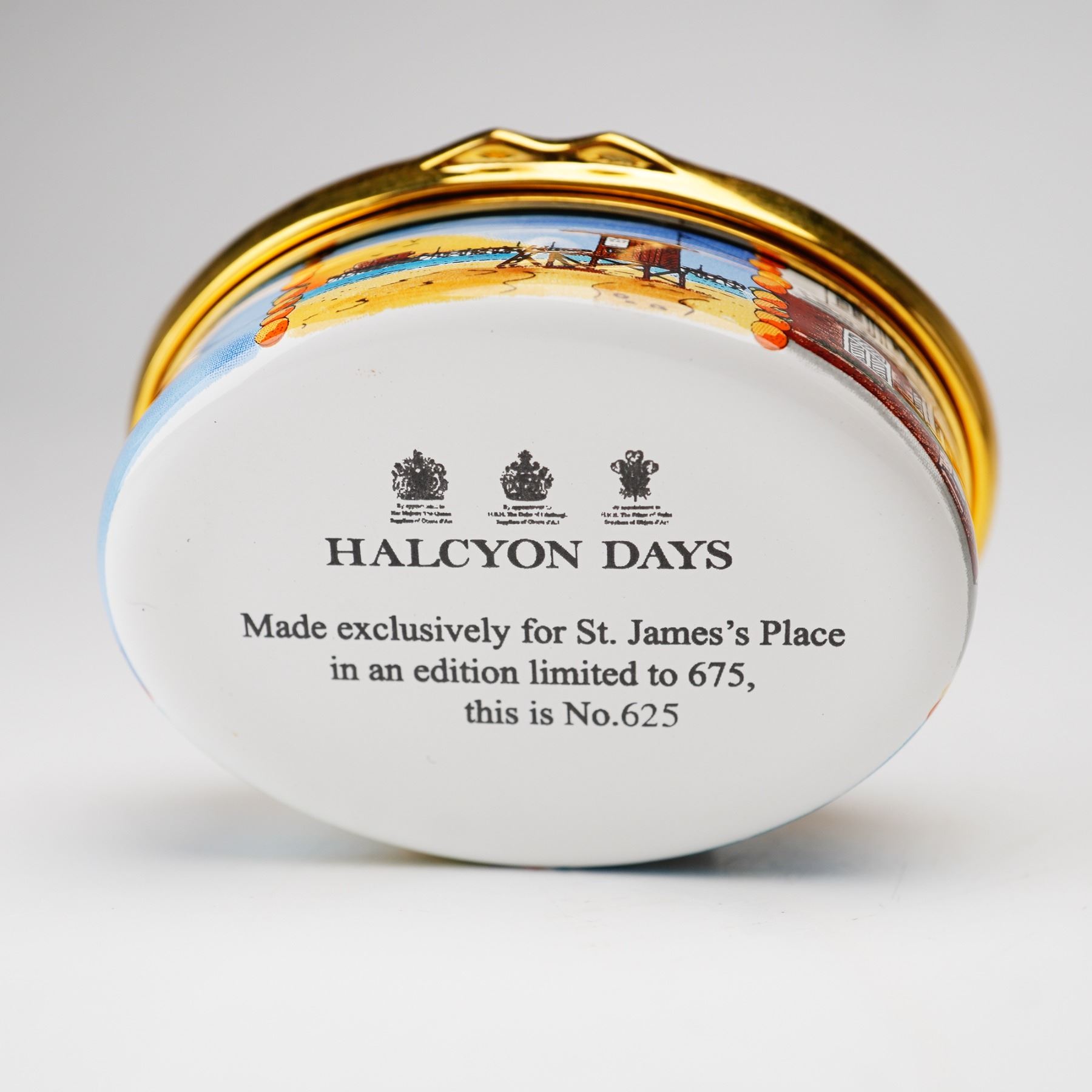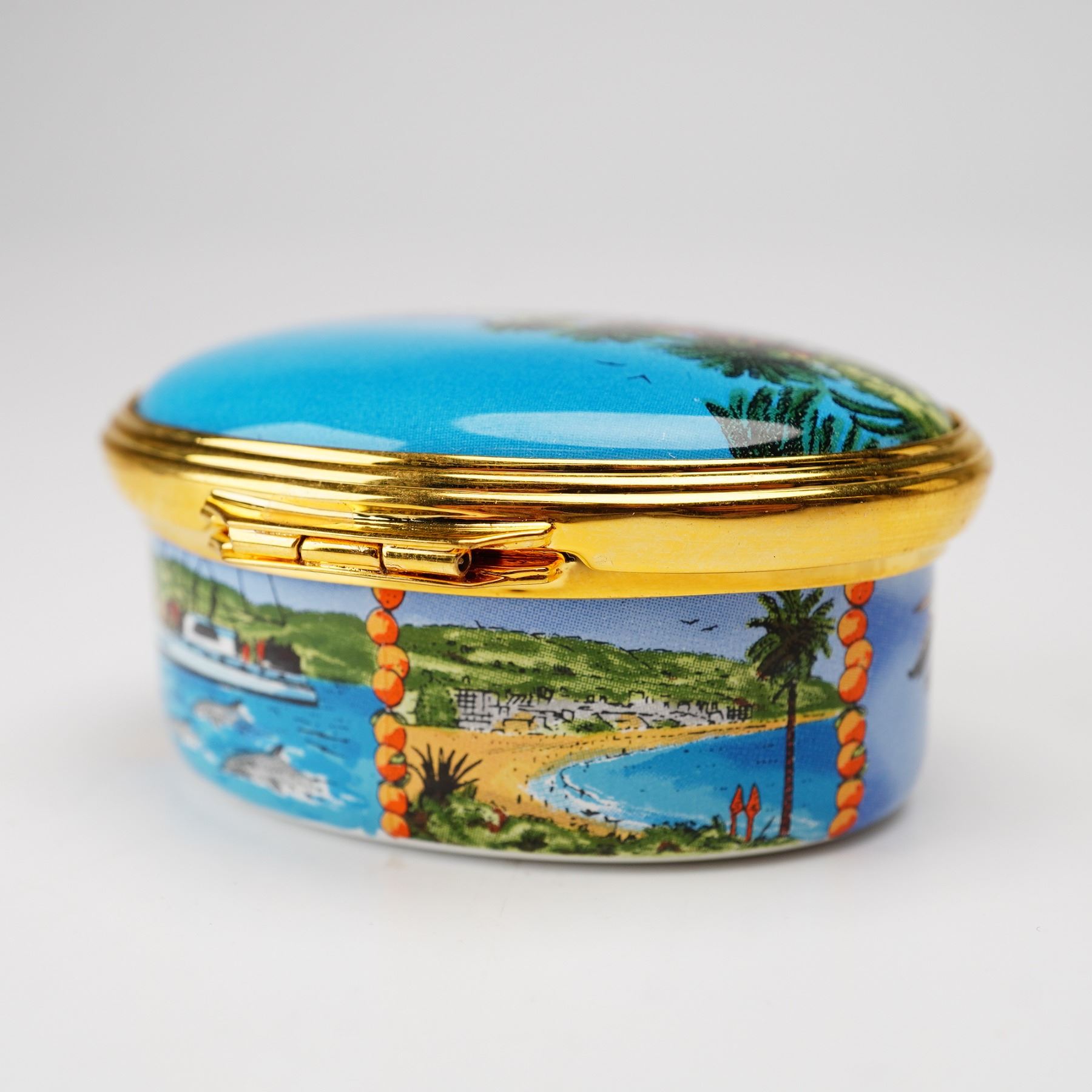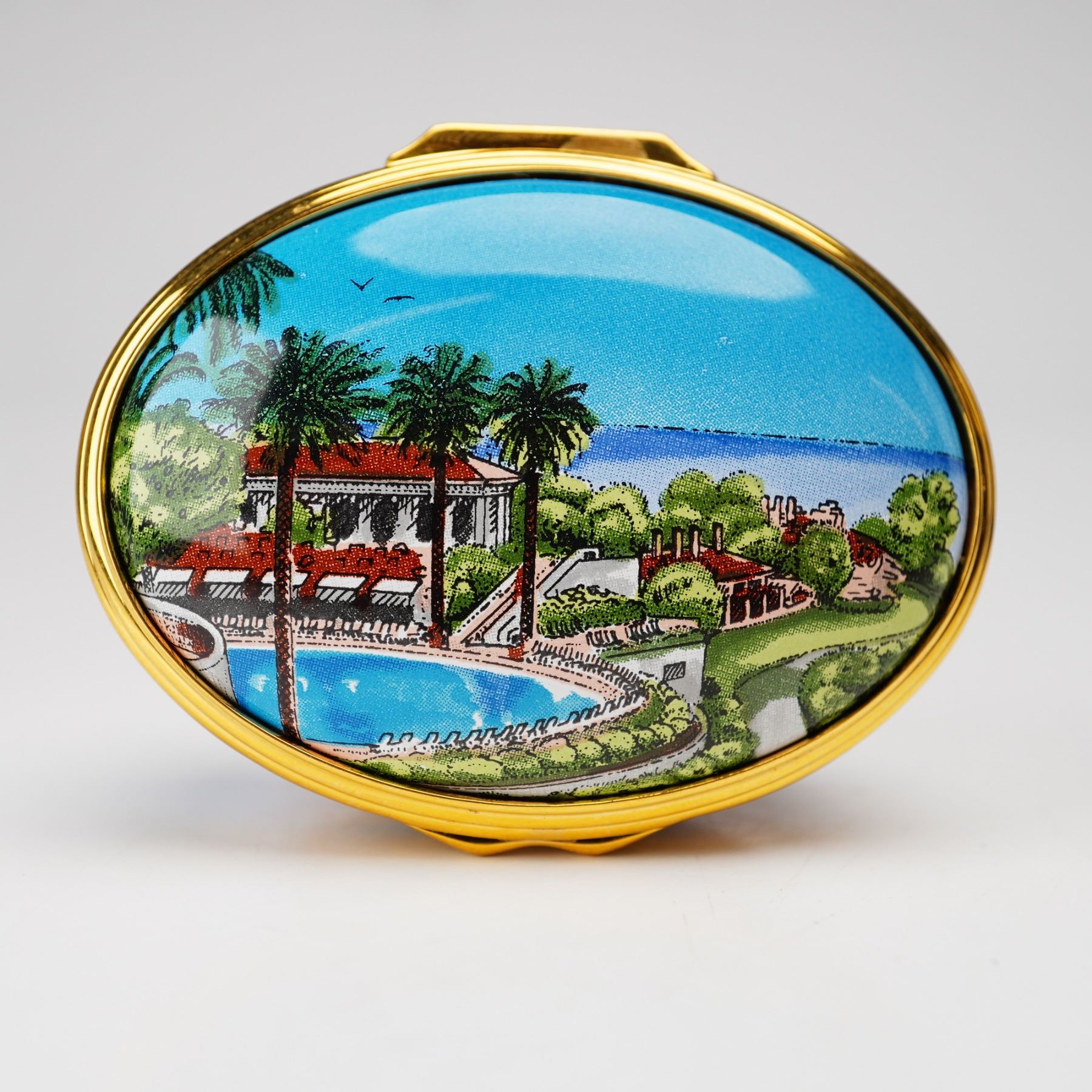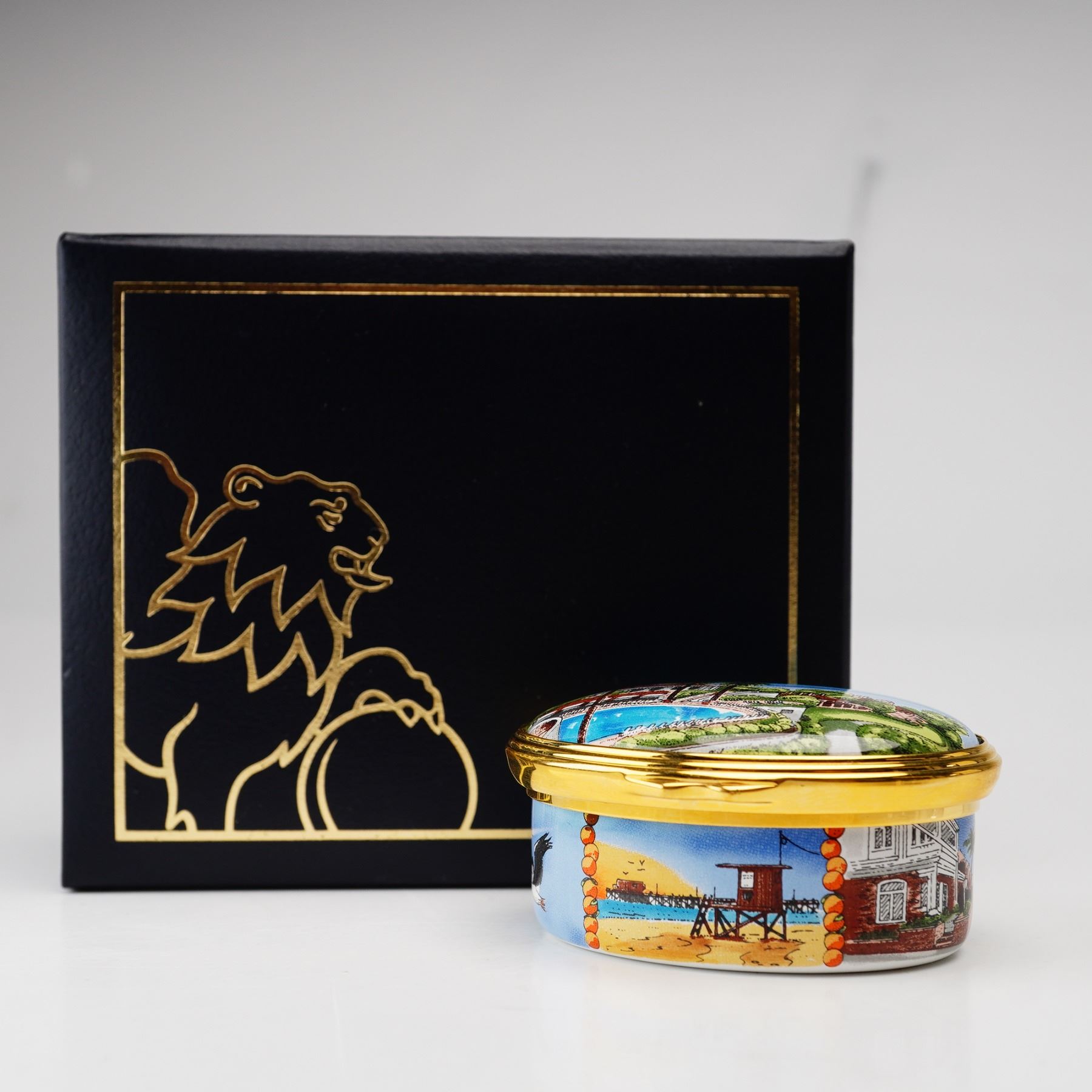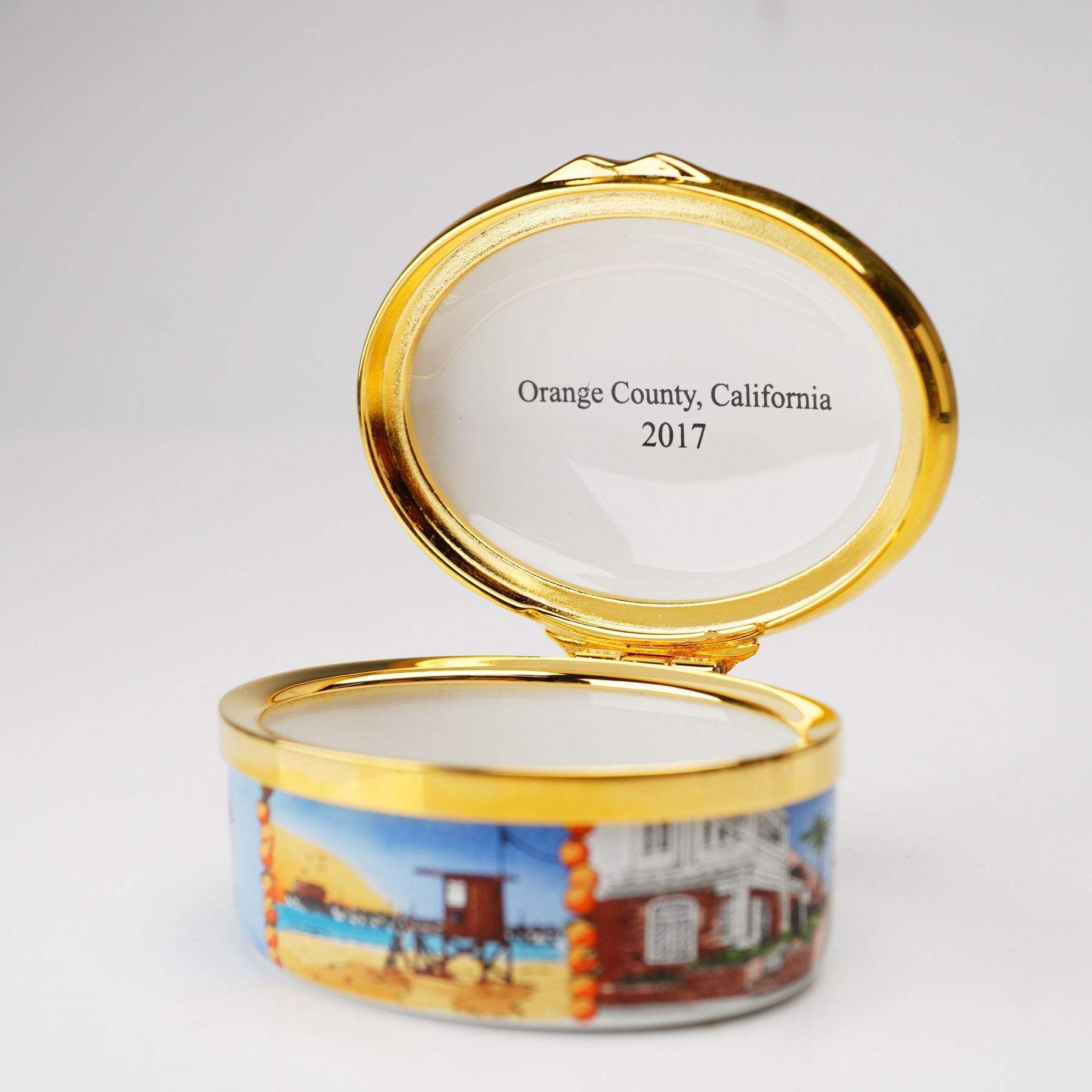 A Halcyon Days English enamel treasure box, produced as a limited edition for St. James's Place. This oval-form box is constructed of enamel on copper with polished gilded metal mounts and a hinged lid. The exterior is decorated with a wrap-around panoramic scene of Orange County, California, featuring a coastal resort, swimming pool, palm trees, a lifeguard tower, and a pier at sunset. The vignettes are bordered by vertical garlands of oranges. The interior of the lid is printed with the inscription Orange County, California 2017. The base bears the Halcyon Days manufacturer mark beneath three Royal Warrants and is inscribed: Made exclusively for St. James's Place in an edition limited to 675, this is No.625. The item includes its original black presentation box featuring a gold-line lion logo. Length: Approximately 2.5 inches.