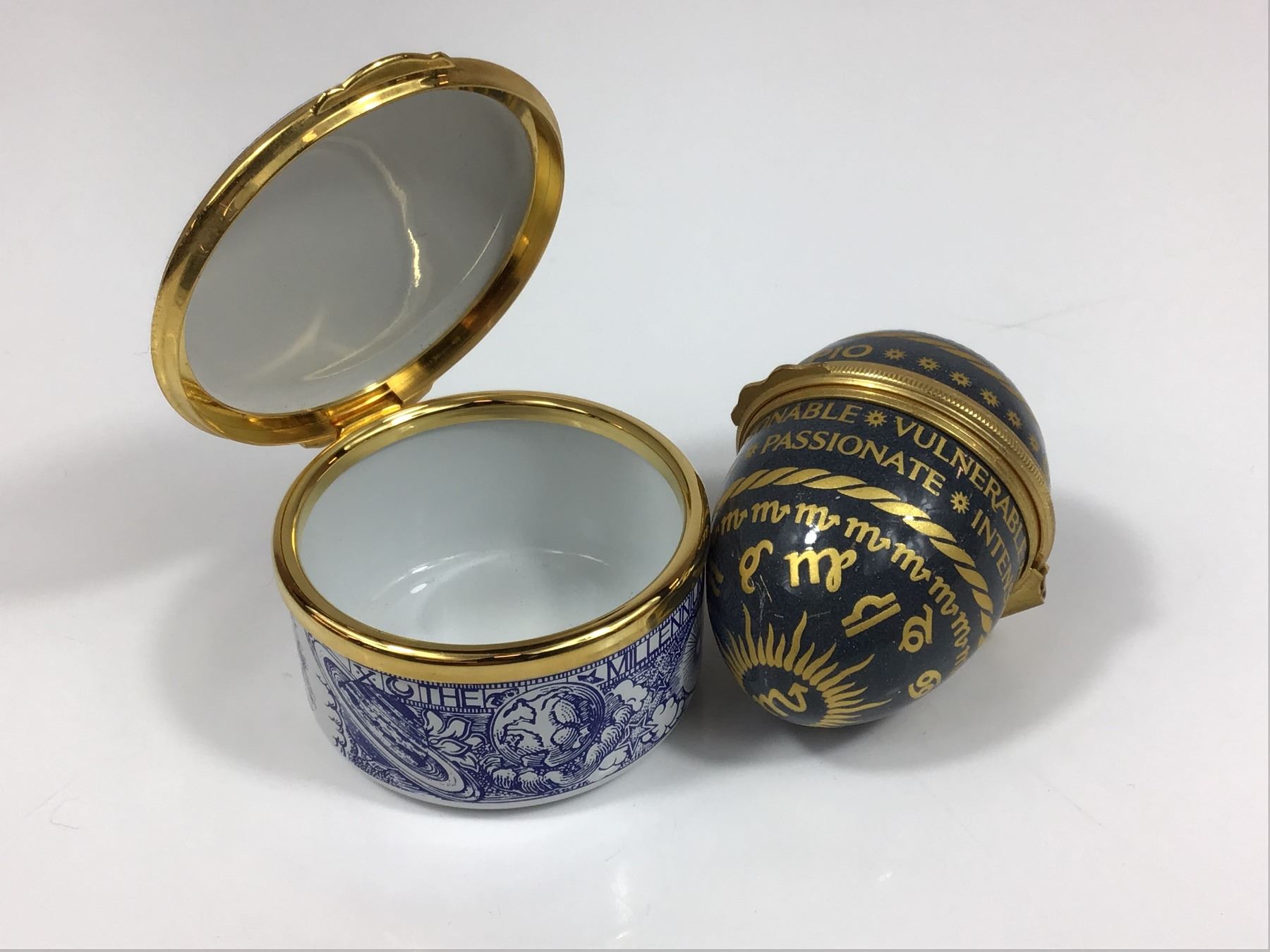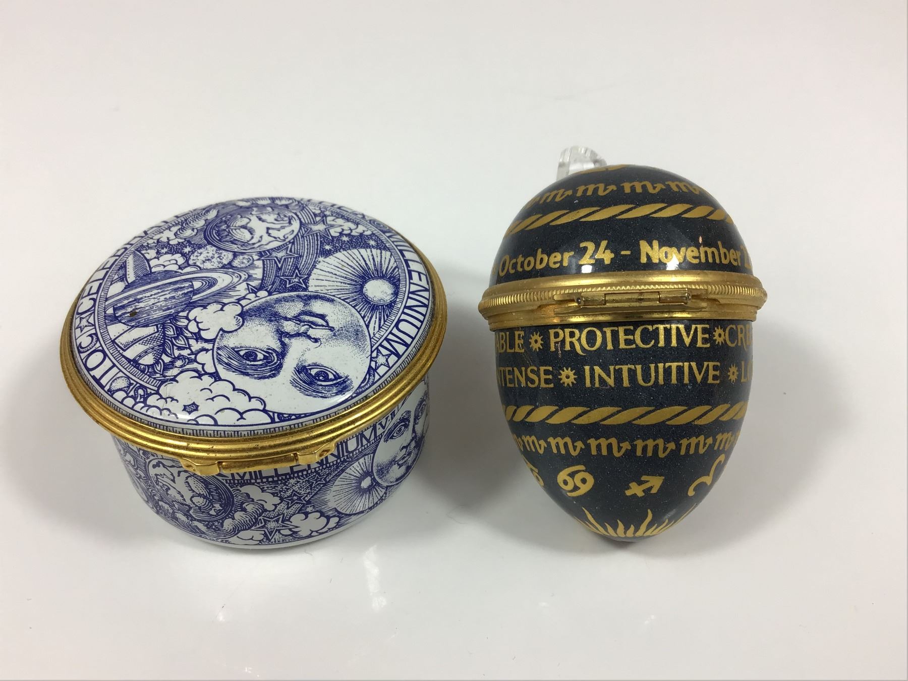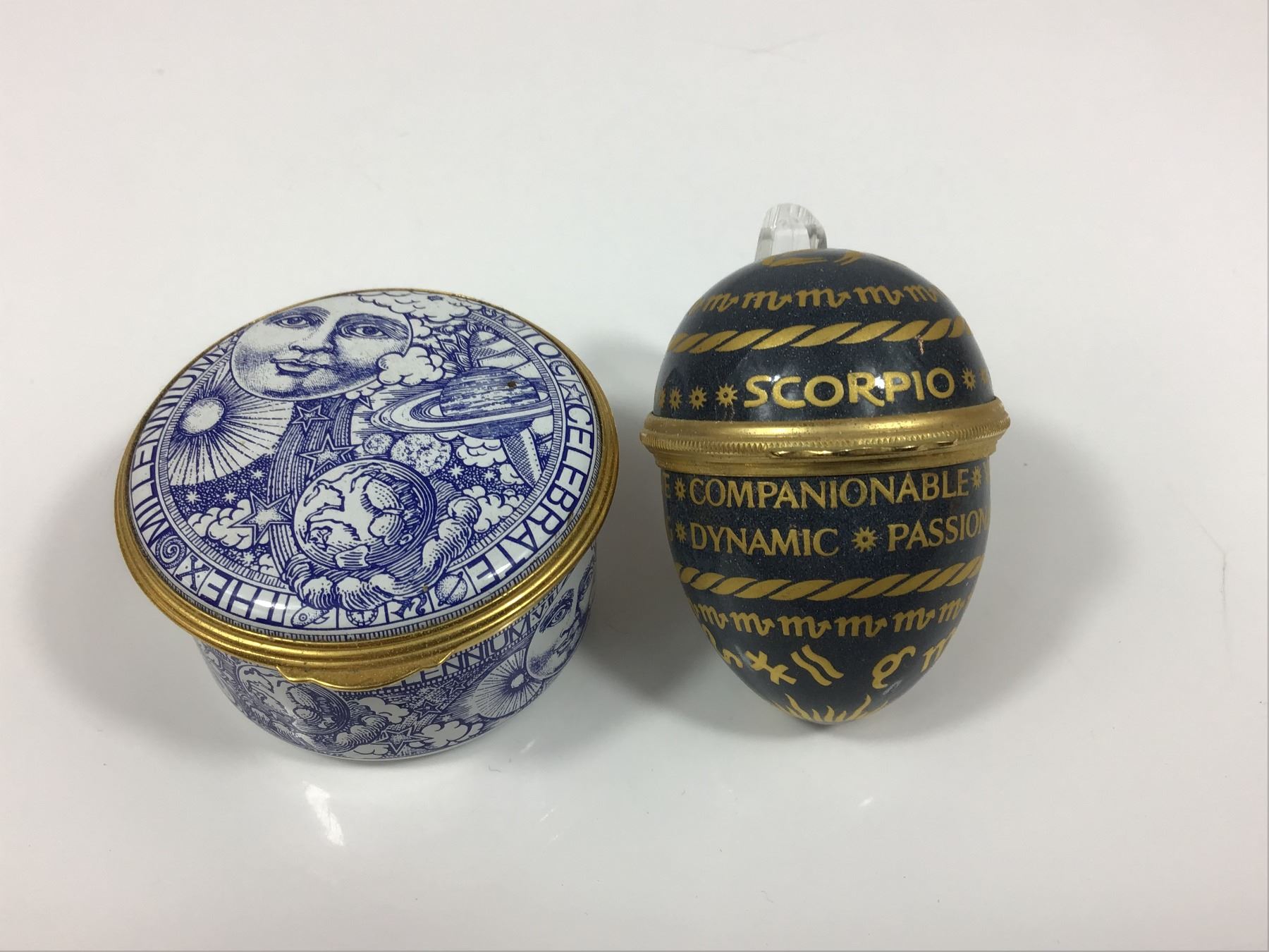 This lot features two English-made collectible hinged boxes. The first is a Spode fine bone china circular trinket box produced for the Millennium 2000 celebration with a zodiac planet theme. The exterior is decorated with blue transfer-printed celestial imagery including a personified moon, stars, and the planets Earth and Saturn. The lid border is inscribed IN CELEBRATION OF THE MILLENNIUM. The underside bears the Spode factory mark, Made in ENGLAND, and pattern number S3668-Z. The second item is a Halcyon Days enamel on copper egg-shaped box with a Scorpio zodiac theme. The navy blue exterior is decorated with gold-tone transfer text and symbols, including the sign name, the dates October 24 - November 22, and personality traits such as COMPANIONABLE, DYNAMIC, PASSIONATE, PROTECTIVE, INTENSE, VULNERABLE, and INTUITIVE. The interior lid is marked with the Halcyon Days Enamels, Bilston & Battersea Enamels, England backstamp. Both items are finished with gilded metal mounts and hinged closures. Measurement is for largest piece.