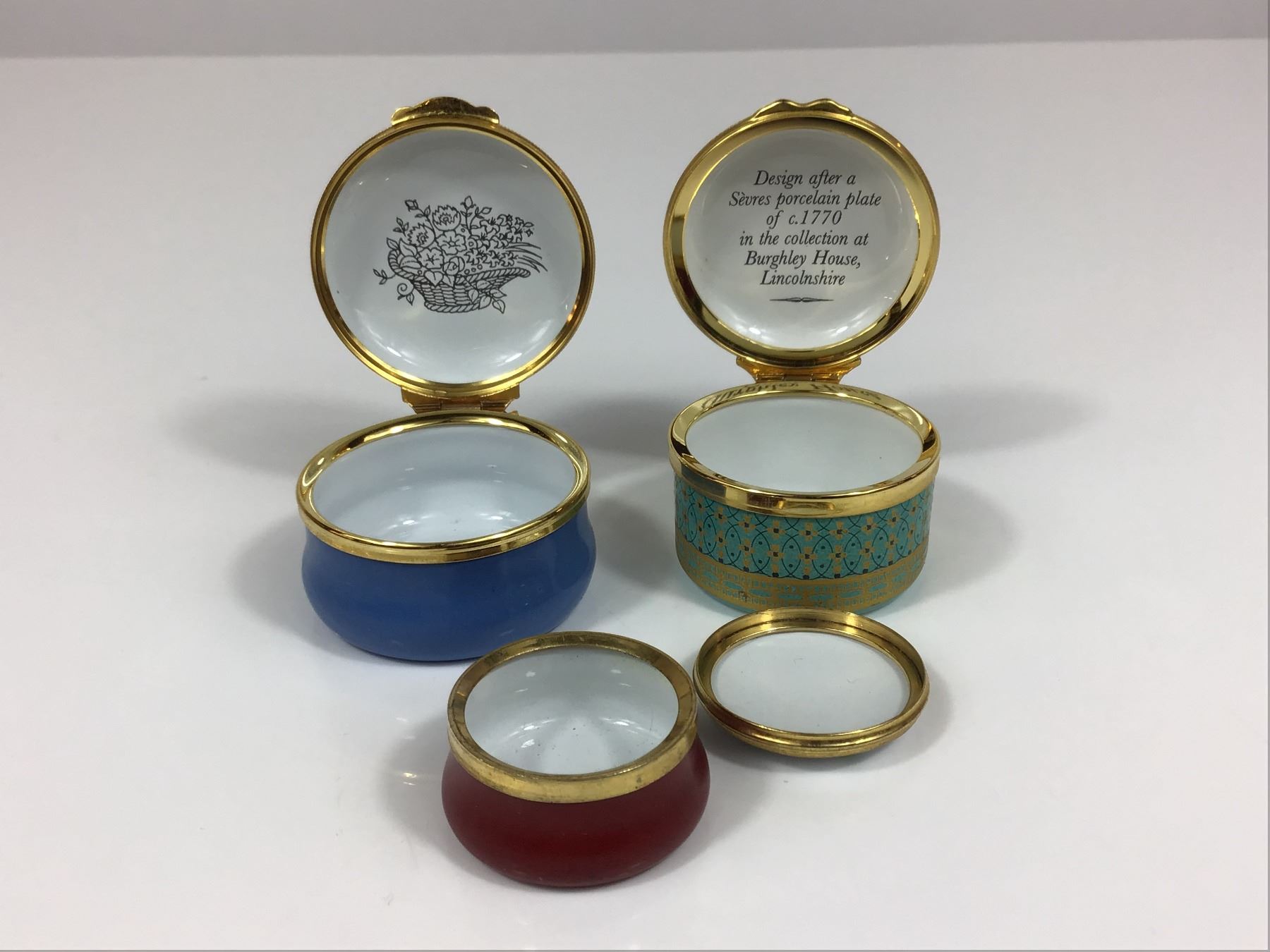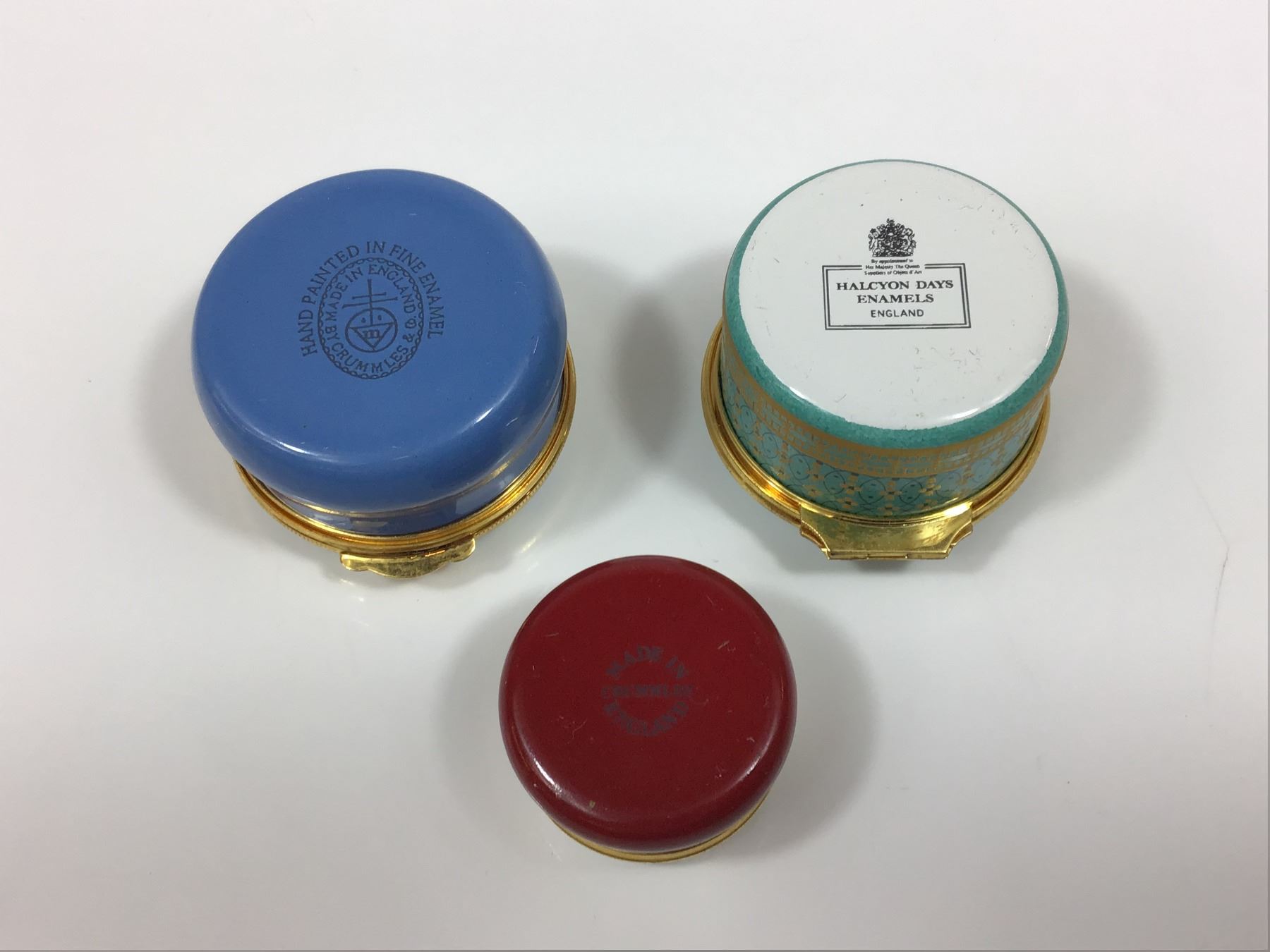 This collection consists of a set of 3 floral themed trinket boxes crafted in England using enameling on copper with gilt metal mounts. The group includes pieces from prominent makers Halcyon Days and Crummles & Co. The first item is a Halcyon Days turquoise enamel box featuring a design after a S¨vres porcelain plate of c.1770 in the collection at Burghley House, Lincolnshire. The hinged lid displays a central multi-colored floral bouquet within a medallion, set against a turquoise ground with a repeating gold and dark blue geometric trellis pattern. The technique used is transfer-printed and hand-painted enamel. The base is finished in white enamel and bears the Halcyon Days Enamels England mark with a Royal Warrant crest. The second item is a Crummles & Co. pale blue enamel box with a hinged lid. The lid is decorated with a hand-painted blue flower spray enclosed by a green leaf wreath and a looping blue ribbon with smaller floral sprigs. The interior lid features a black monochrome transfer-printed design of a flower basket. The cobalt blue base is marked: Hand Painted in Fine Enamel, Made in England by Crummles. The third item is a small Crummles & Co. red enamel box with a lift-off lid. The lid depicts a cluster of daisies with pink accents and green foliage on a white ground, with the word DAISIES inscribed below the flowers. The deep red base is marked: Made in Crummles England.