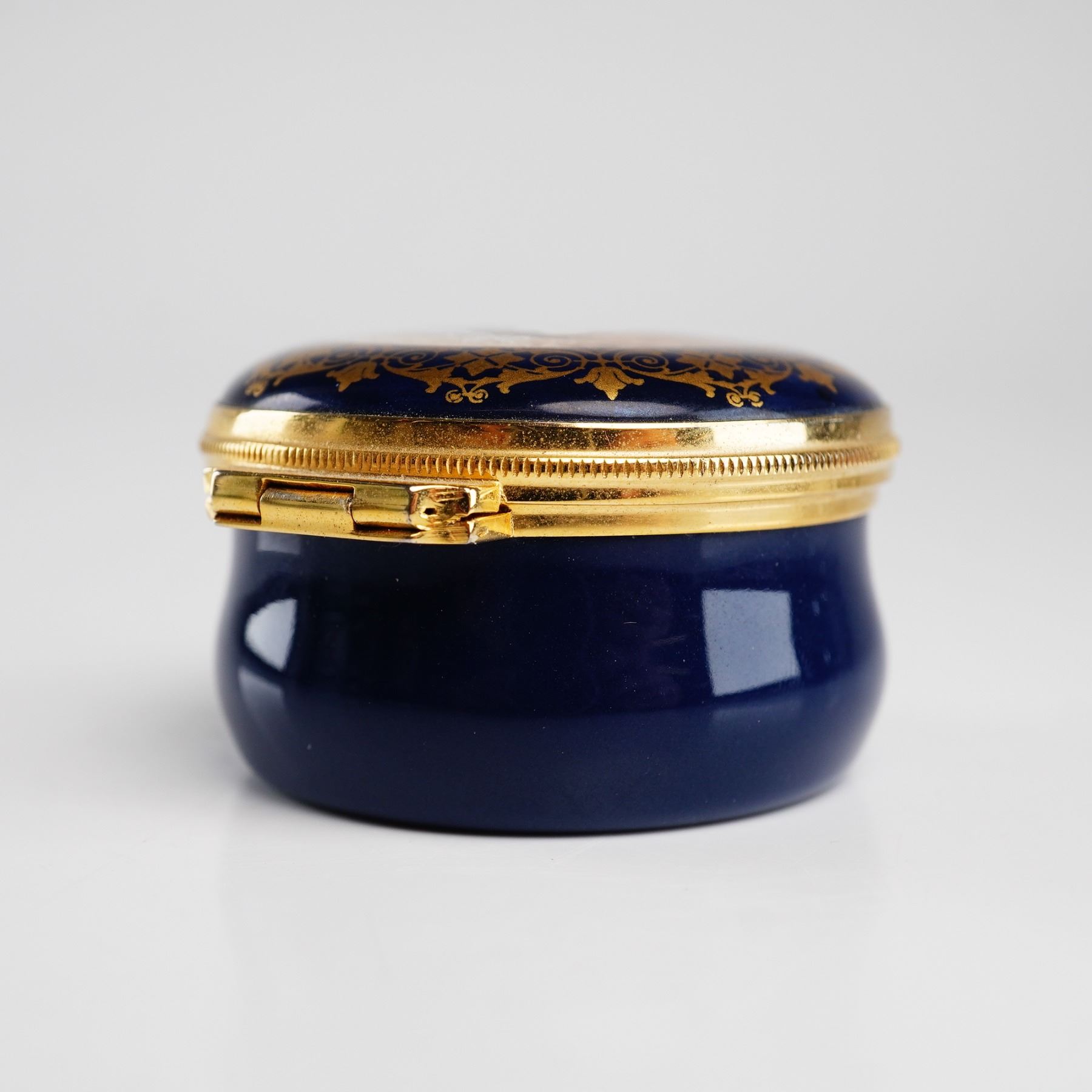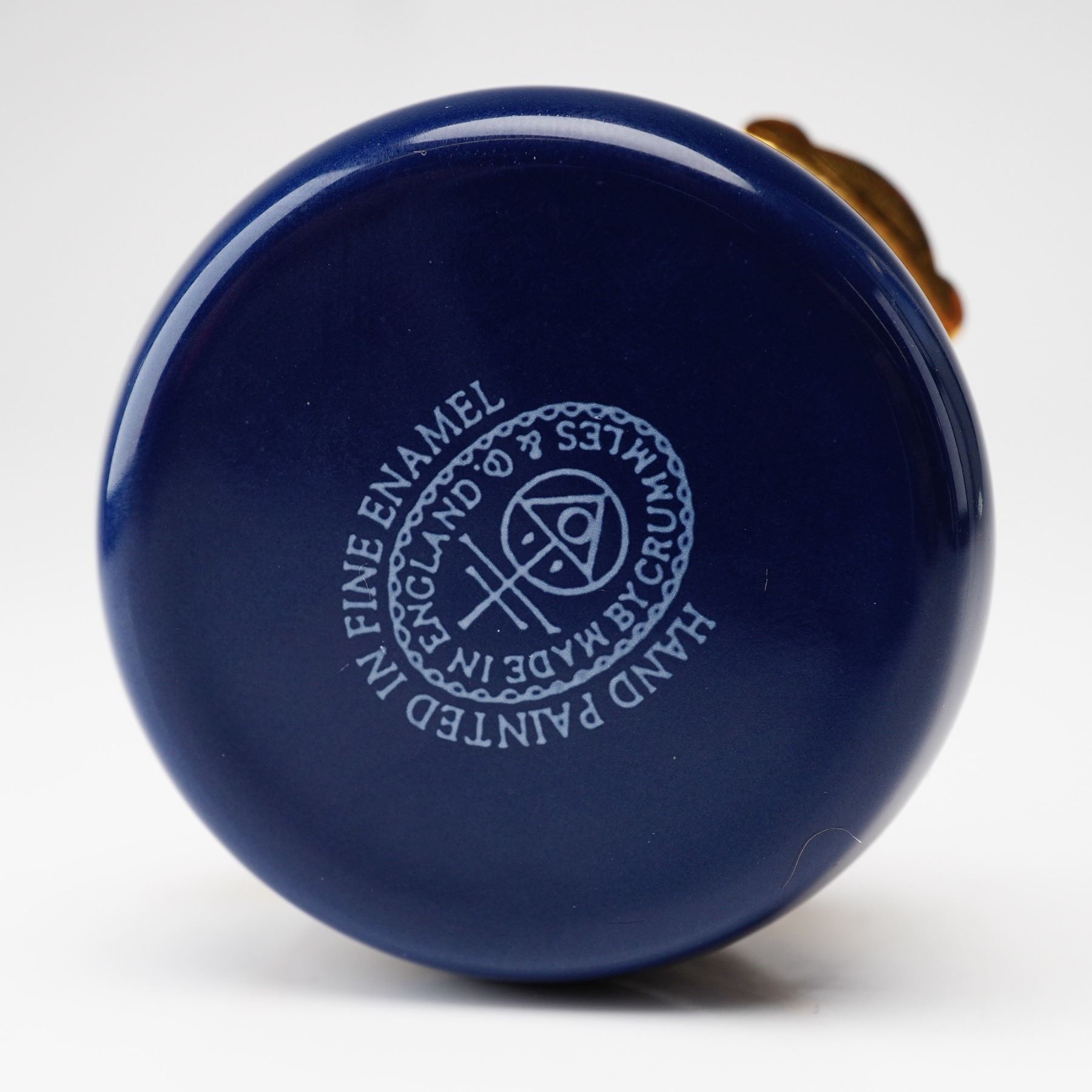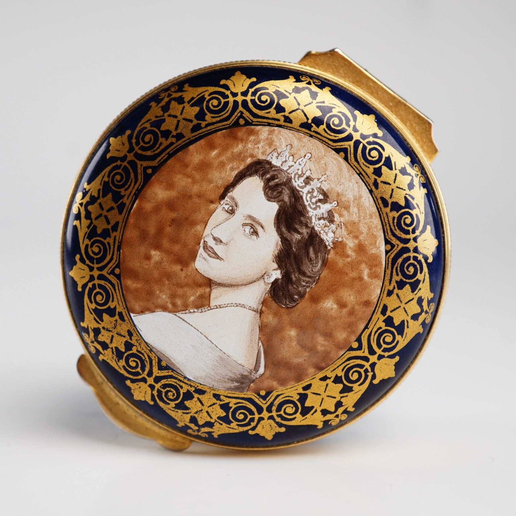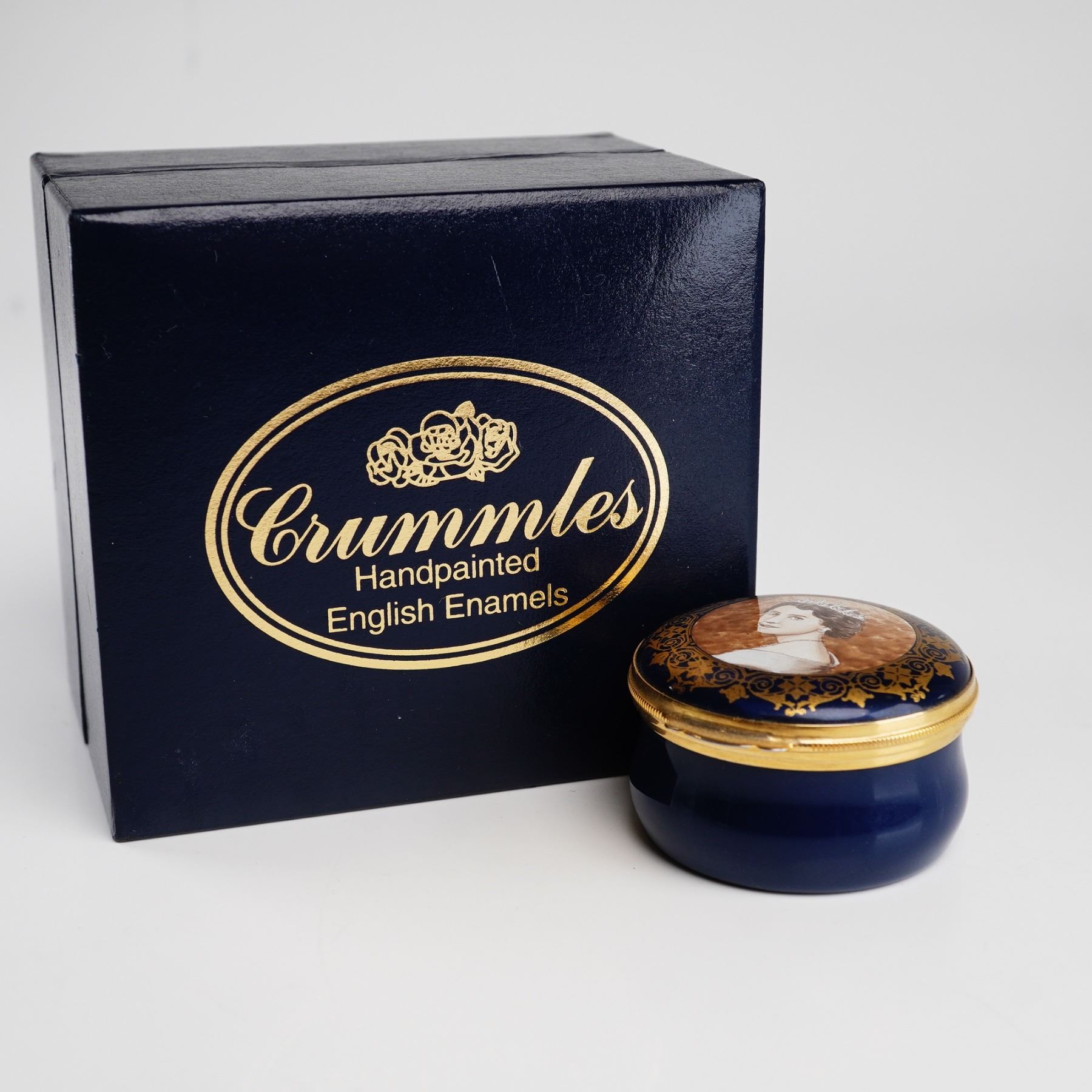 This handpainted enamel treasure box was manufactured by Crummles & Co. in England to commemorate the Jubilee of Queen Elizabeth. The circular box is crafted from enamel on copper with gold-tone metal mounts and a hinged closure. The lid displays a handpainted portrait of a young Queen Elizabeth II in profile wearing a tiara, set against a mottled brown background. The portrait is framed by a gilded foliate and scrollwork border on a cobalt blue ground. The base of the box is finished in a matching cobalt blue. The underside features a circular printed mark in light blue with the text Hand Painted in Fine Enamel and Made in England by Crummles & Co surrounding a stylized symbol. The item includes its original dark blue presentation box with gold lettering reading Crummles Handpainted English Enamels.