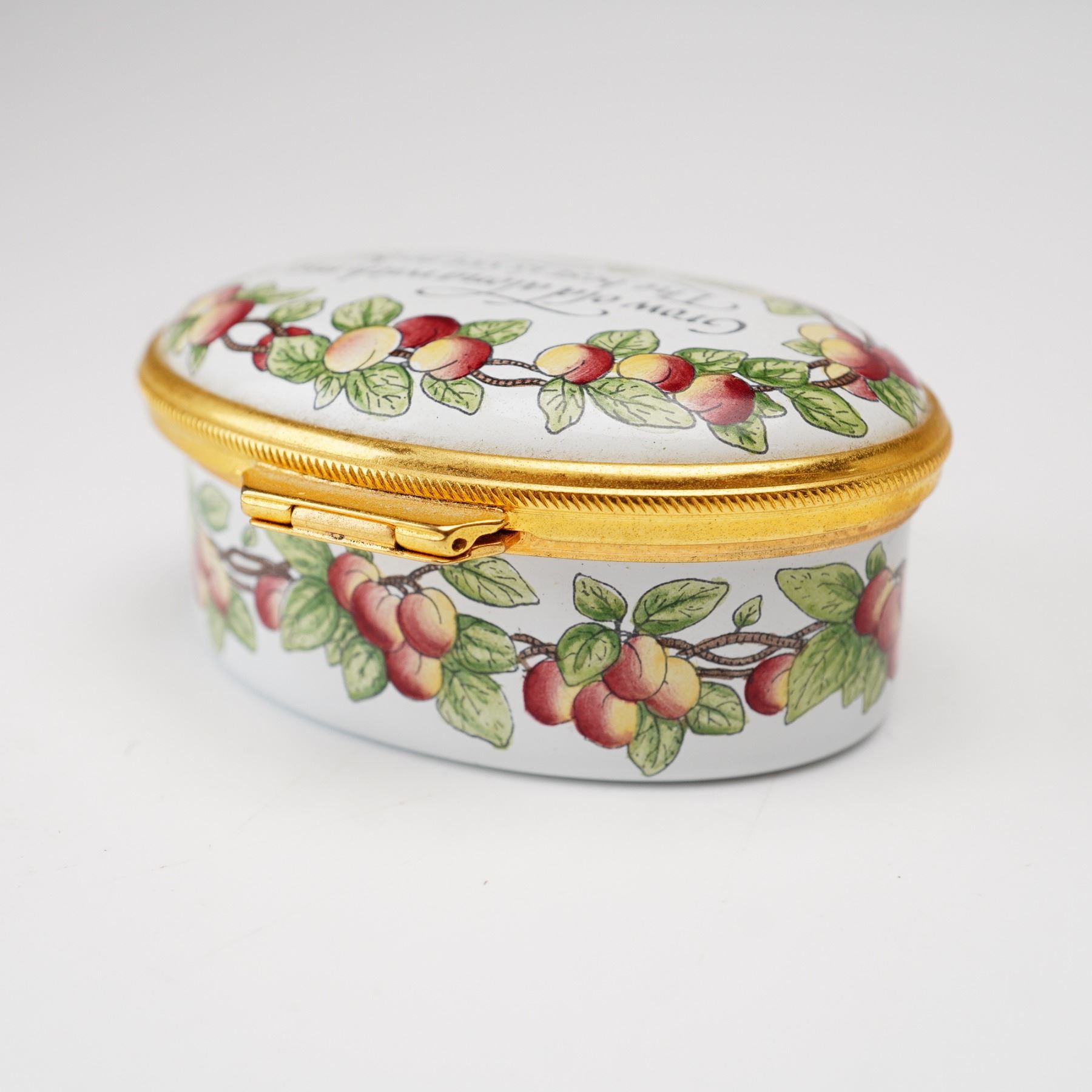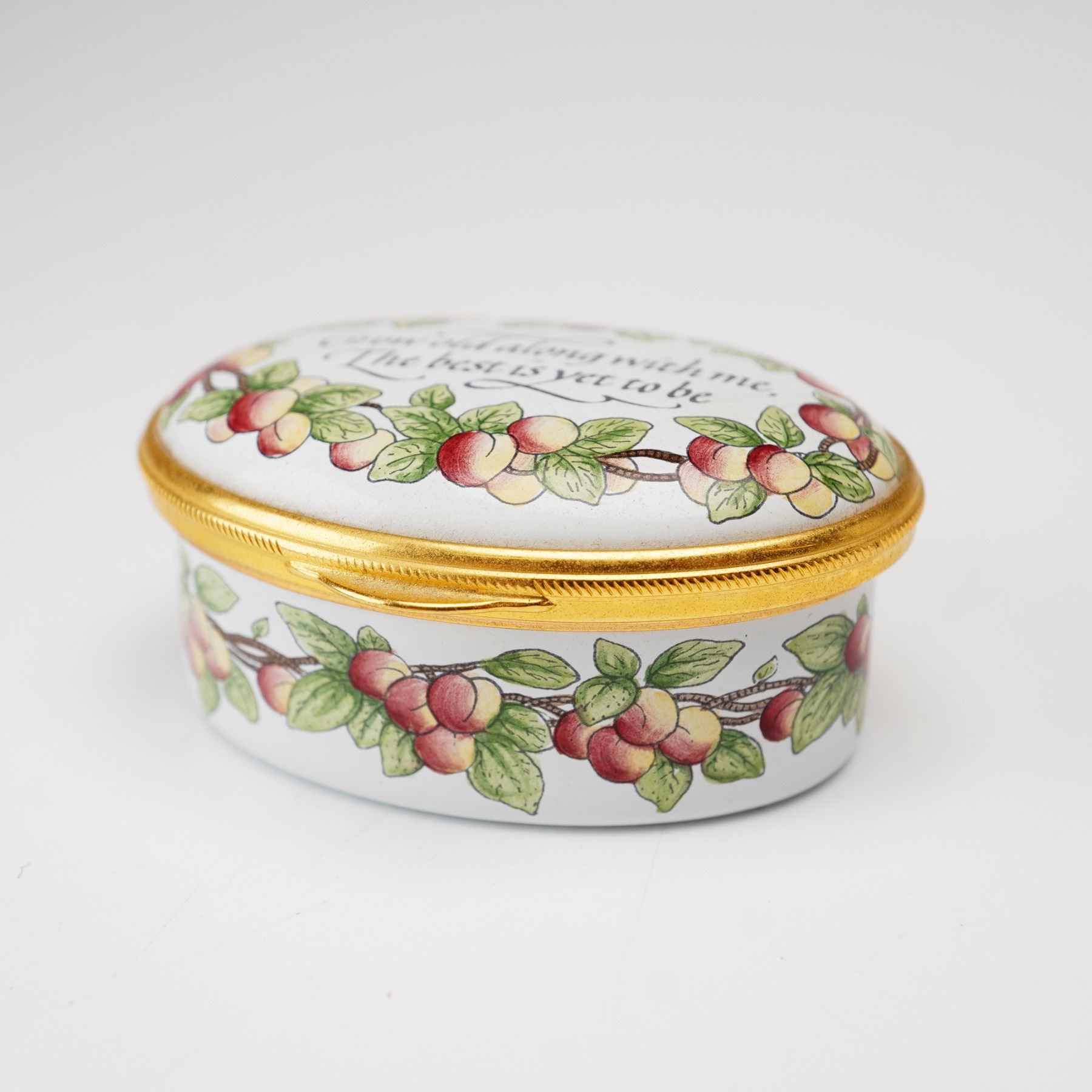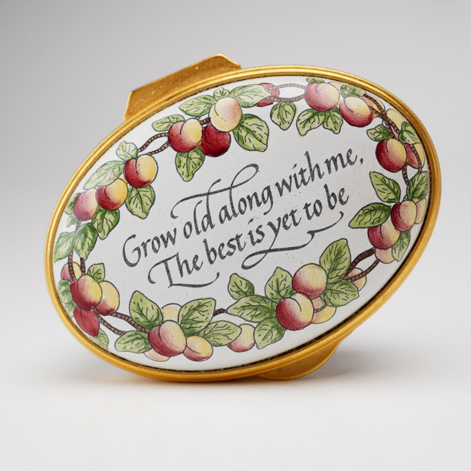 A Staffordshire Enamels enamel-on-copper hinged treasure box of oval form. The exterior is decorated with a continuous garland of peaches and green leaves encircling the body and the perimeter of the lid. The center of the lid features a calligraphic inscription of the Robert Browning quote: Grow old along with me, The best is yet to be. The interior of the lid is further embellished with a small cluster of peaches. The box is finished with a gilded metal mount and a secure hinge. The base bears the printed manufacturer's mark in black, featuring a silhouette logo of an 18th-century couple above the words STAFFORDSHIRE ENAMELS and MADE IN ENGLAND. There is also a hand-painted mark in teal green that reads EPW. This item includes the original burgundy presentation box from the Ian Marshall Collection and the manufacturer's descriptive pamphlet.