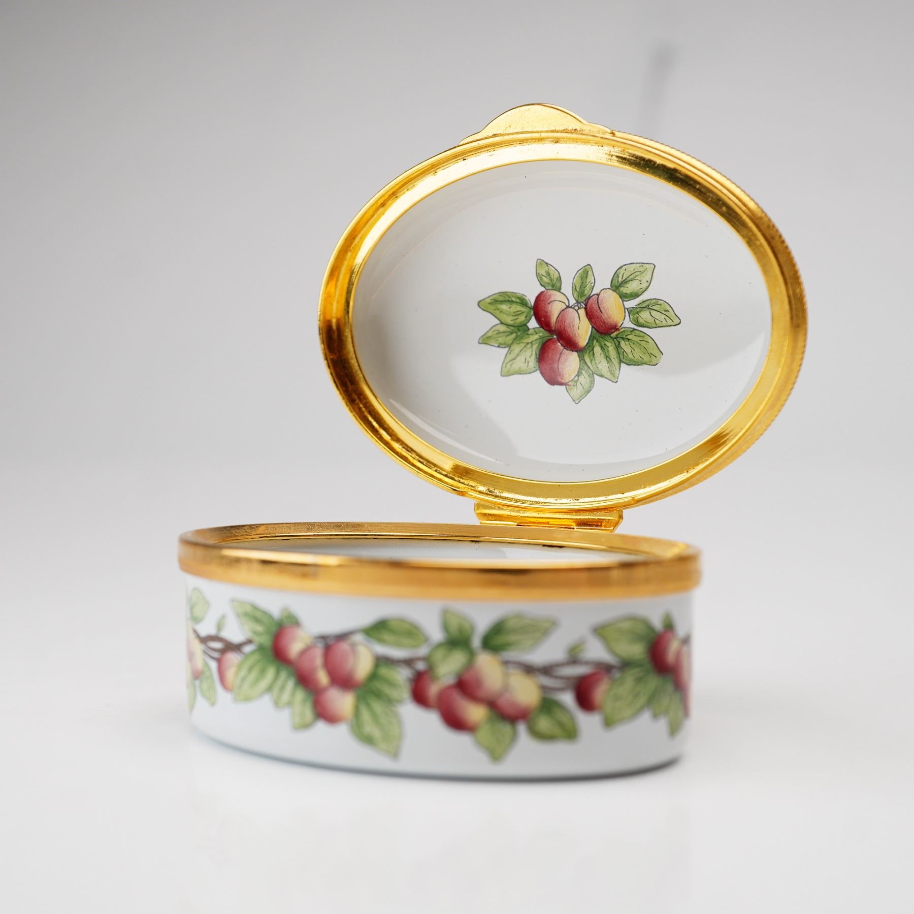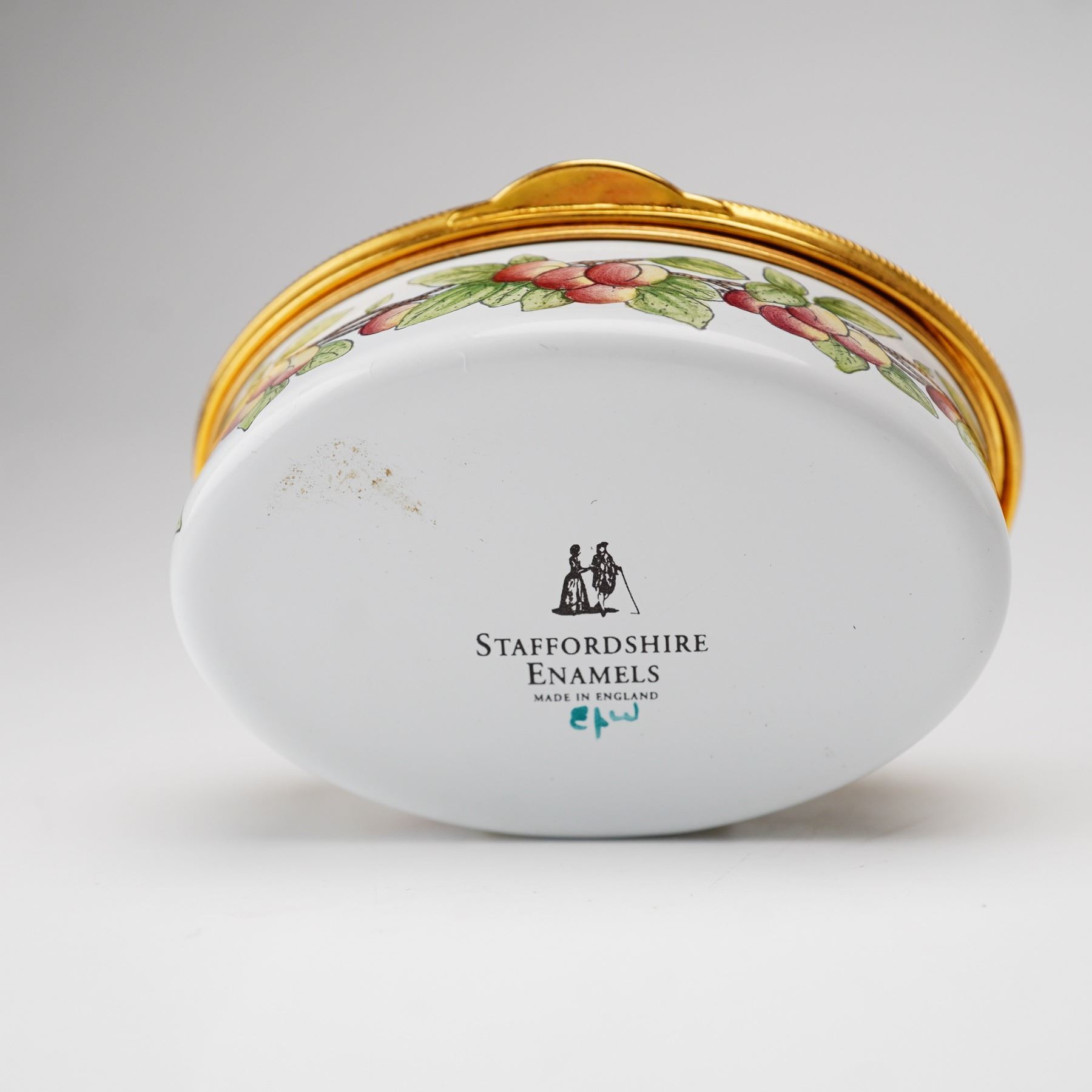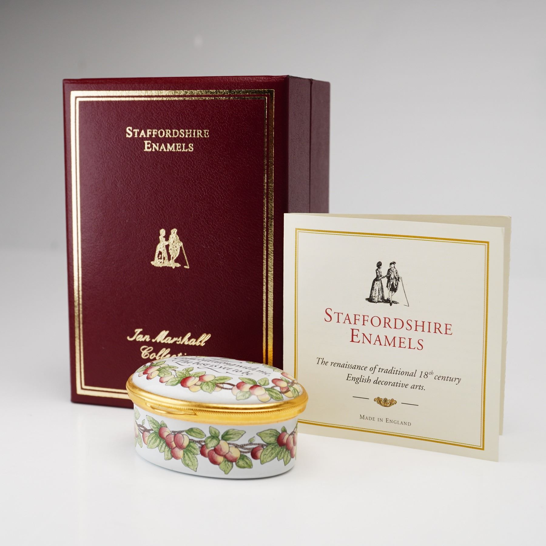 A Staffordshire Enamels enamel-on-copper hinged treasure box of oval form. The exterior is decorated with a continuous garland of peaches and green leaves encircling the body and the perimeter of the lid. The center of the lid features a calligraphic inscription of the Robert Browning quote: Grow old along with me, The best is yet to be. The interior of the lid is further embellished with a small cluster of peaches. The box is finished with a gilded metal mount and a secure hinge. The base bears the printed manufacturer's mark in black, featuring a silhouette logo of an 18th-century couple above the words STAFFORDSHIRE ENAMELS and MADE IN ENGLAND. There is also a hand-painted mark in teal green that reads EPW. This item includes the original burgundy presentation box from the Ian Marshall Collection and the manufacturer's descriptive pamphlet.